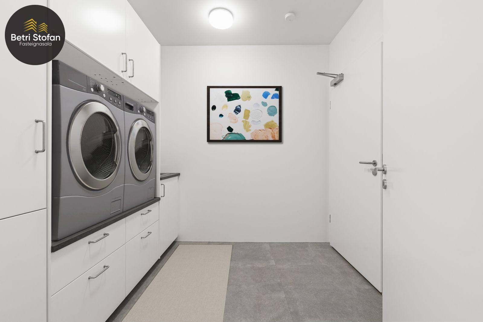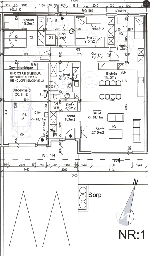 Þvottahús: Innrétting með skápum og skúffum, innbyggðum skolvask og aðstöðu fyrir þvottavél og þurrkara í vinnushæð. Inngengt í bílskúr úr þvottahúsi. Flísar á gólfi