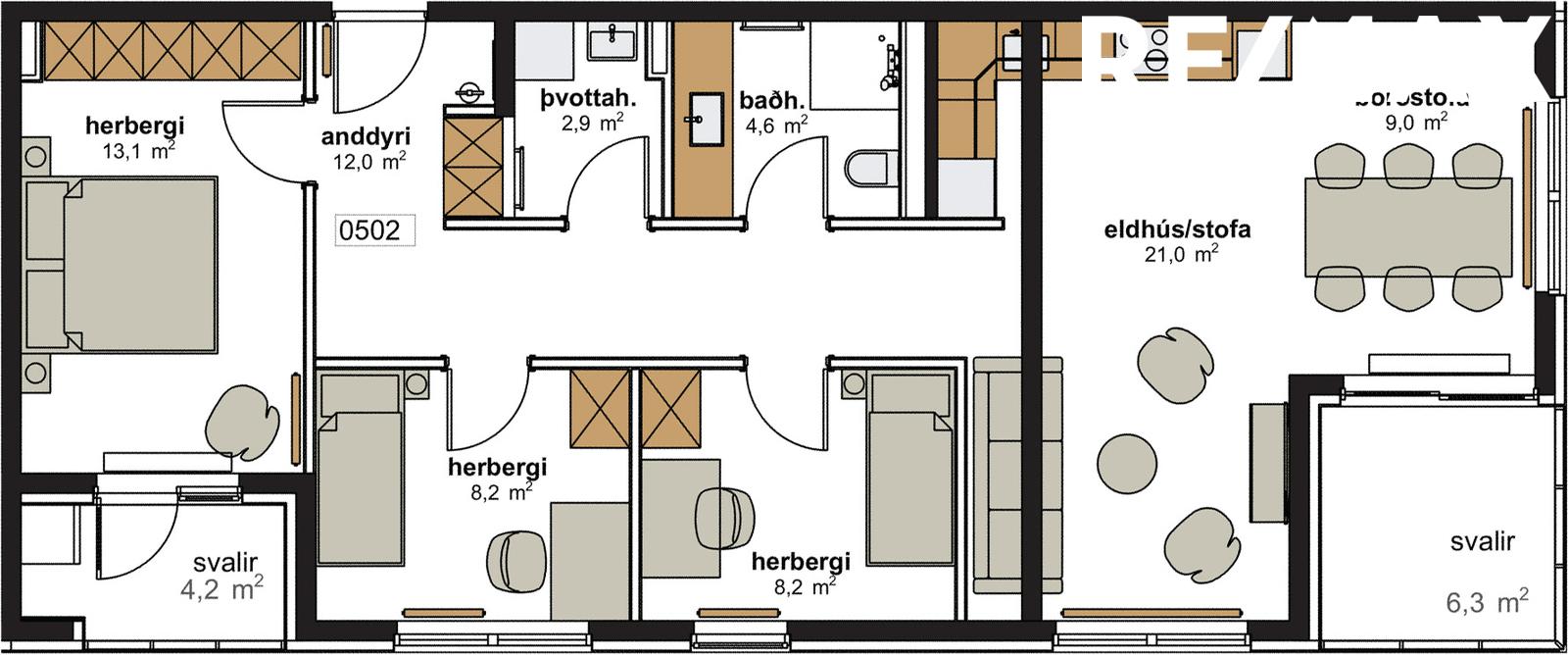 Bókið skoðun hjá Guðrúnu í síma 820-0490 eða með tölvupósti á netfangið gudrun@remax.is eða á Gumma Júl í síma 858-7410 eða með tölvupósti á netfangið gj@remax.is Frekari upplýsingar um eignirnar:Gólf íbúða eru fleytt og tilbúin fyrir endanlegt gólfefni, nema í baðherbergi og í þvottahúsi en þar eru flísar á gólfum. Einnig eru flísar á veggjum baðherbergja, flísar eru frá Parka. Fataskápar í herbergjum og forstofu eru af vandaðri gerð frá Axis. Borðplötur eru í eldhúsi, baði og þvottahúsi þar sem við á og eru frá Axis.
