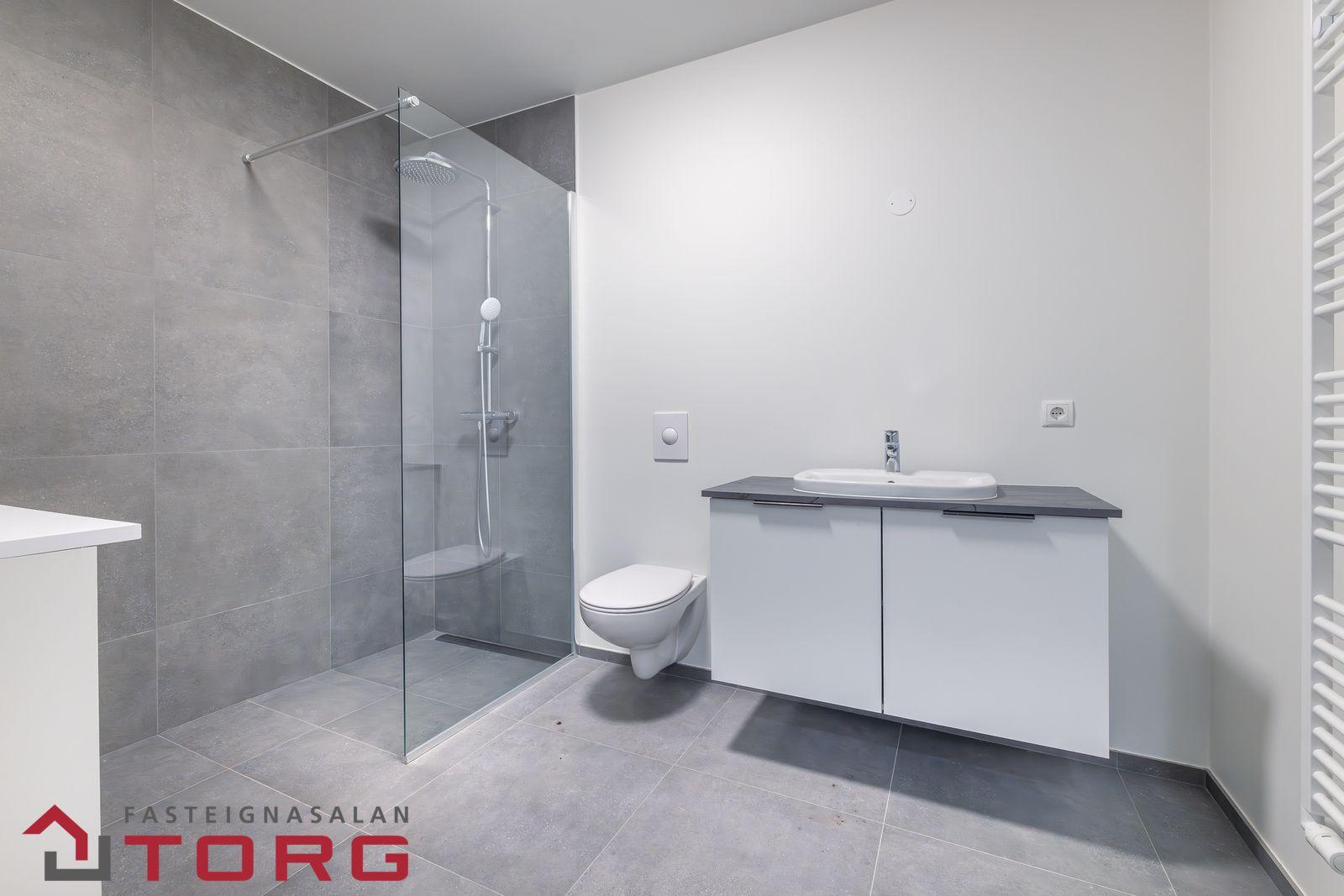 Gólf baðherbergis og hluti veggja á baðherbergi eru flísalagðir á 2 eða 3 veggi, upp að 2,1m. Öll salerni eru upphengd og innbyggð í vegg. Á baði er handklæðaofn. Sturta er í öllum íbúðum og sturtubotn flísalagður.