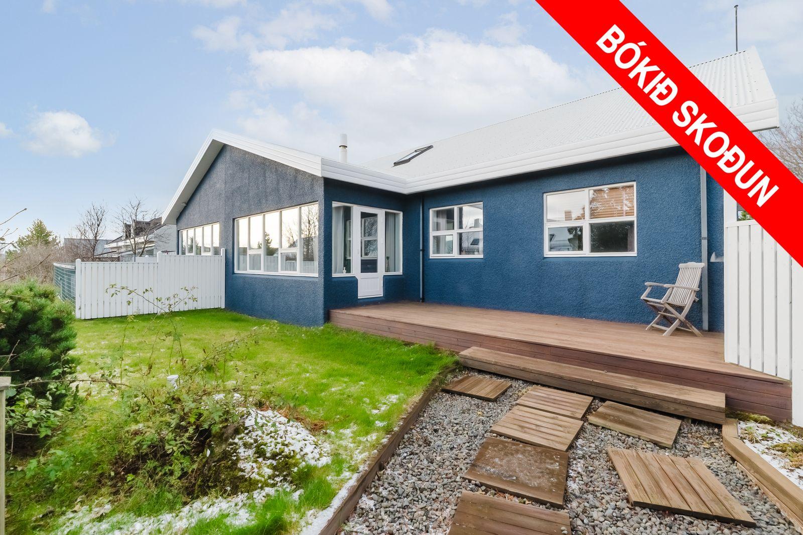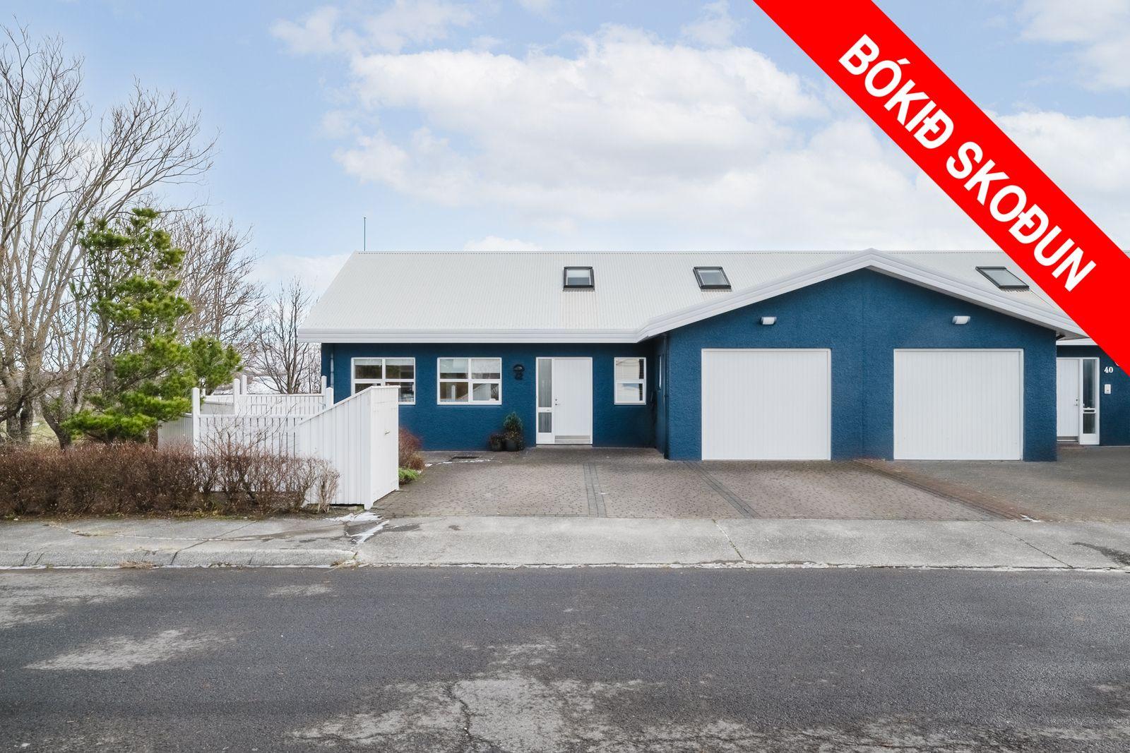 Lýsing eignar: Aðkoma:Húsið er innarlega í rólegum botnlanga. Fyrir framan húsið má með góðu móti leggja þremur bílum. Einnig rúmgott svæði fyrir setuaðstöðu fyrir framan hús. Forstofa: Flísalögð forstofa með fallegum dökkum náttúru steinflísum og góðu skápaplássi. Þvottahús: Innaf forstofu er gengið inn í þvottahús. Þar er stæði fyrir þvottavél og þurrkara. Fínt vinnupláss og góð innrétting. Opnanlegur gluggi. Flísar á gólfi. Eldhús:Mjög vönduð innrétting. Mikið skápa og borðpláss. Granítplötur á borðum. Innfelld uppþottavél og ísskápur ásamt bakaraofni í vinnuhæð. Borðkrókur er í eldhúsinu. Háfur yfir eyju. Stórir gluggar og flísar á gólfi. Baðherbergi:Innrétting með ágætis geymsluplássi. Granítplata á borði. Baðkar og sér sturtuklefi. Handklæðaofn og upphengt salerni. Flísar á gólfi og opnanlegur gluggi. Stofa/borðstofa: Alrýmið er einstaklega fallegt með mjög mikilli lofthæð. Á gólfum er parket og náttúru steinflísar á gólfi. Arinn með íslensku grágrýti í eldhólfi og á syllu. Stórir gluggar á alrýminu gefa fallega sýn. Útgengt frá stofu út á verönd/garð. Svefnherbergi I:Á neðri hæðinni er hjónaherbergið. Það er parketlagt með góðum fataskáp. Svefnherbergi II:Búið er að breyta alrýminu og nýtist þetta svefnherbergi sem hluti af alrýminu í dag. Þessu rými væri hægt að breyta aftur í svefnherbergi. Svefnherbergi III: Þetta herbergi er á efri hæðinni. Rúmgott herbergi. Parket á gólfi. Mikið útsýni til norðurs. Í herberginu er gott geymslurými undir súð sem er lokað af. Efri hæð:Nýtist í dag sem sjónvarpsrými, vinnuaðstaða og svefnherbergi. Undir súð er gott geymslurými. Bílskúr:Mjög snyrtilegur. Heitt og kalt vatn. Opnanlegur gluggi. Rafmagnsopnari á bílskúrshurð. Gott geymsluloft.