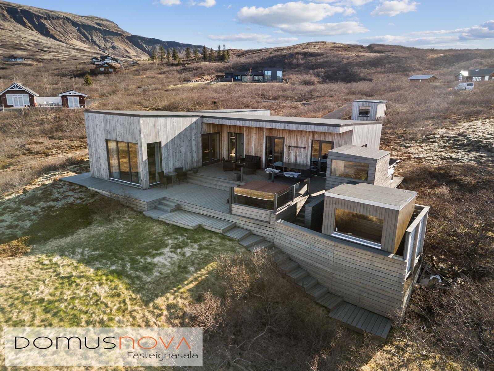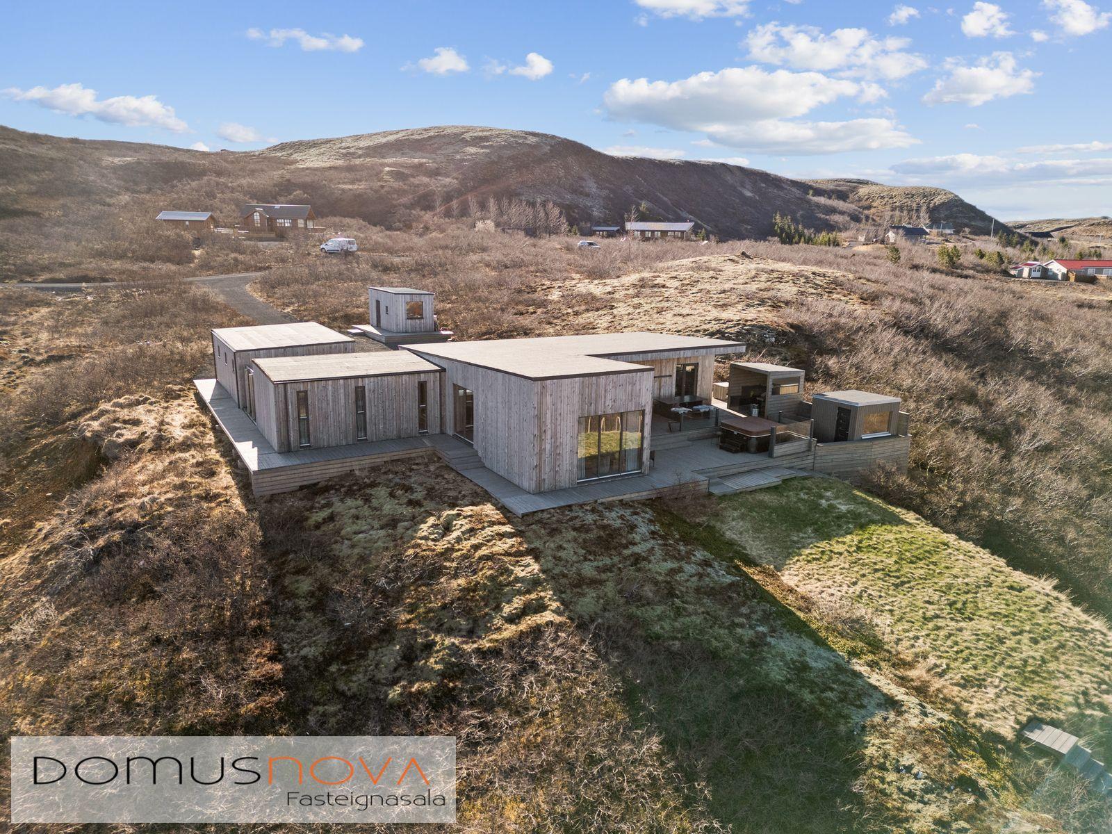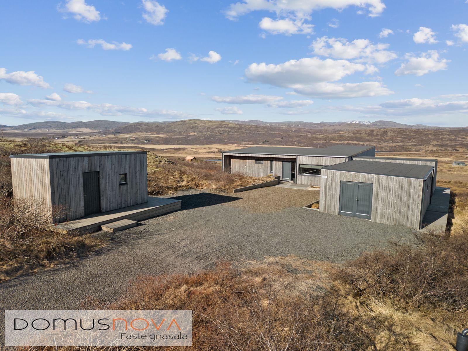 Um er að ræða aðalhús, gestahús, stóra verönd með heitum potti, saunahús, geymsluskúr, stórt bílastæði.