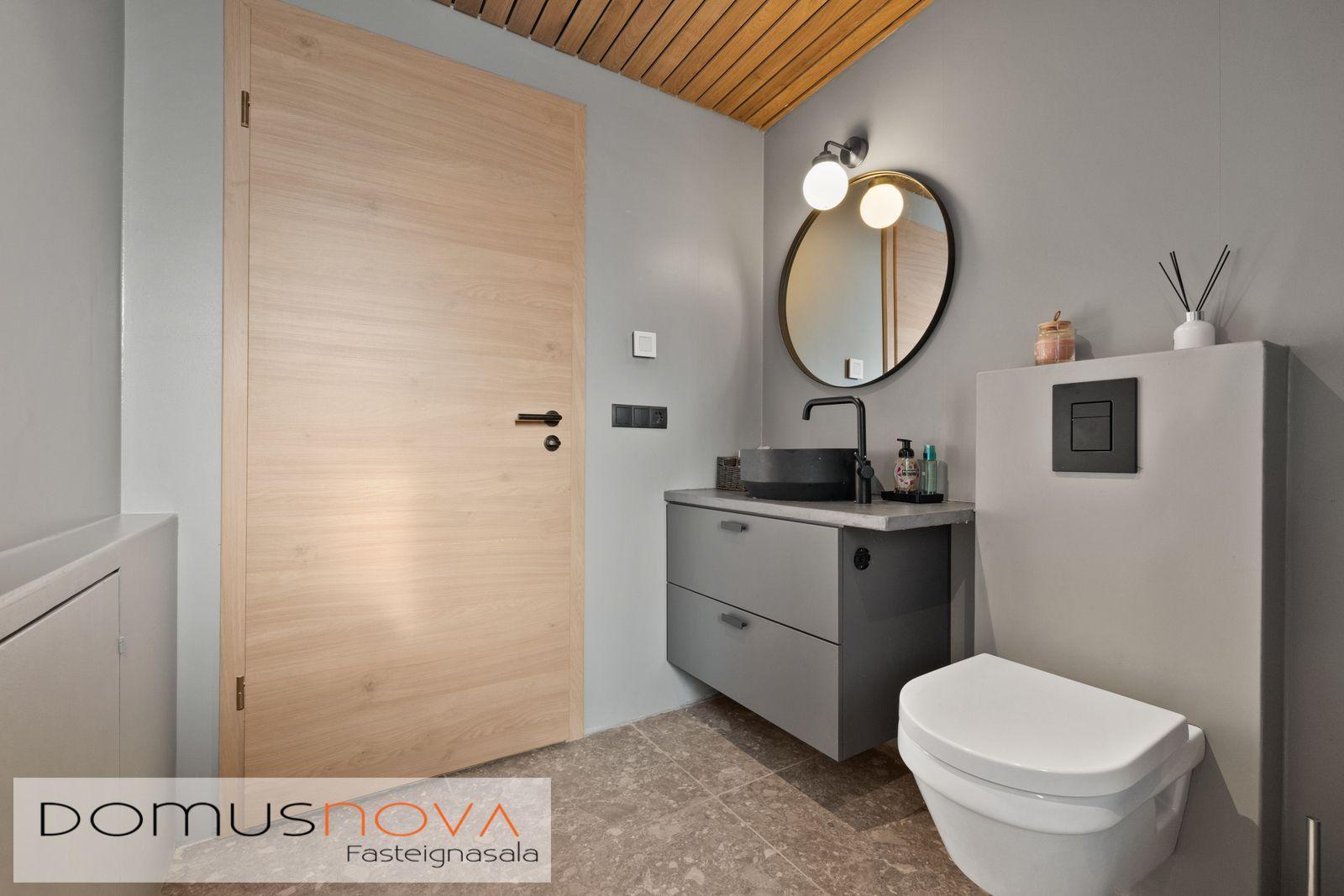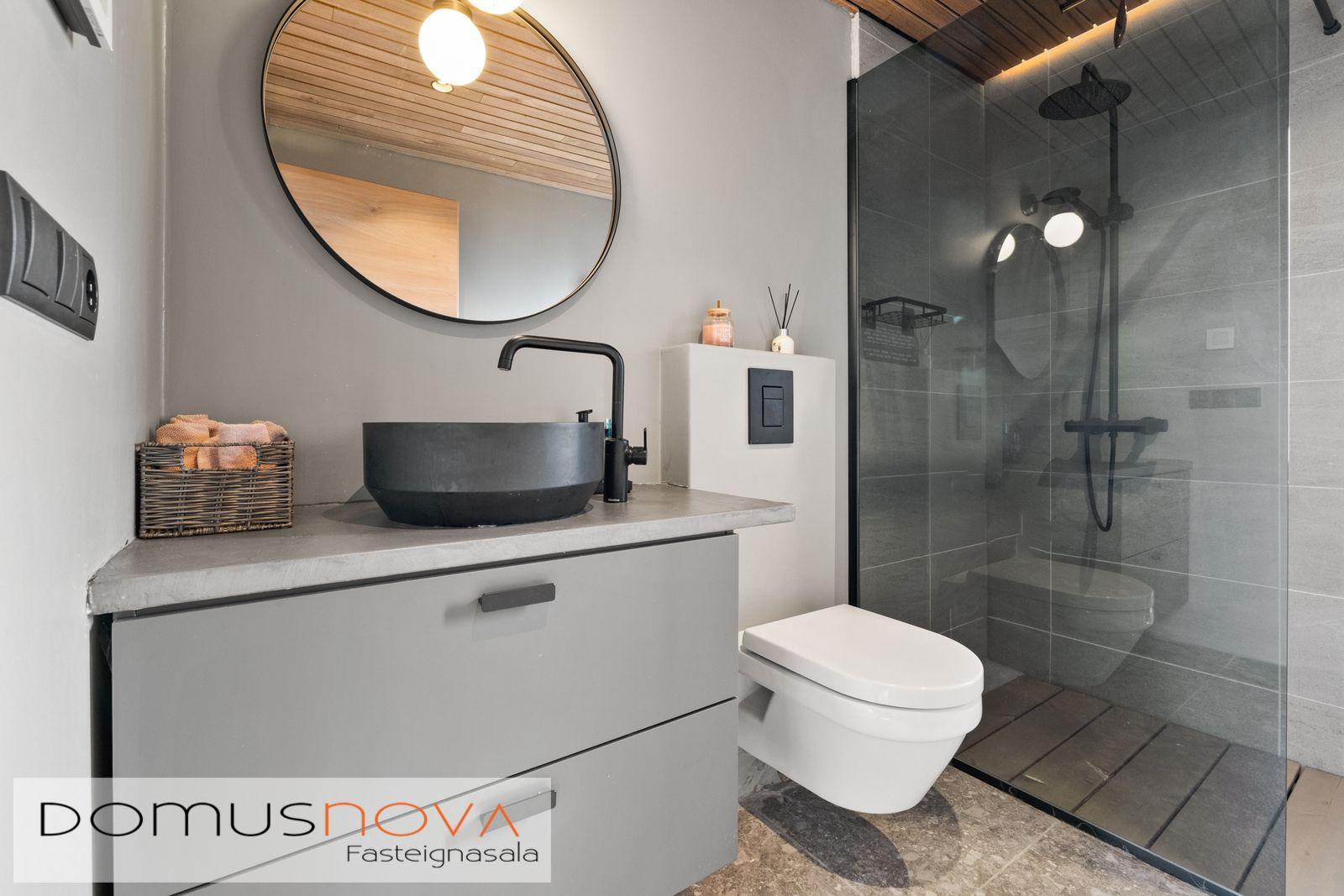 Norðurgangur/Baðherbergi - náttúruflísar á gólfi og veggjum í sturtu, "Walk-in" sturta, upphengt salerni og falleg innrétting með vaski.
