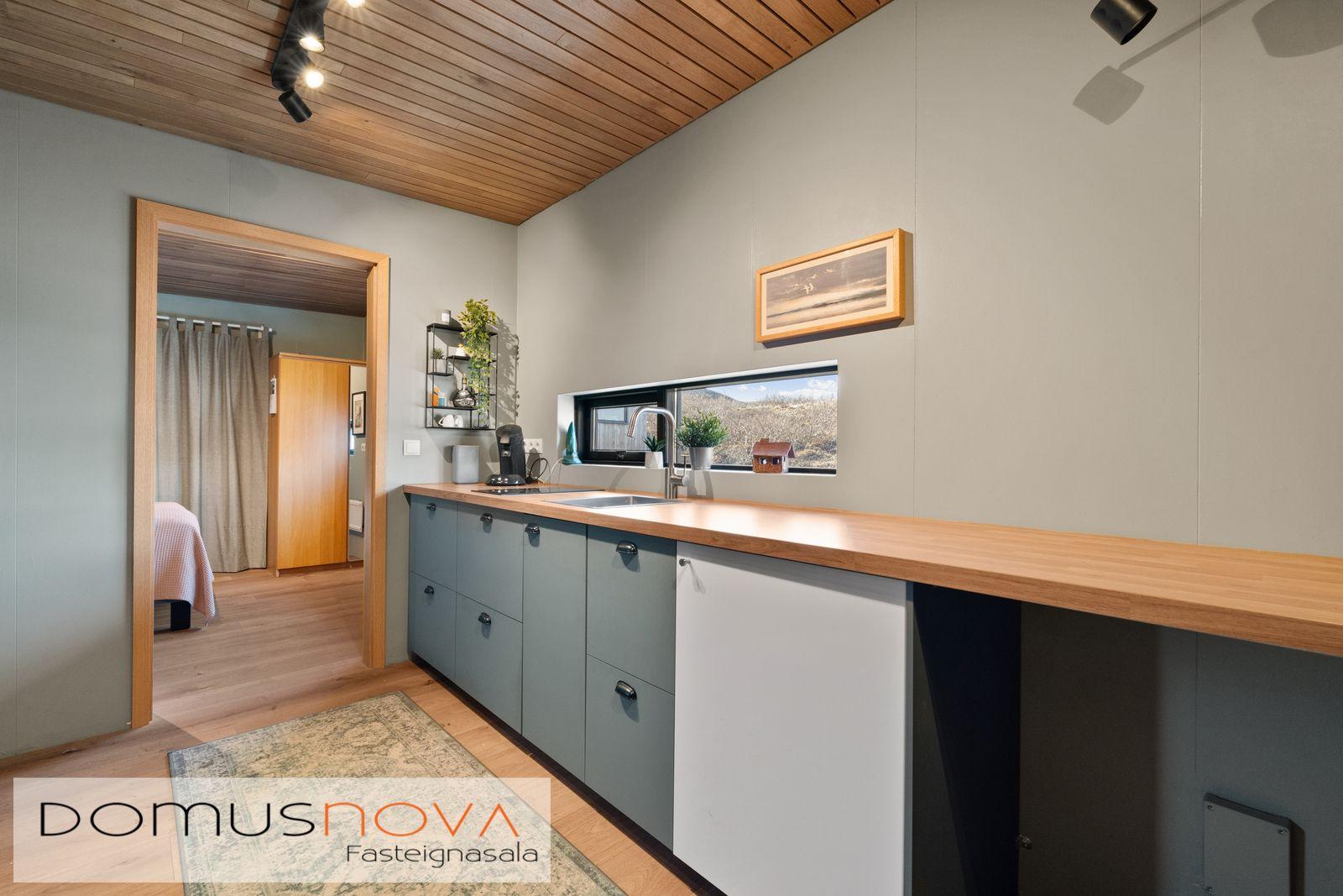 Í aðalrými er eldhúsinnrétting með góðu bekkjarými, vaski, liltu helluborði og innbyggðum litlum ísskáp.