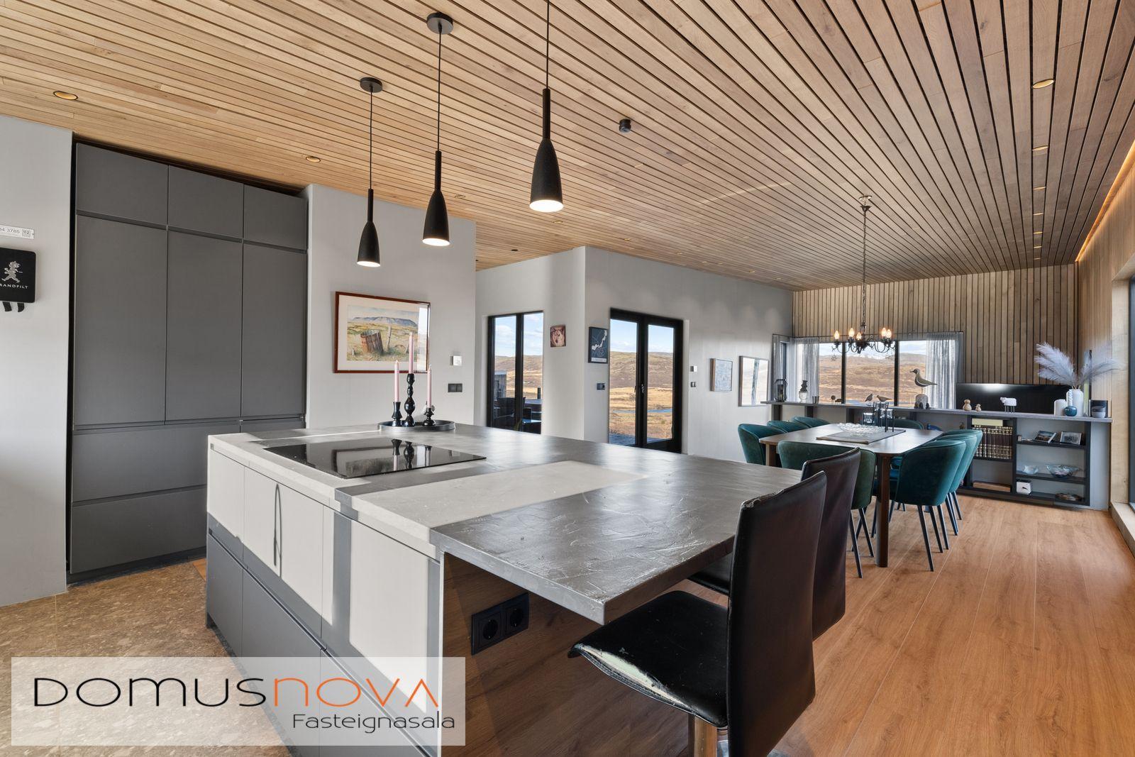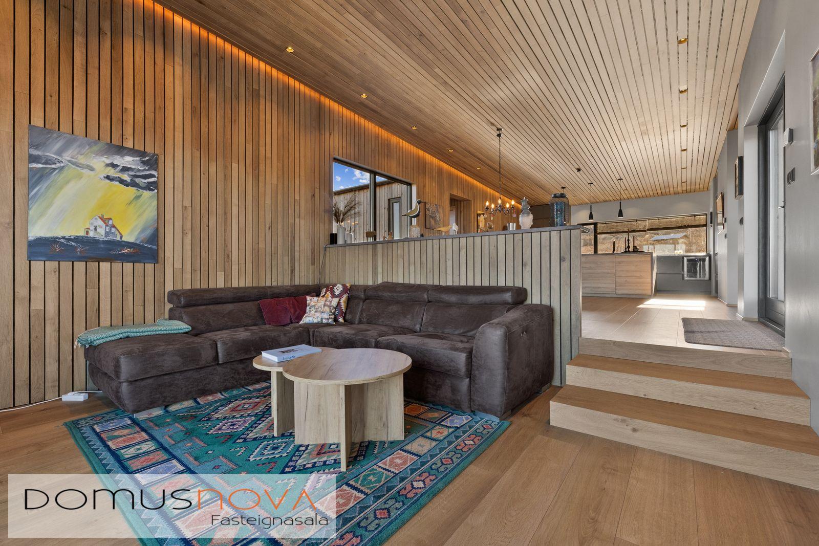 Stofa - stendur neðar framst (vesturhluta) aðalrýmis, gengið niður tröppur í setustofuna með fallegu útsýni um gólfsíða útsýnisglugga móti vestri og suðri.
