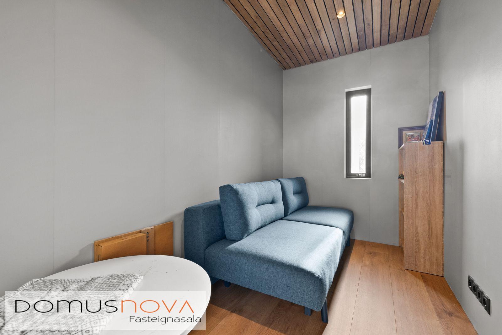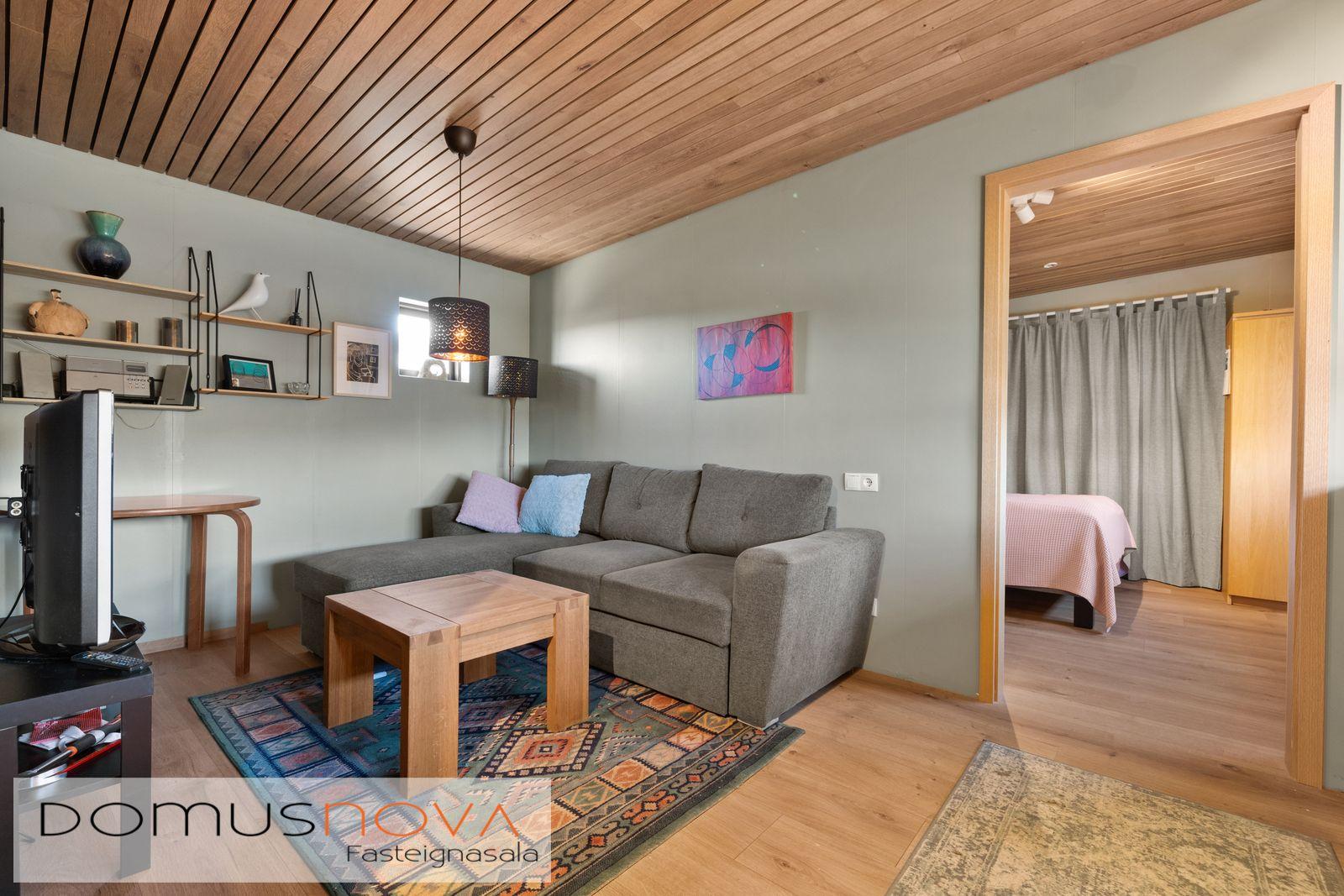 Í sama rými er stofuhorn með svefnsófa, harðparket á gólfi.