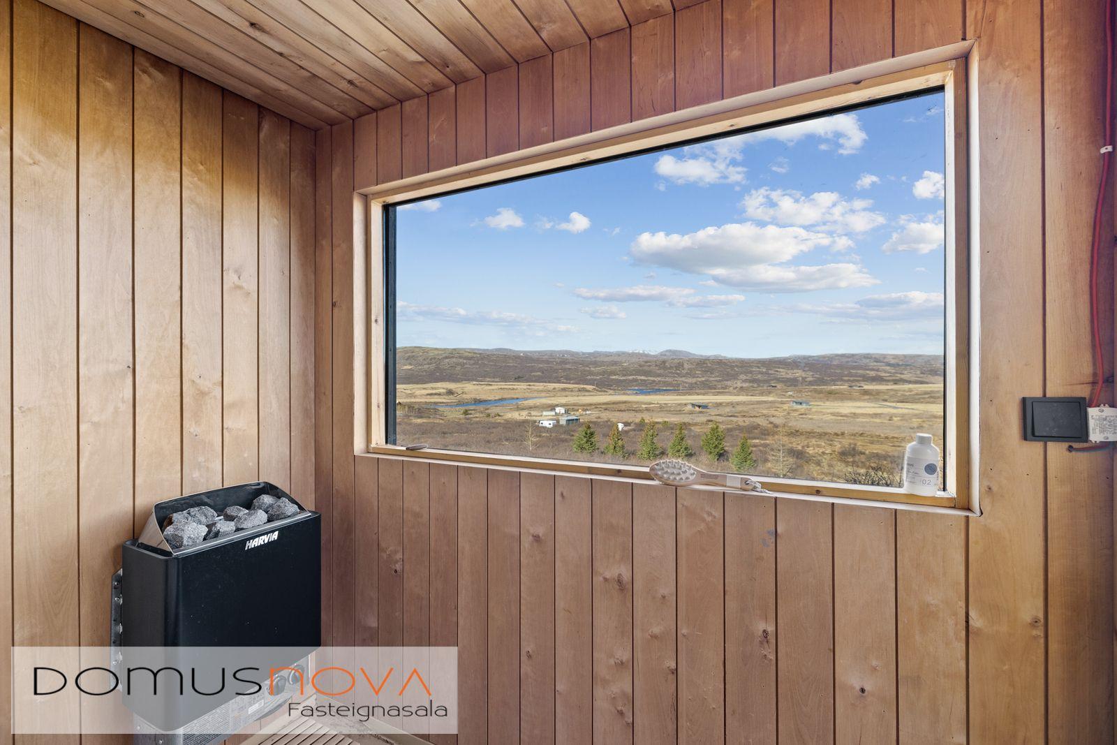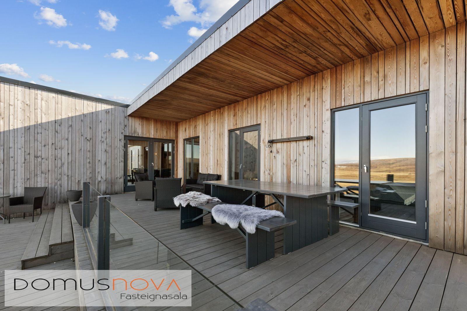 Mjög stór verönd er í skjólsælu horni móti vestri og suðri. Á veröndinni er stór rafmagnspottur, grillskýli, saunahús (6 fm) með mögnuðum útsýnisglugga. Mikið rými til að sitja og finna sér skjól, hvernig sem blæs.