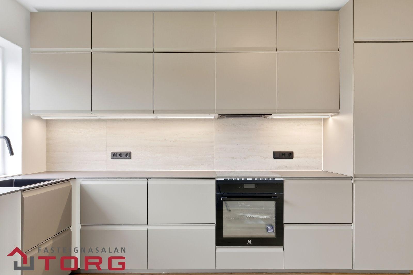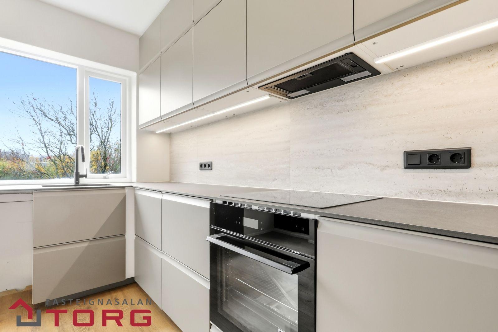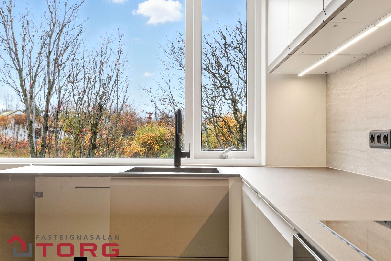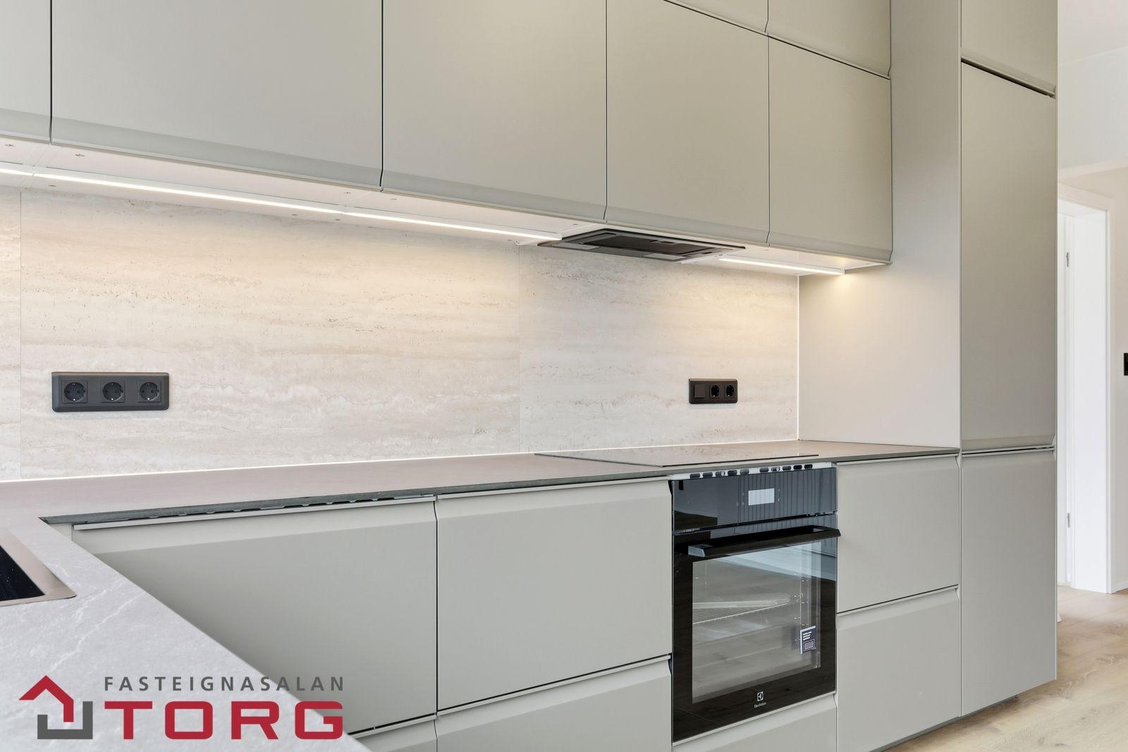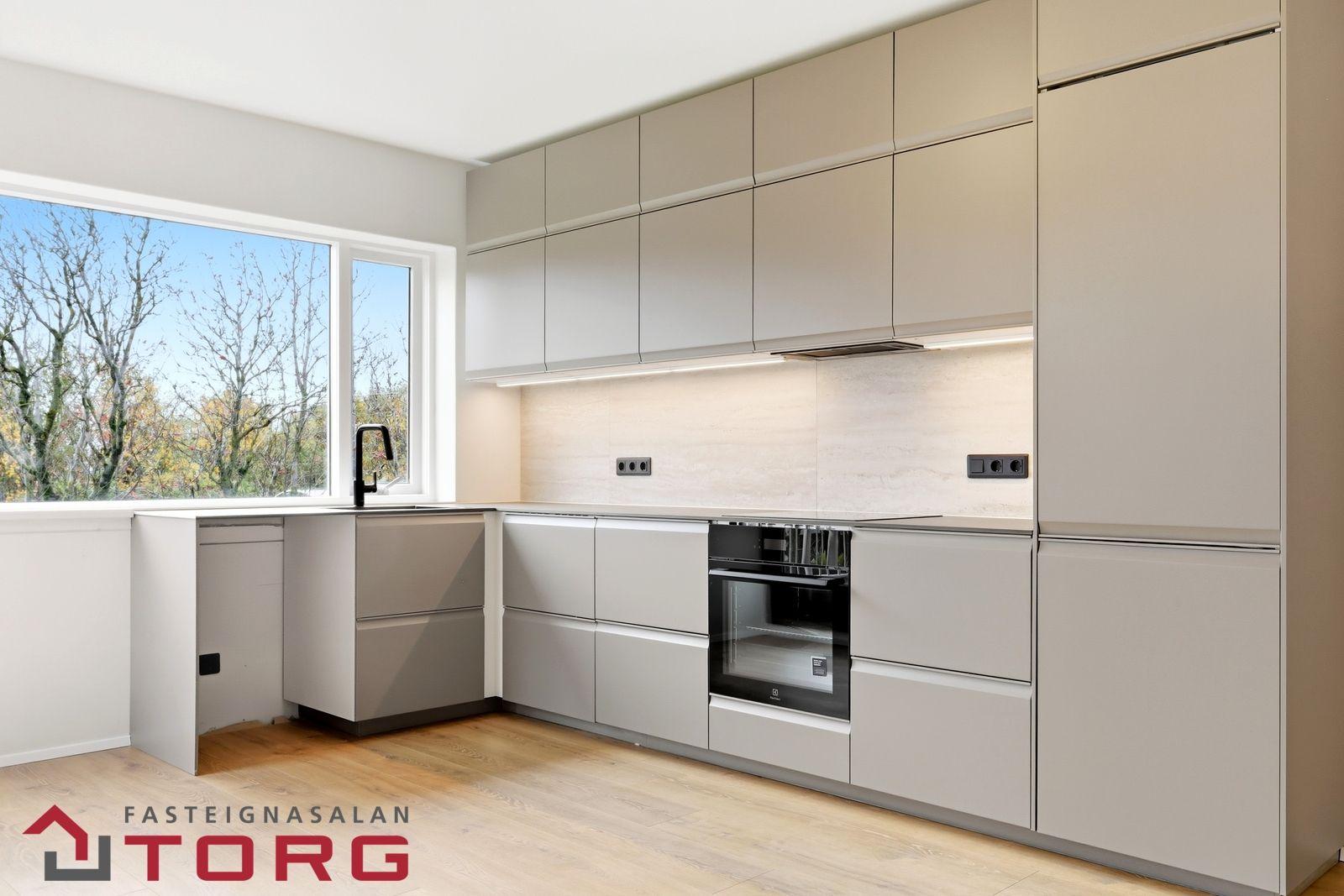 Eldhús tengist stofu í opnu rými, í eldhúsi er ný sprautulökkuð innrétting með miklu skápaplássi og nýjum vönduðum tækjum, ísskápur er innfelldur í innréttingu, harðparket á gólfi.