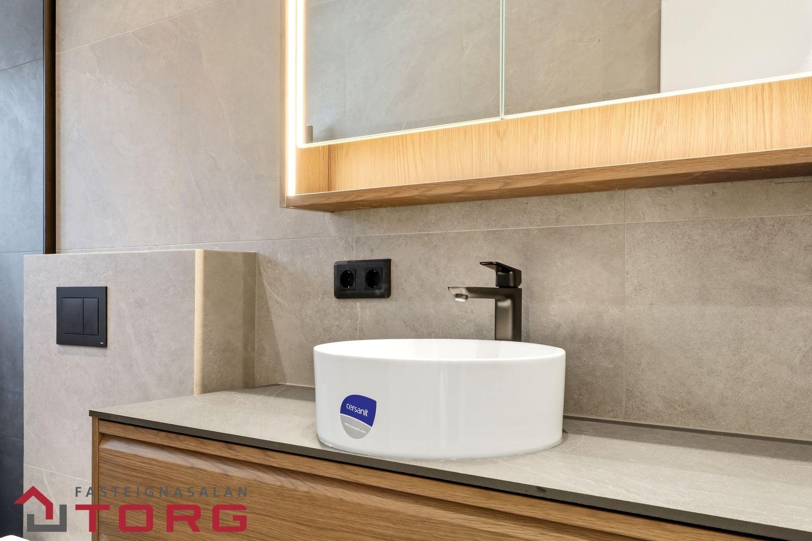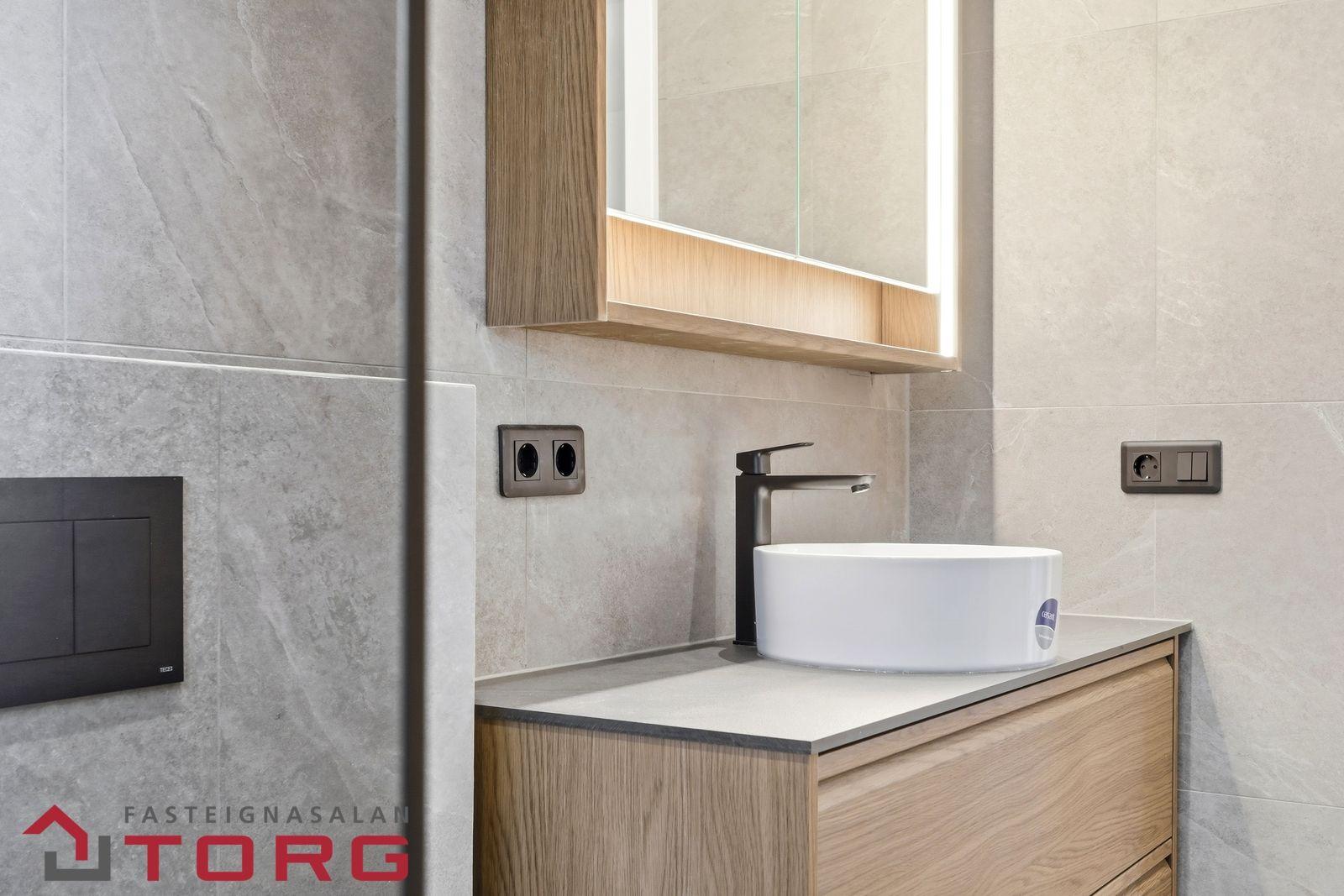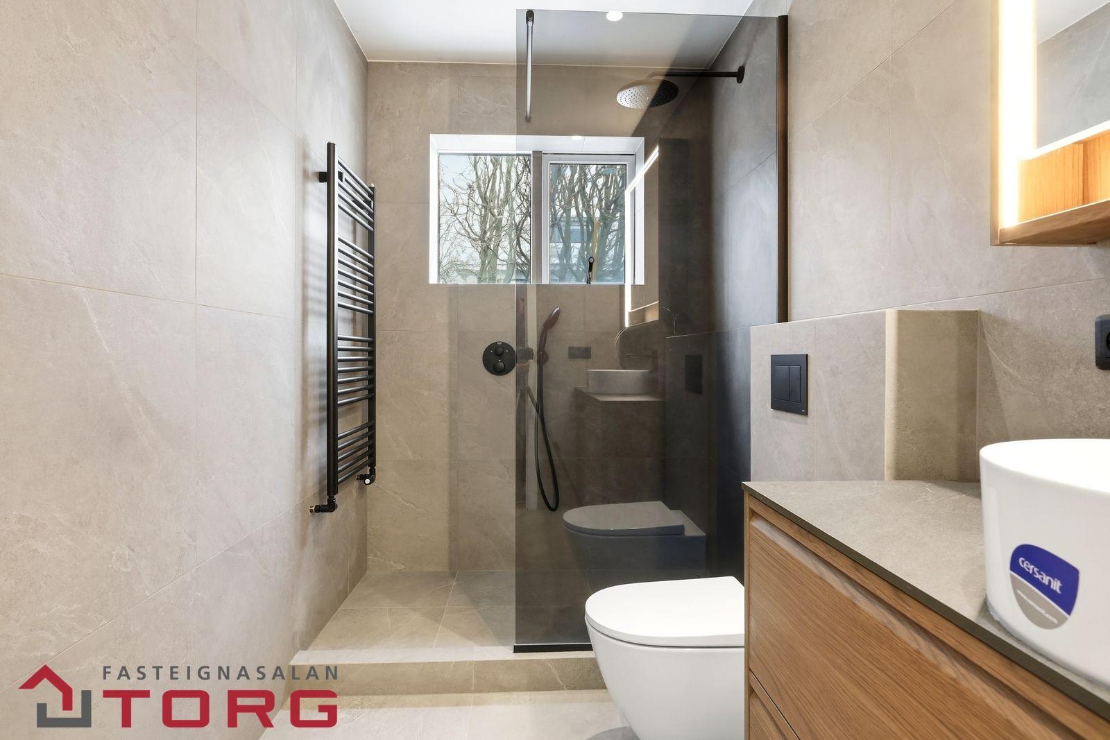 Baðherbergi er glæsilegt, flísalagt í hólf og gólf, vönduð innrétting, stór flísalögð sturta með glerskilrúmi og handklæðaofn. Hiti er í gólfi.