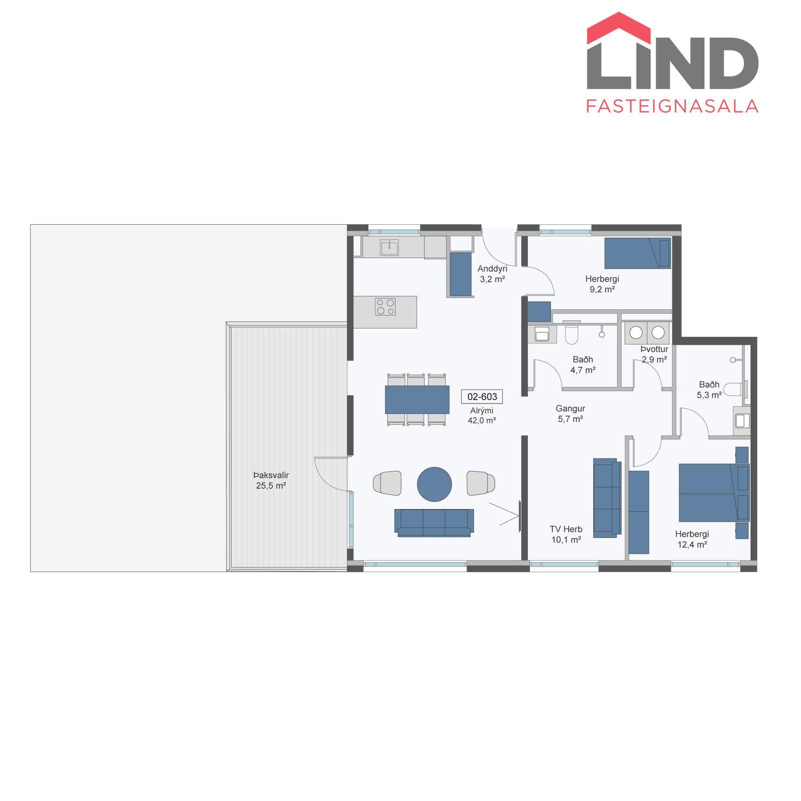 Íbúð 603: Er 126,6 fermetra 3ja herbergja þakíbúð á sjöttu hæð með stórum 25,5 fermetra þaksvölum og sérmerktu bílastæði í lokuðum bílakjallara. Þar af er geymsla 12,4 fermetrar. Afhending er áætluð mars-apríl 2026 en þó með fyrirvara um að öryggisúttekt sé komin á húsið.