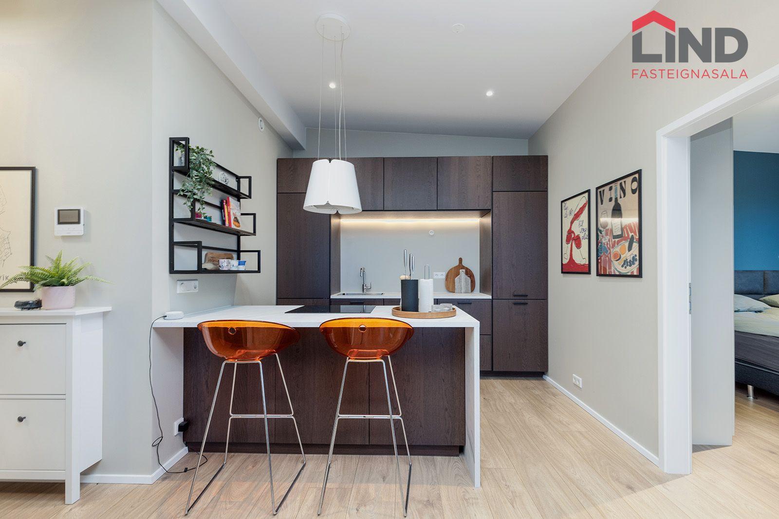 Eldhús með stórri viðarinnréttingu, eyju, harðparket