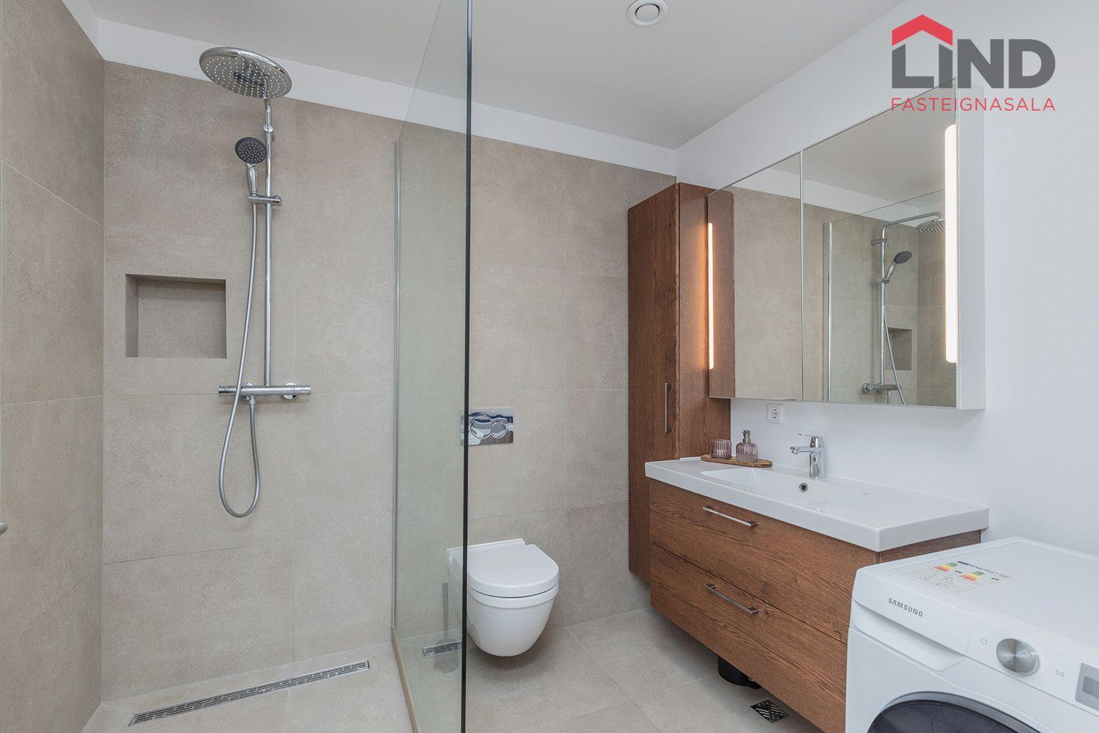 Baðherbergi með góðri viðarinnréttingu, rúmgóð sturta, þvottaaðstaða, flísar á gólfi og hluta veggja