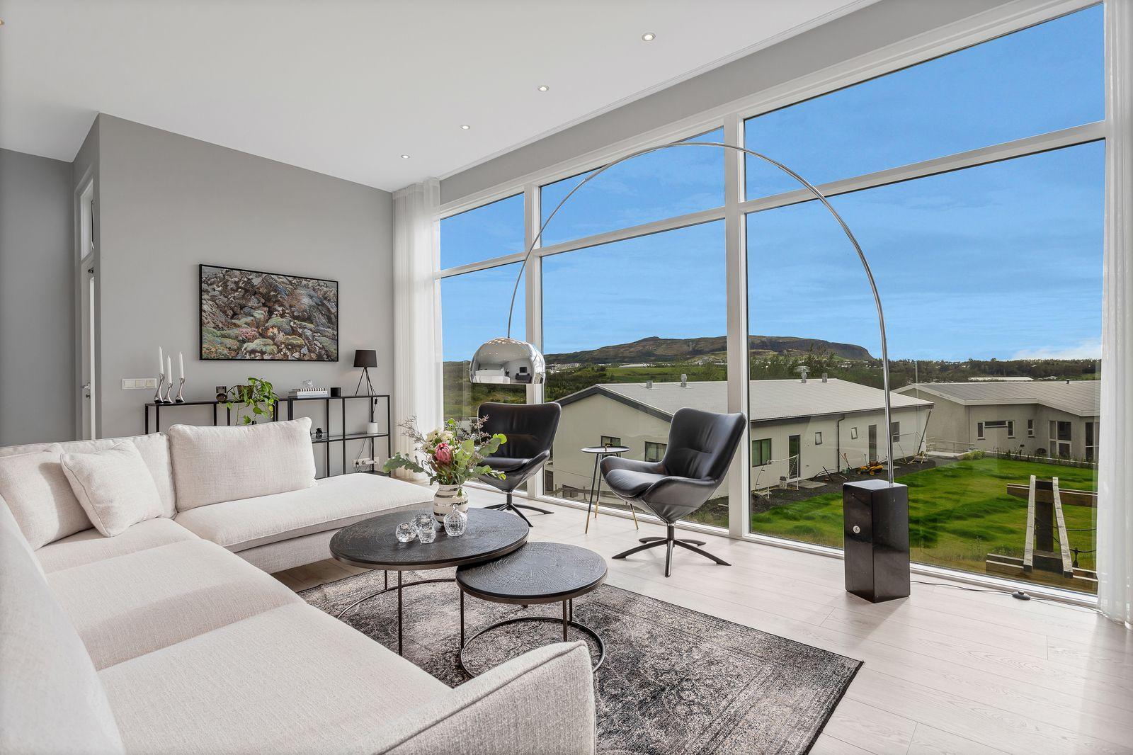 Nánari lýsing efri hæð:Stofa á efri hæð er í fallegu og björtu rými með stórum gólfsíðum gluggum og einstöku útsýni. Nýlegt ljóst harðparket á gólfi og innfelld loftlýsing.