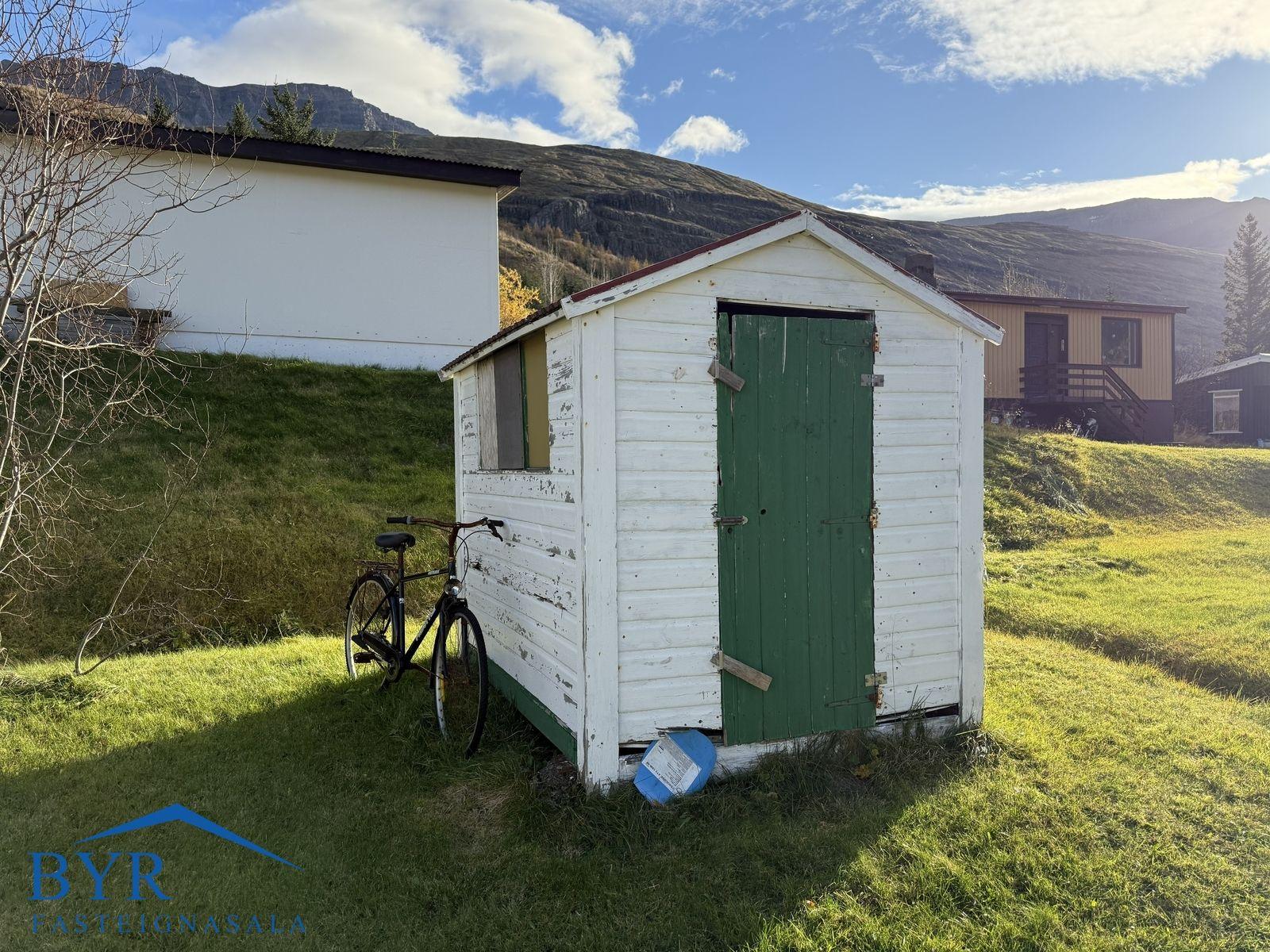 Lóð er gróin, timburtröppur liggja frá götu að húsinu, lítil timburverönd er framan við inngang hússins, þvottasnúra er á baklóð ásamt litlum skúr.