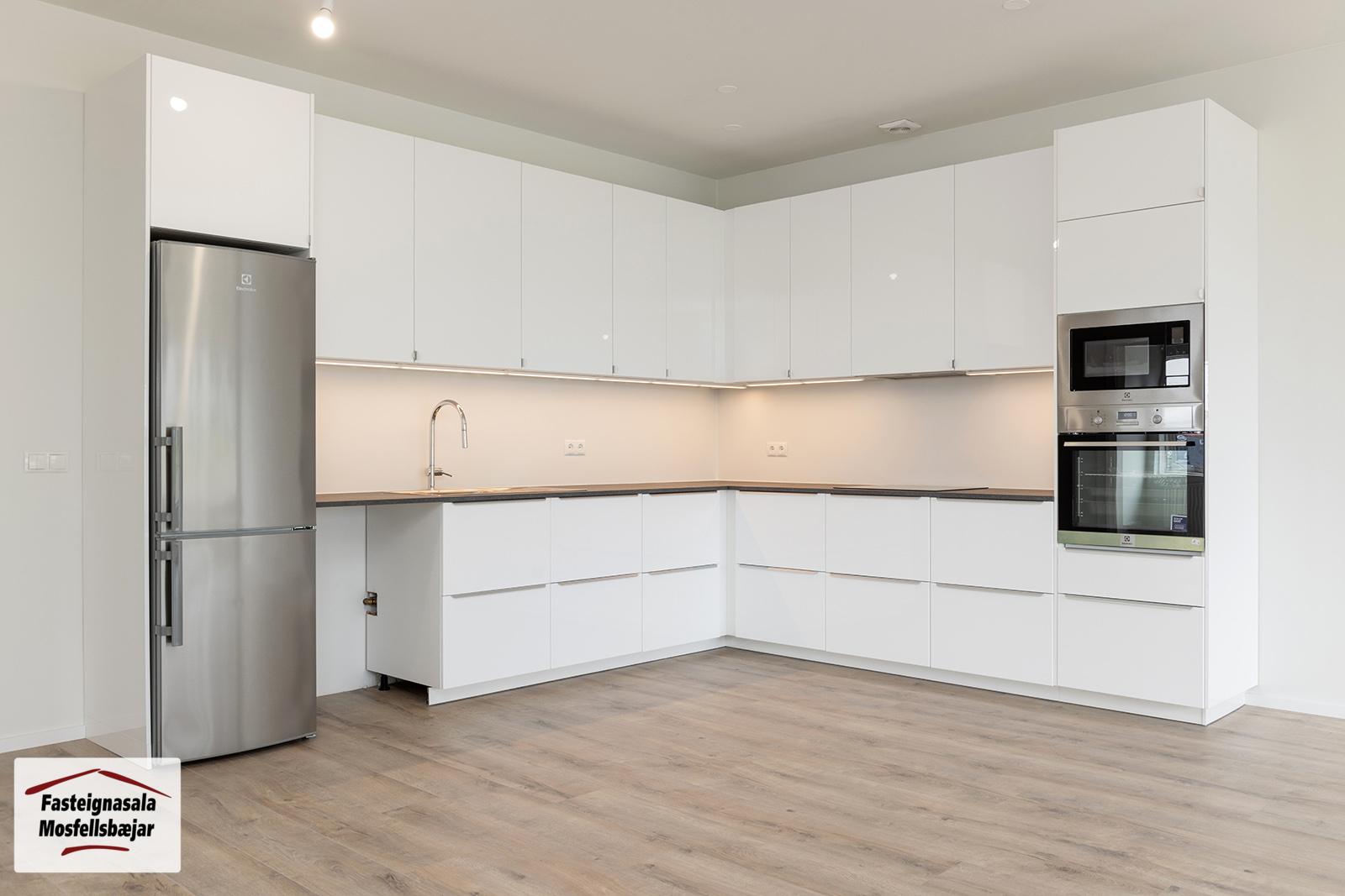 Eldhús er með fallegri innréttingu. Í innréttingu er span helluborð, bakaraofn í vinnuhæð, örbylgjuofn og ísskápur. Gert er ráð fyrir uppþvottavél.