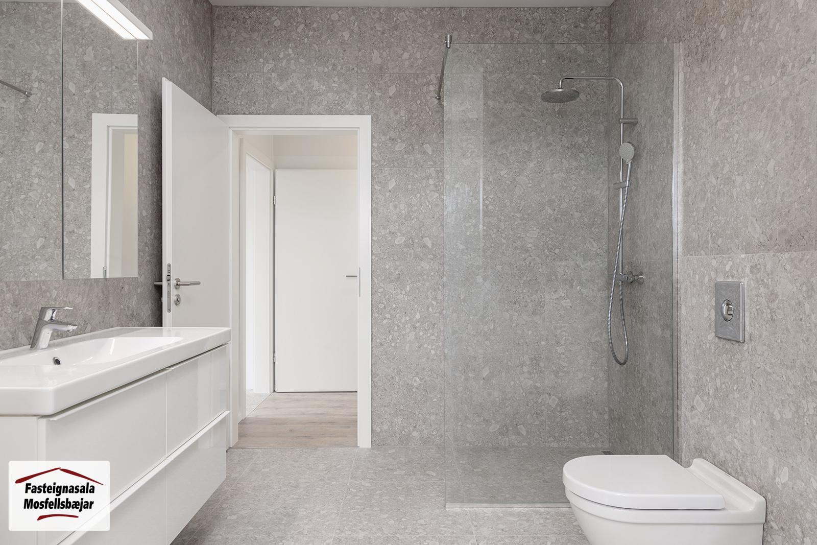 Baðherbergi er flísalagt. Á baði er vegghengt salerni, 'walk in' sturta, handklæðaofn og hvít innrétting. Innaf er þvottaherbergi