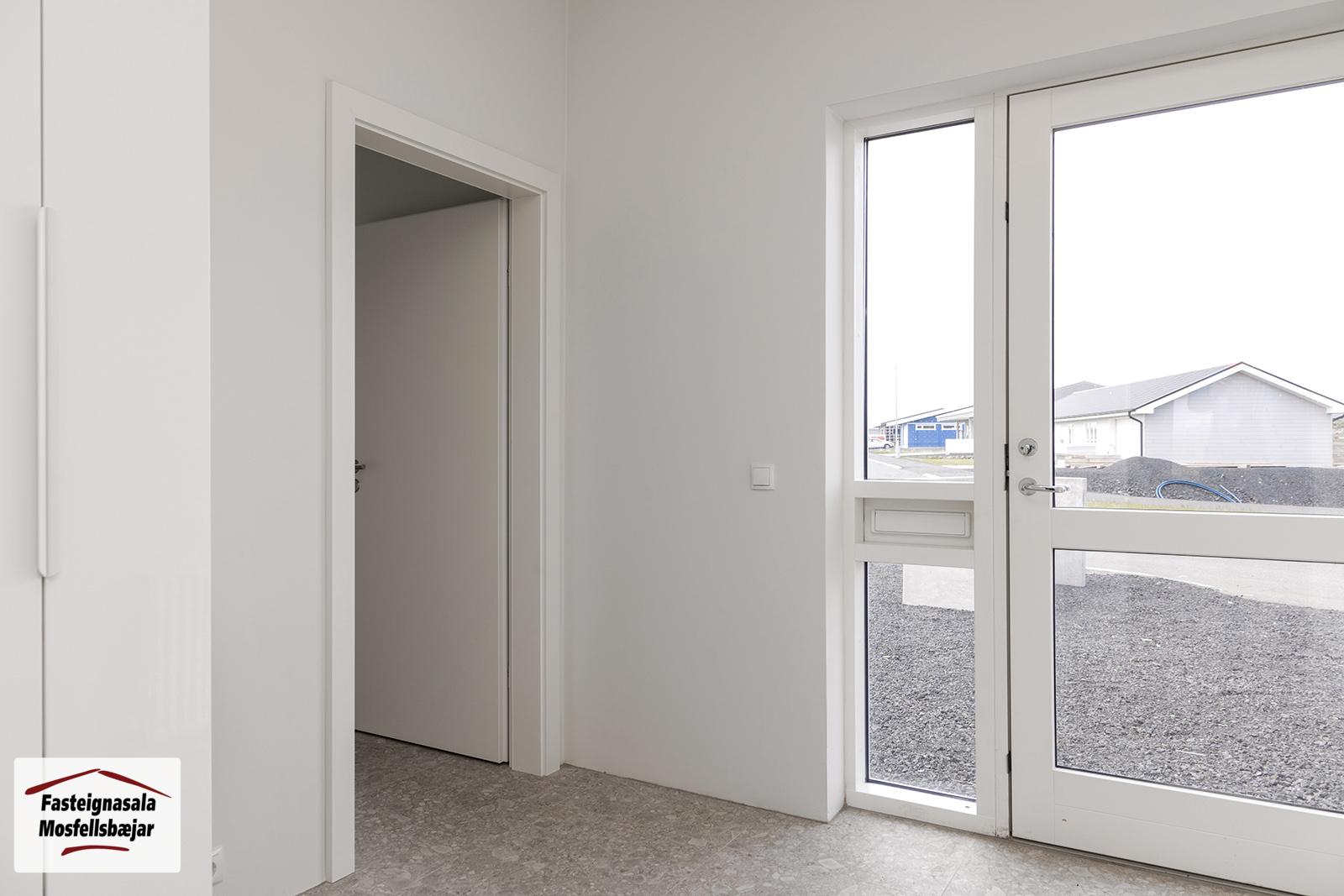 Stofa/borðstofa er í opnu rými með eldhúsi. Parket á gólfi. Úr stofu er gengið út á hellulagða verönd og bakgarð þar sem gert er ráð fyrir heitum potti i bakgarði.