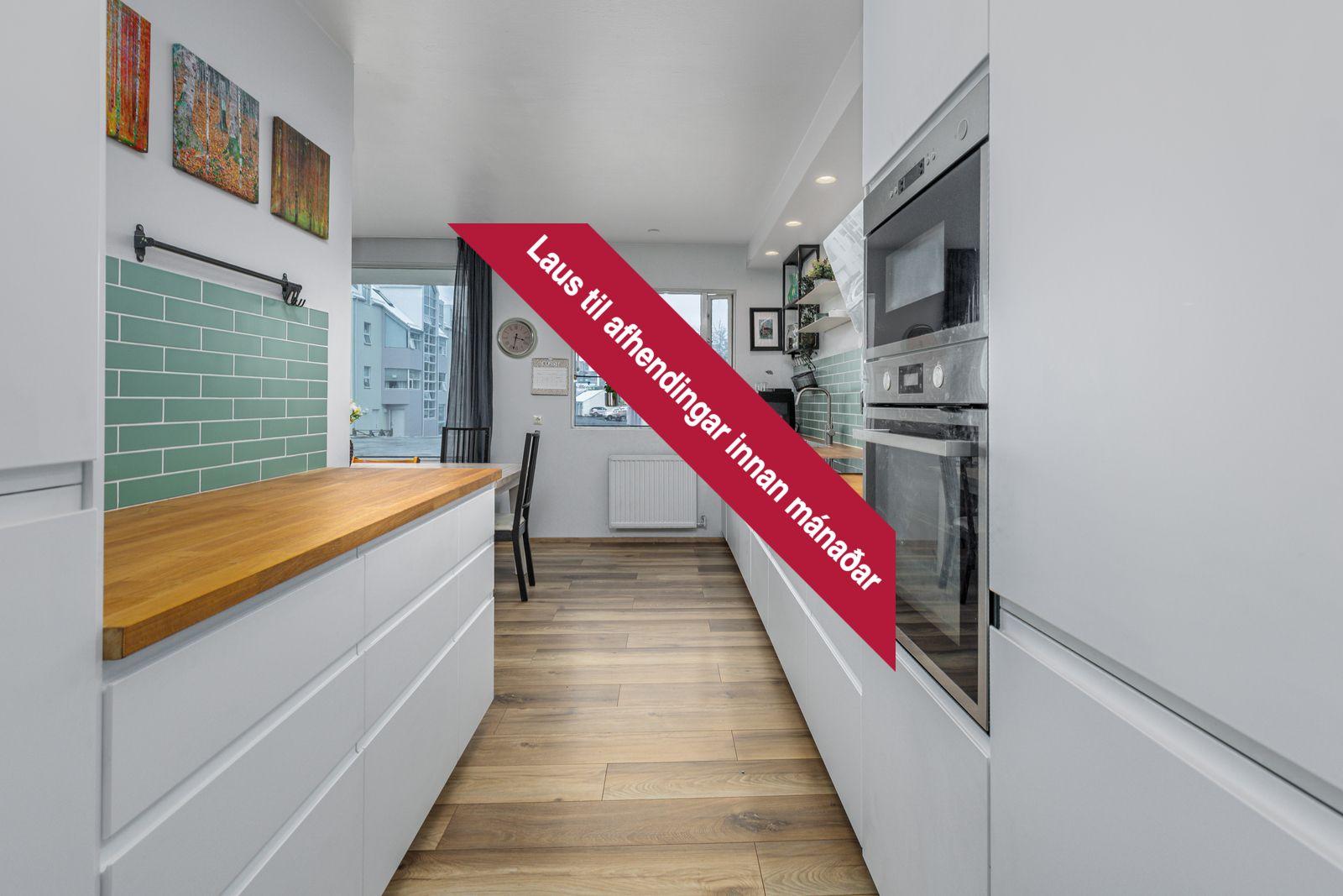 Eldhús með góðri ljósri innréttingu sem hefur verið endurnýjað auk þess sem tækin eru nýleg. Spanhelluborð, bakarofn og örbylgjuofn fylgja auk þess sem ísskápur og uppþvottavél eru innbyggð. Flísalagðir veggir að hluta.