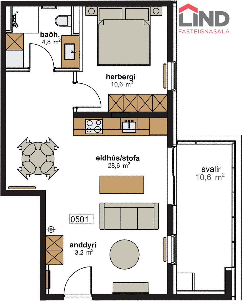 Íbúð 501: 58,0 fm 2gja herbergja íbúð á 5. hæð. Íbúðin er 58,0 fm þar af 3,6 fm geymsla,