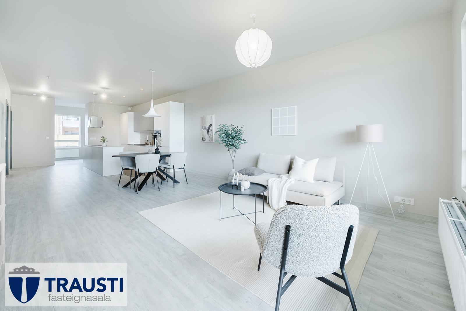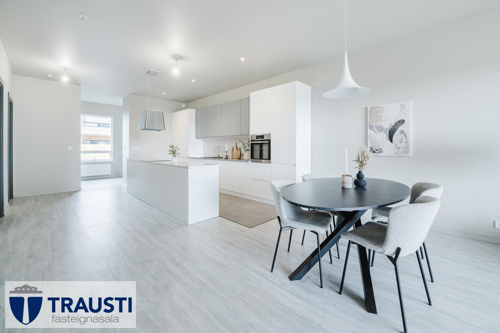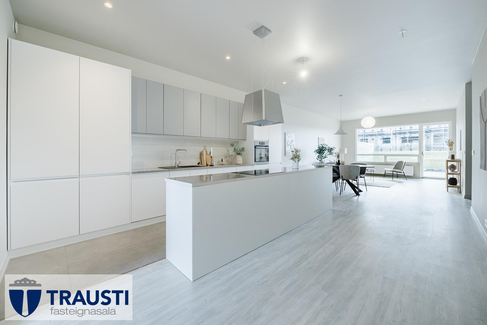 Þessi bjarta og vel skipulagða íbúð státar af auknum lofthæðum, innfelldri lýsingu og rúmgóðu alrými sem sameinar stofu, borðstofu og eldhús.
