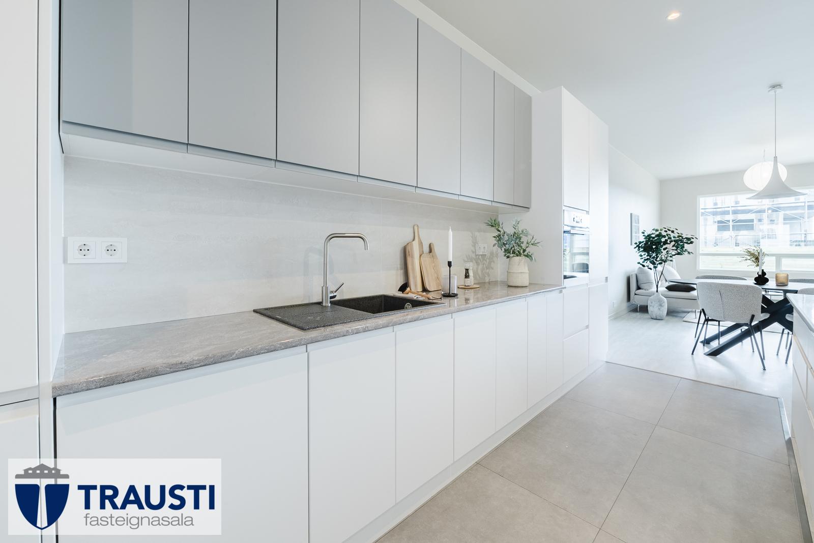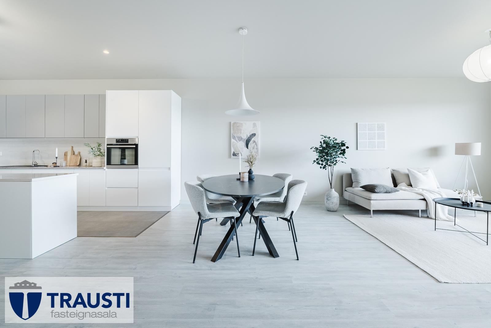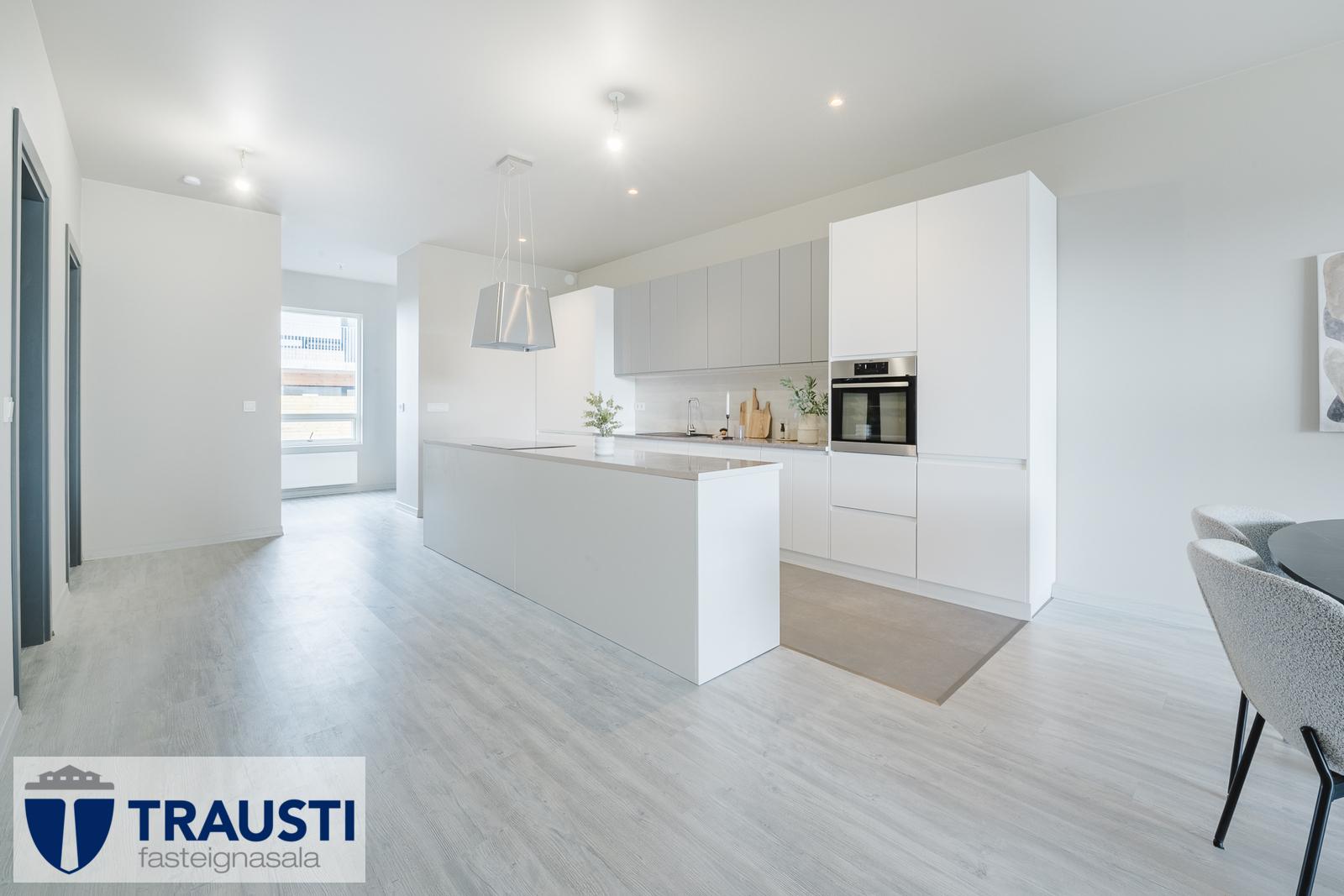 Þessi bjarta og vel skipulagða íbúð státar af auknum lofthæðum, innfelldri lýsingu og rúmgóðu alrými sem sameinar stofu, borðstofu og eldhús.