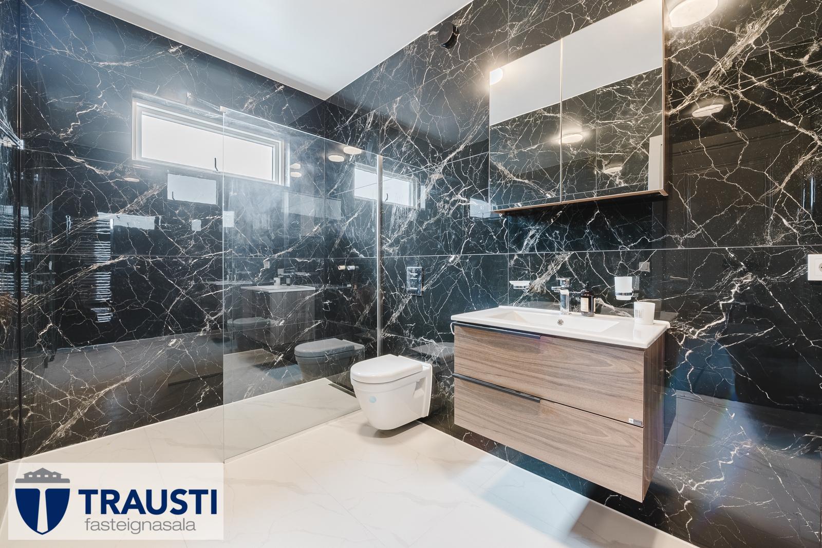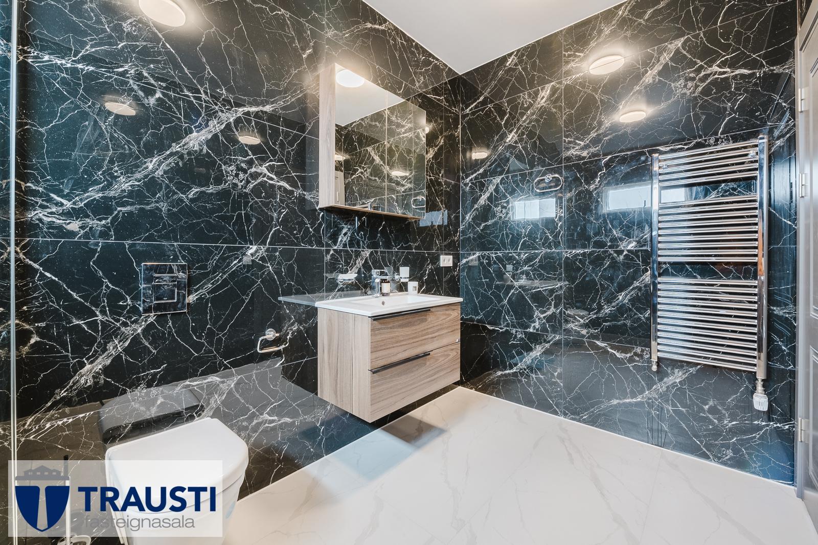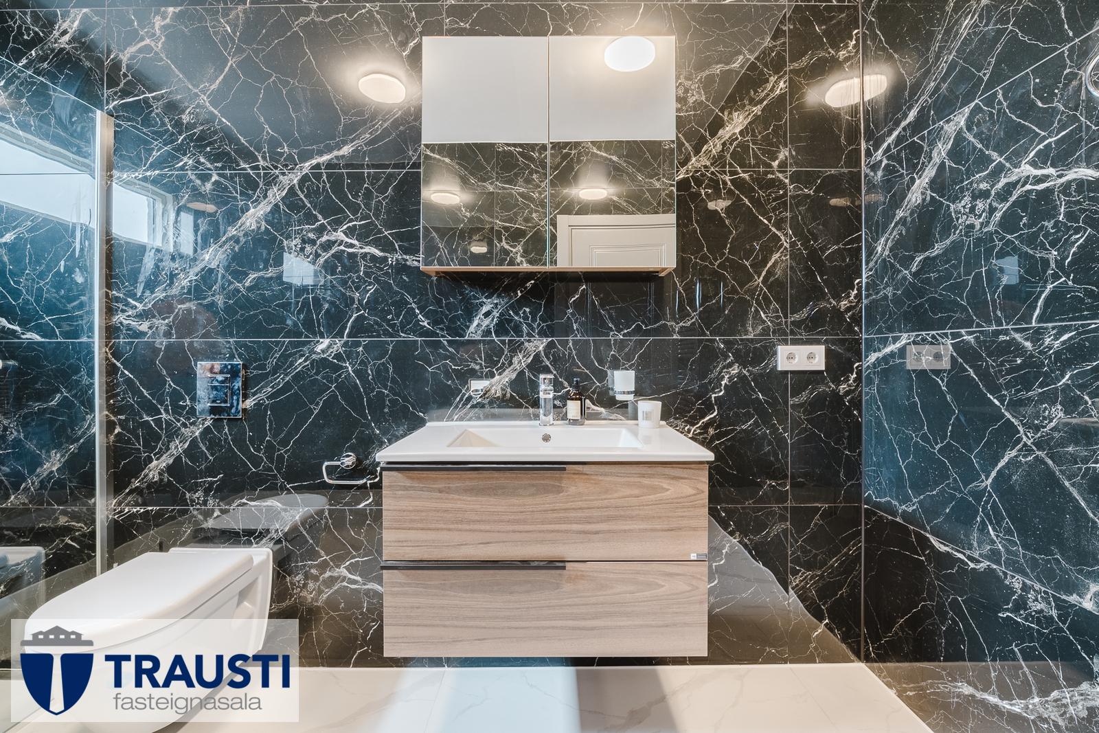 - Baðherbergi: Flísalagt með 120x60 cm marmara- og svörtum flísum. Sérsmíðaðar innréttingar í viðarlit, yfirfelldur vaskur, speglaskápur, walk-in sturta með glerskilrúmi og veglegur krómaður handklæðaofn.