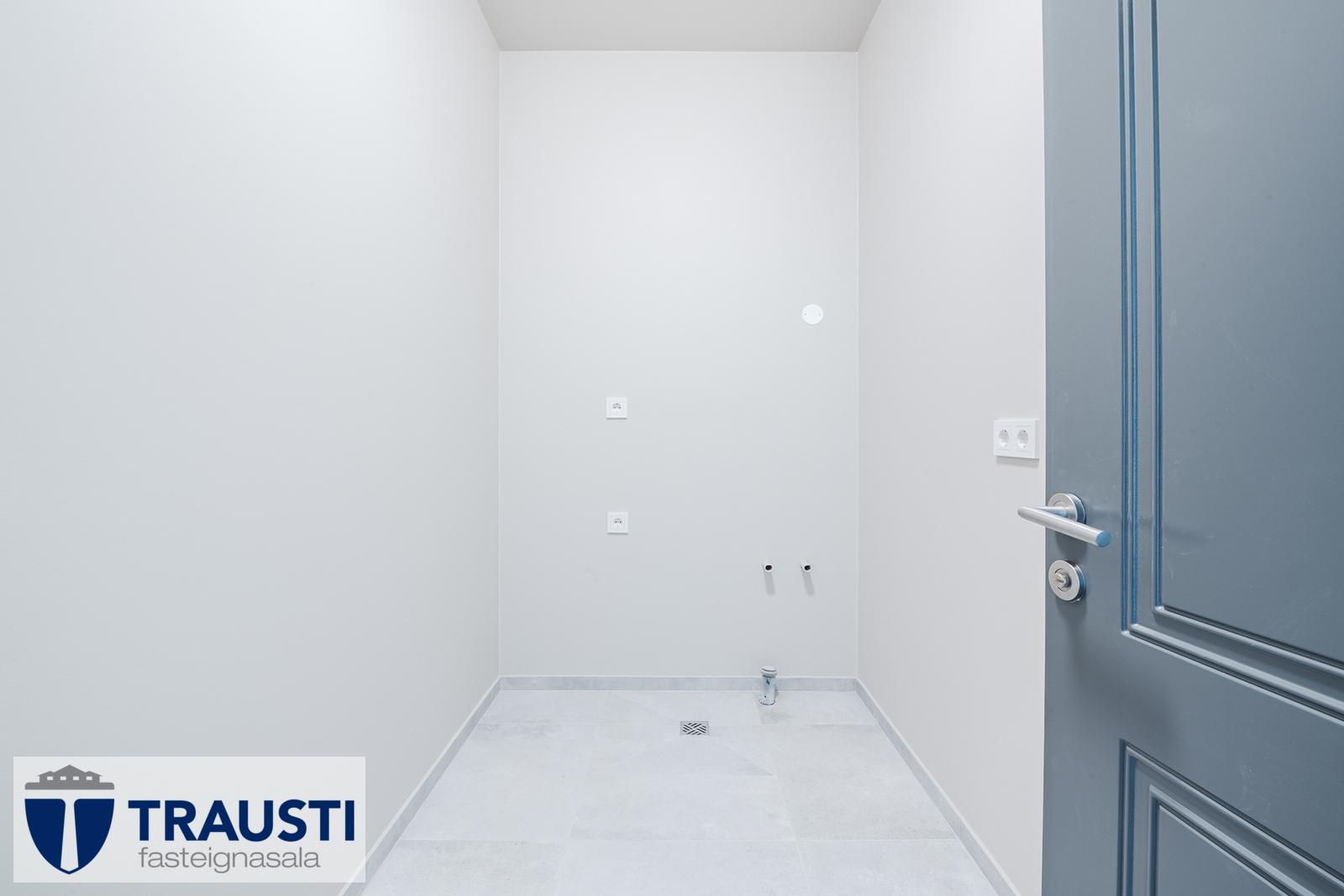 - Þvottahús og geymsla: Sér rými með flísalögðu gólfi og vegghengdum skolvaski.