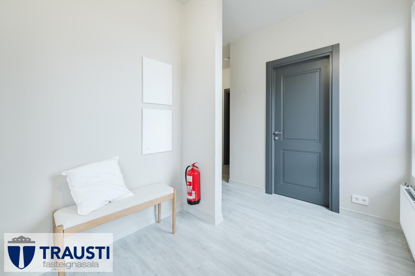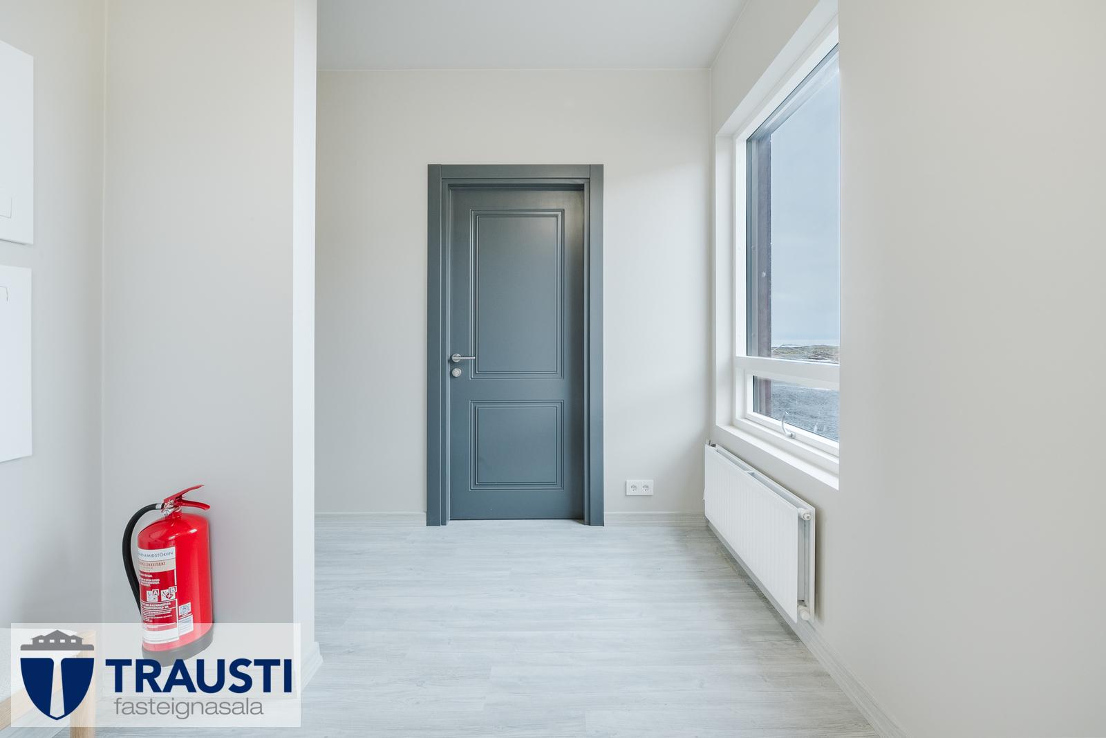 - Hurðir: Fallegar, gráar, yfirfelldar þröskuldslausar fölningshurðir í öllum rýmum nema votrýmum.