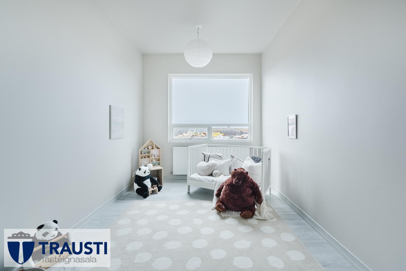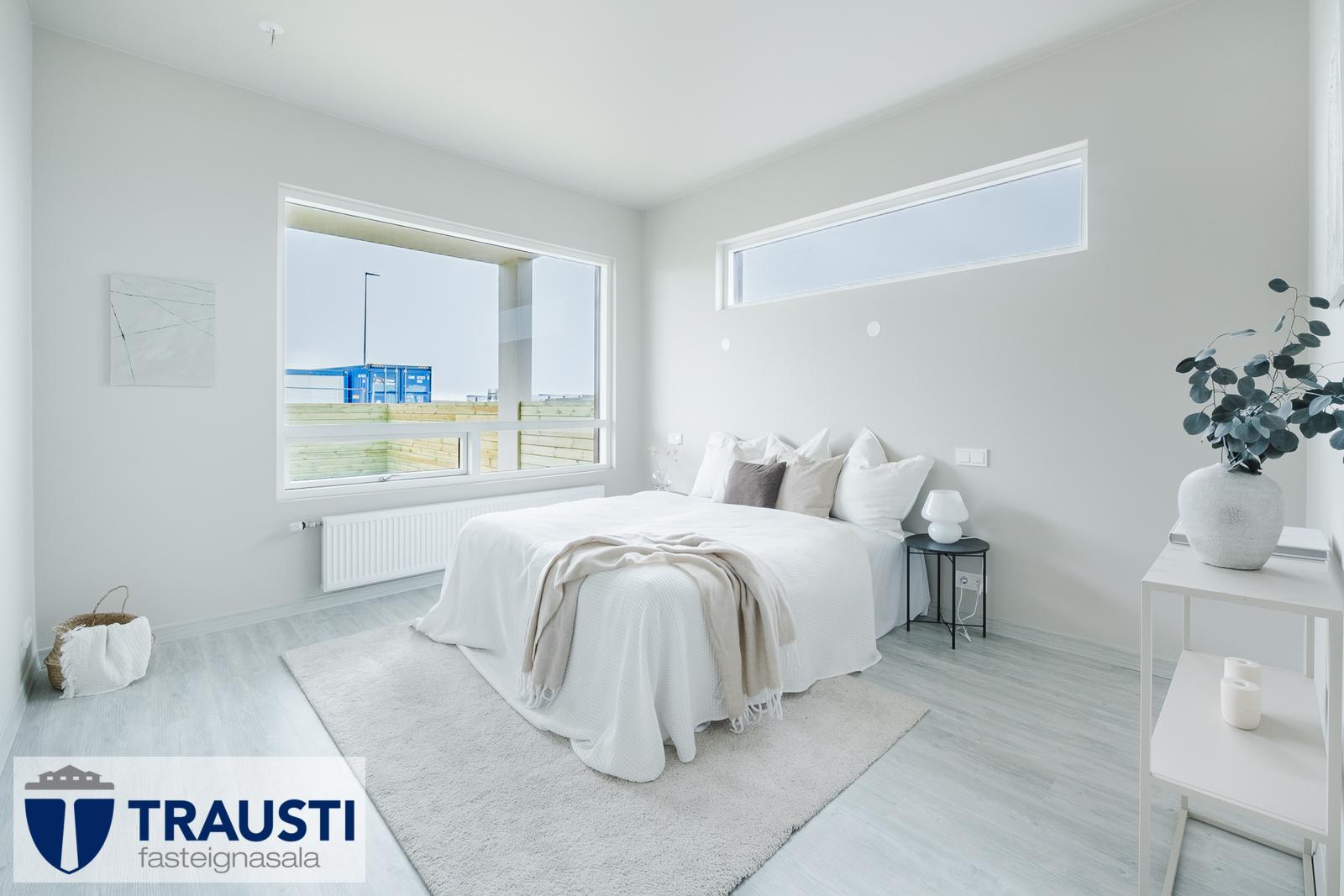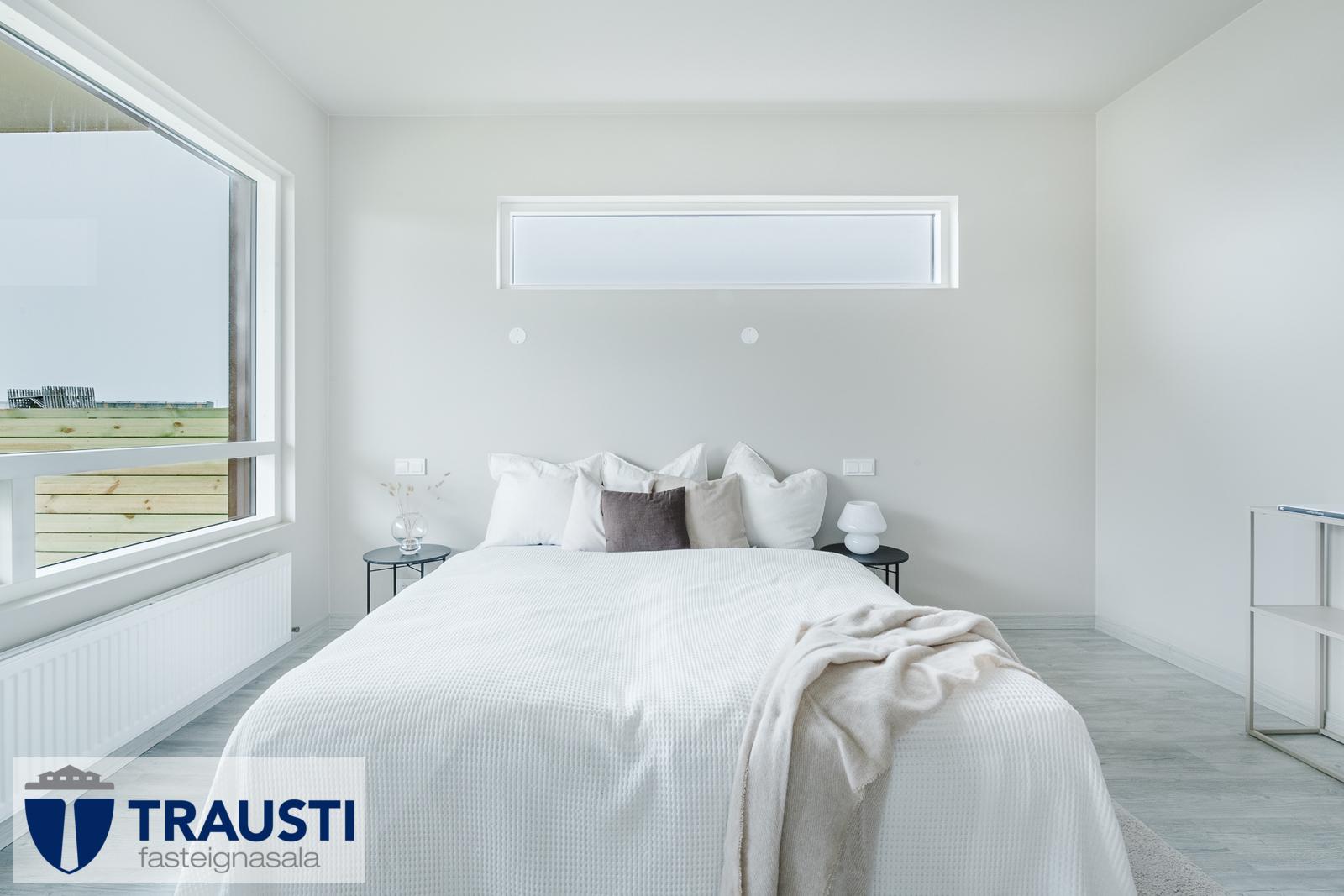 - Gólfefni: Ljósgrátt harðparket í alrými og herbergjum, flísar í votrýmum.