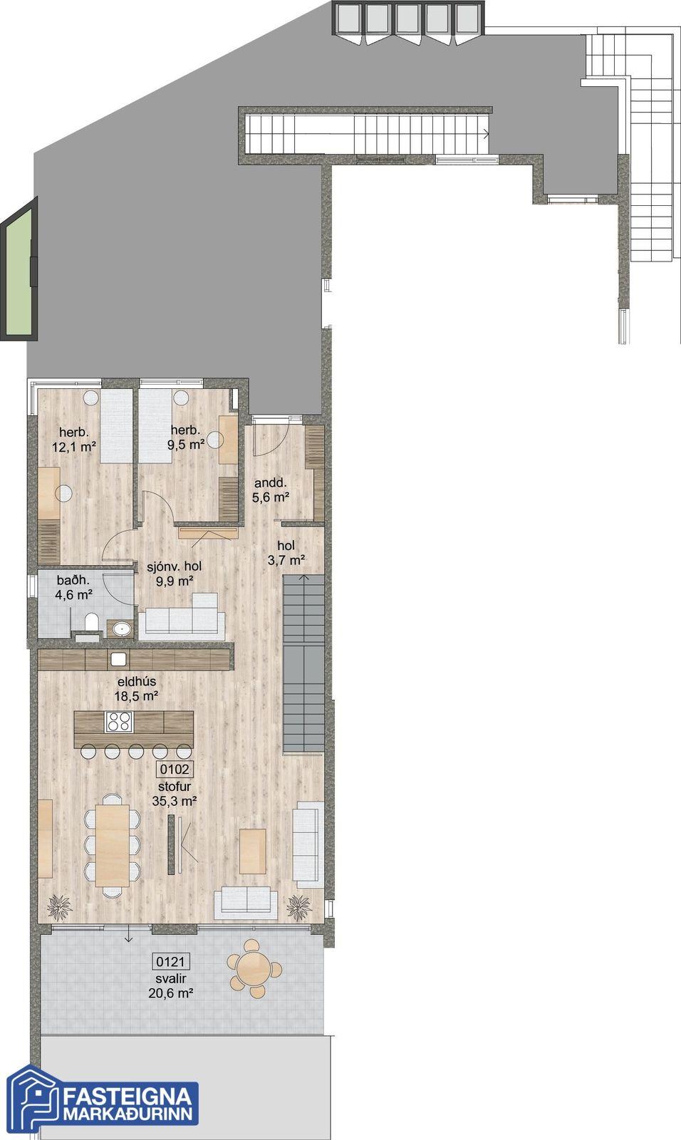 Birt stærð íbúðar 0102 er 189,1 fermetrar. Áætlaður afhendingartími er í febrúar 2026.