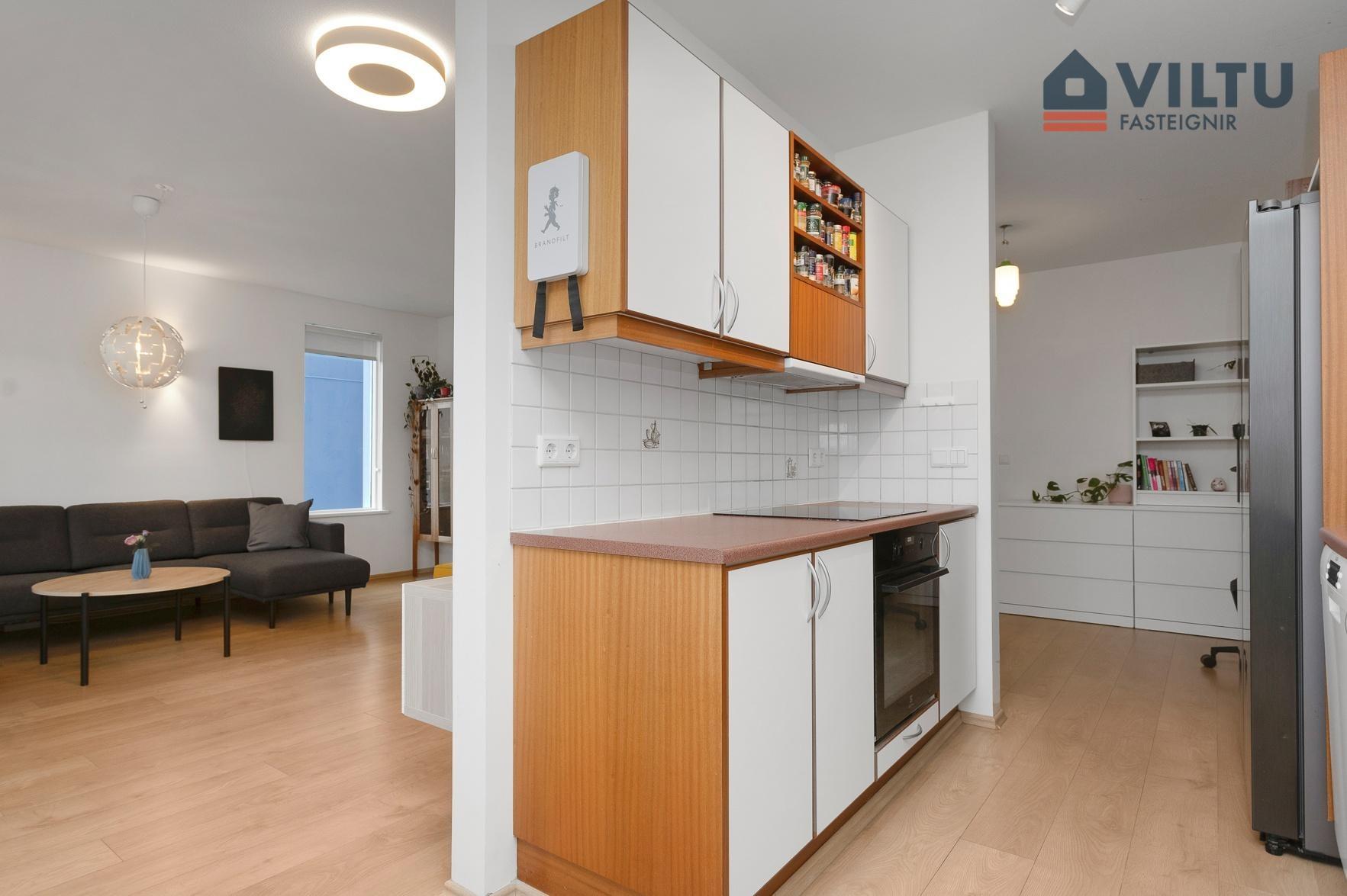 Eldhús með snyrtilegri innréttingu og góðum borðkrók,opið er inn í stofuna. Parket er á gólfi.