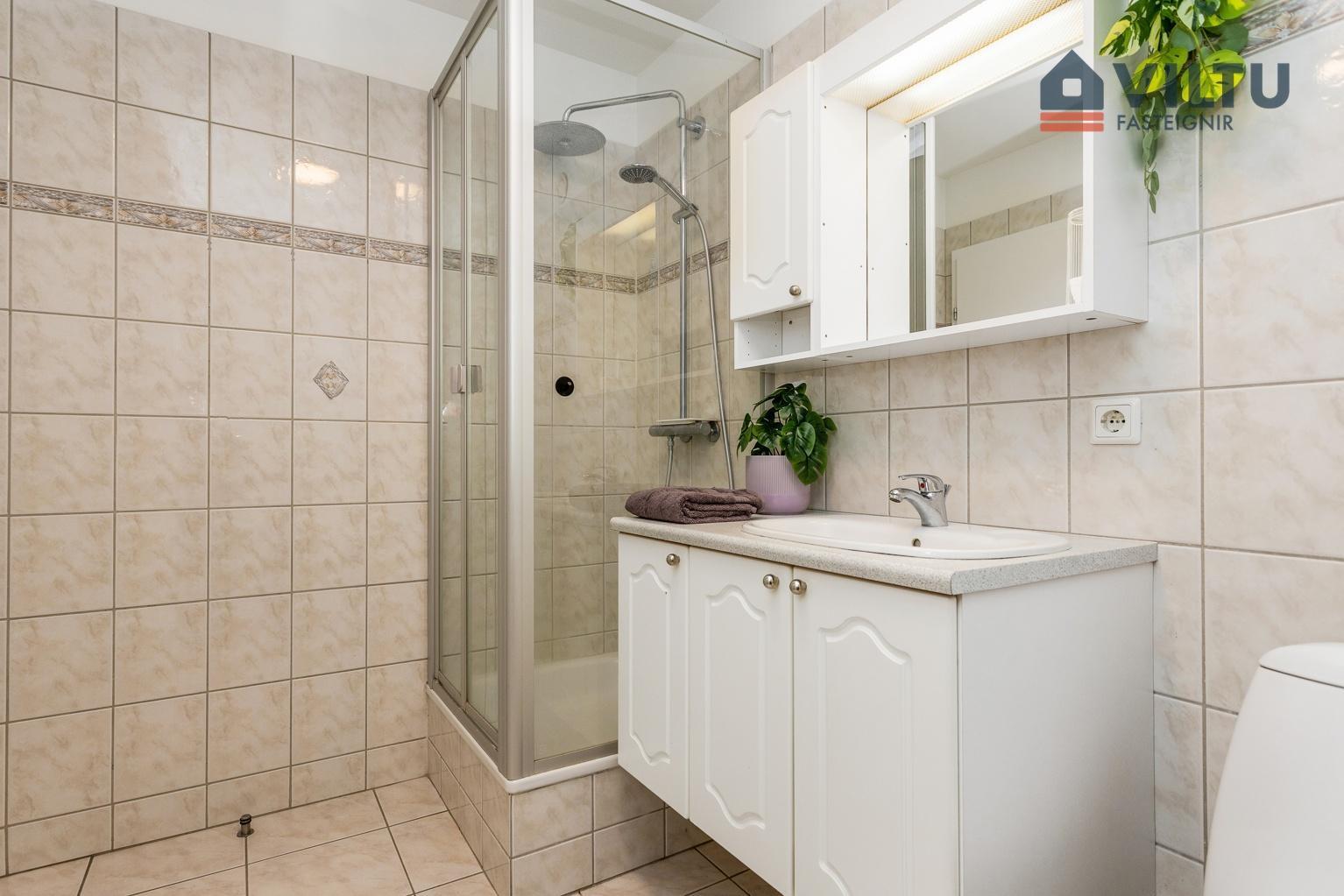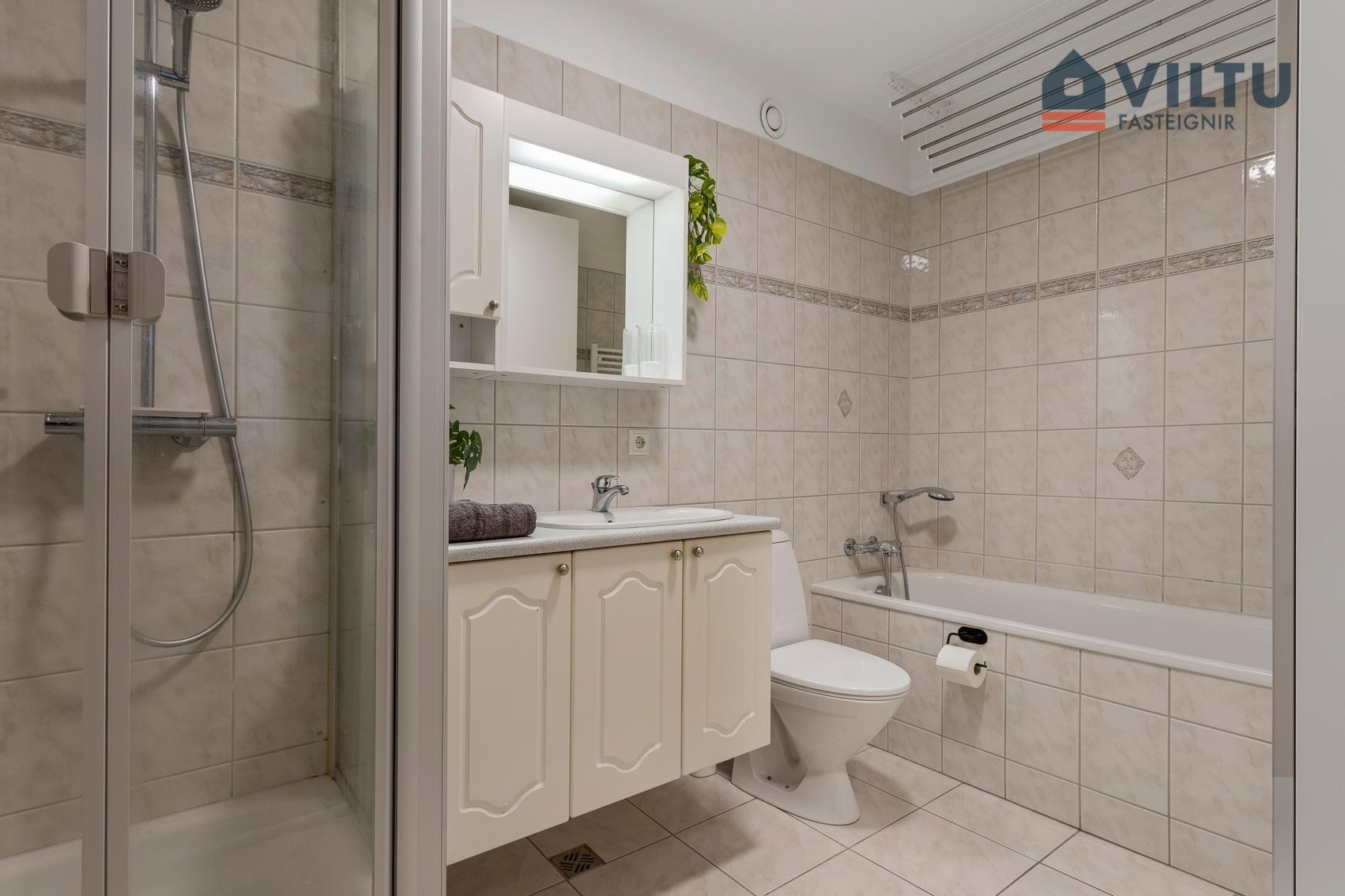Baðherbergi er rúmgott með bæði sturtu og baðkari, góðri innréttingu og flísalagt í hólf og gólf.