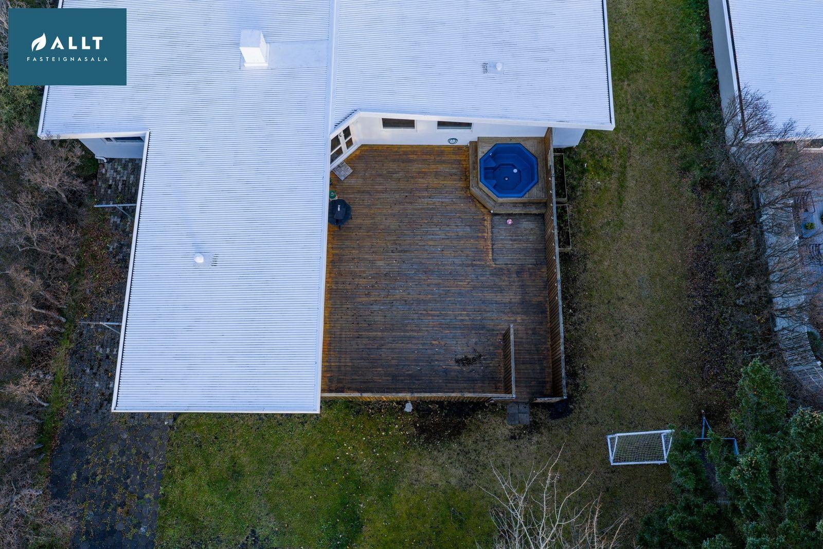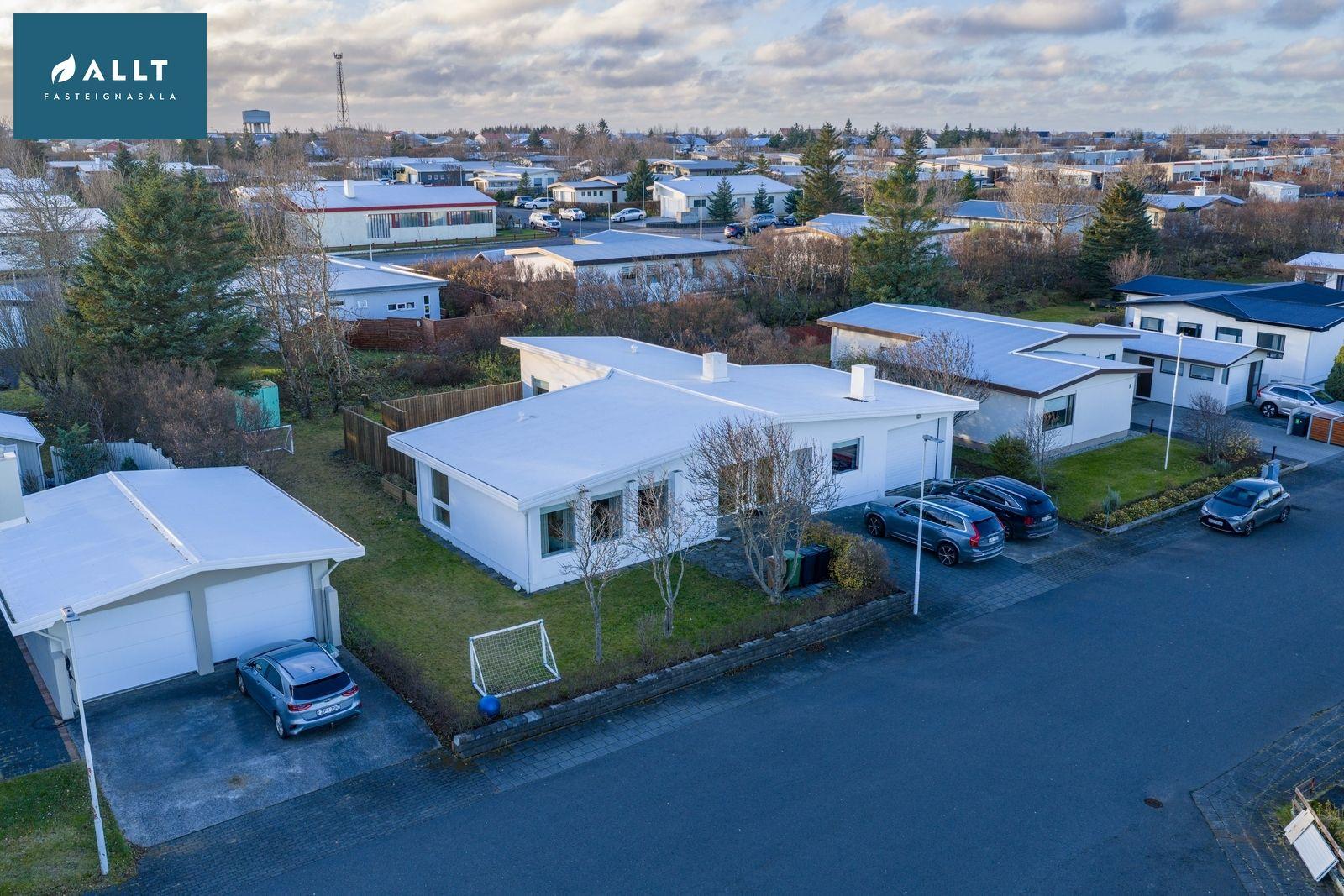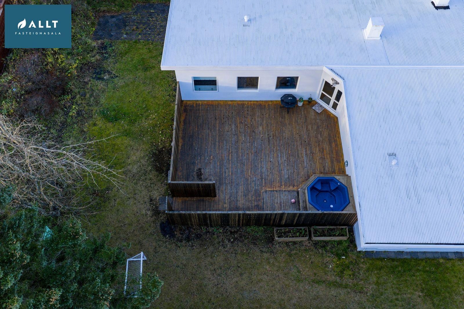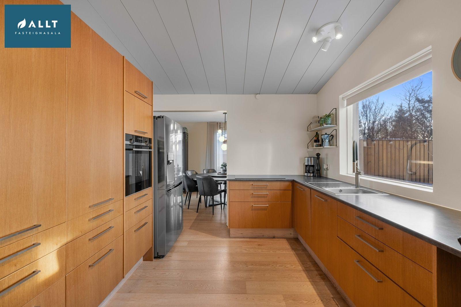 Eignin samanstendur af bjartri stofu, borðstofu, opnu eldhúsi, rúmgóðu holi með arni, þremur svefnherbergjum, tveimur baðherbergjum auk svefnherbergis og baðherbergis með sturtu í skúr alls fjögur svefnherbergi. Forstofa er rúmgóð og innaf er forstofusalerni. Aflokaður sólpallur er til suður með heitum potti. Þvottahús með geymslu innaf. Gott bílaplan.