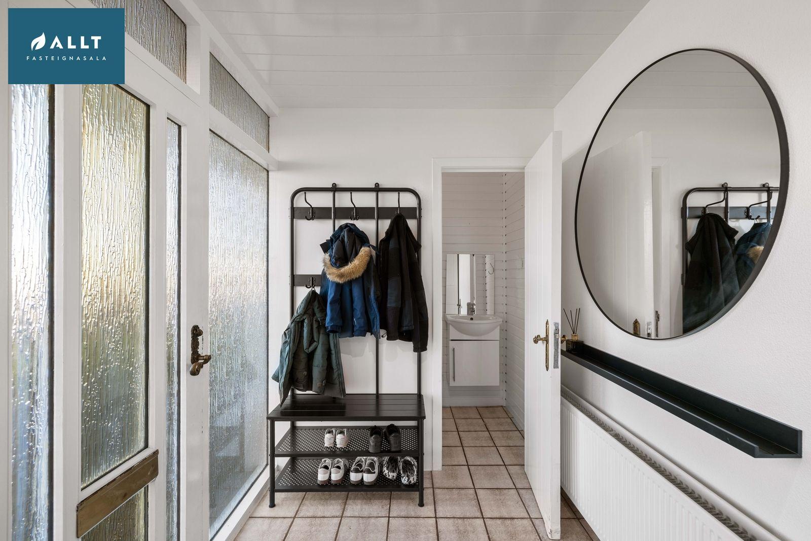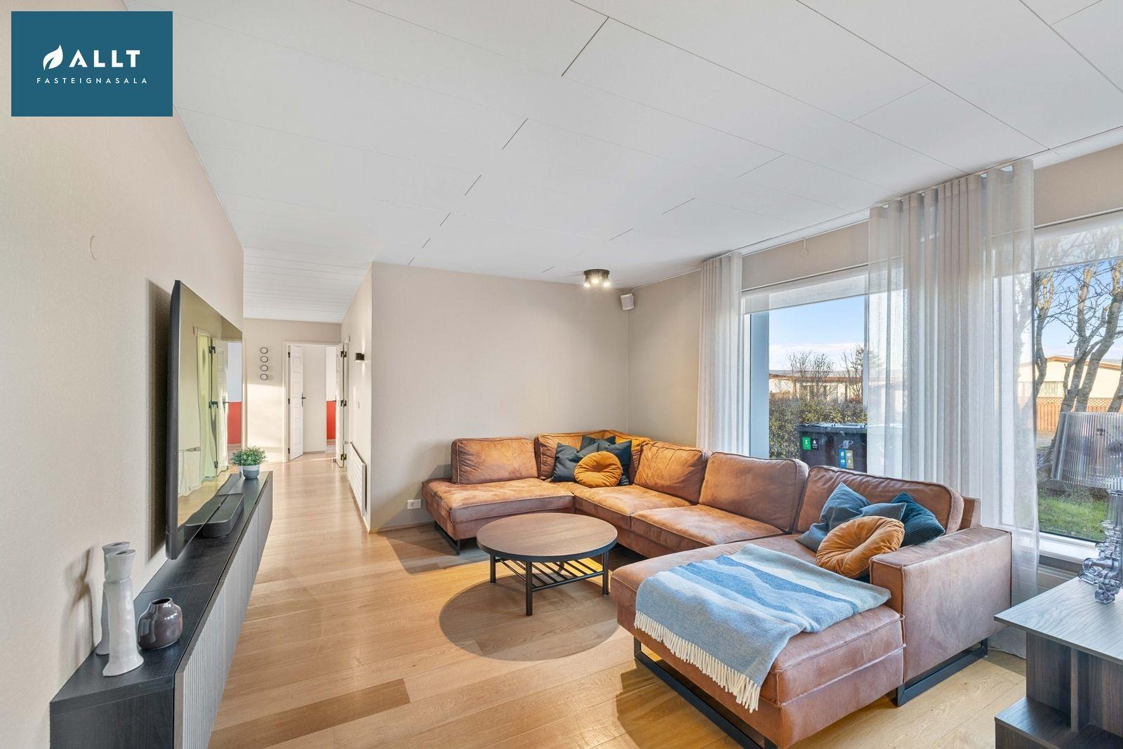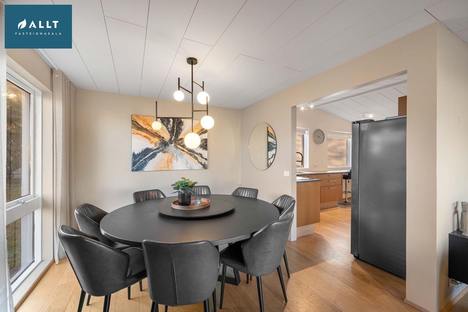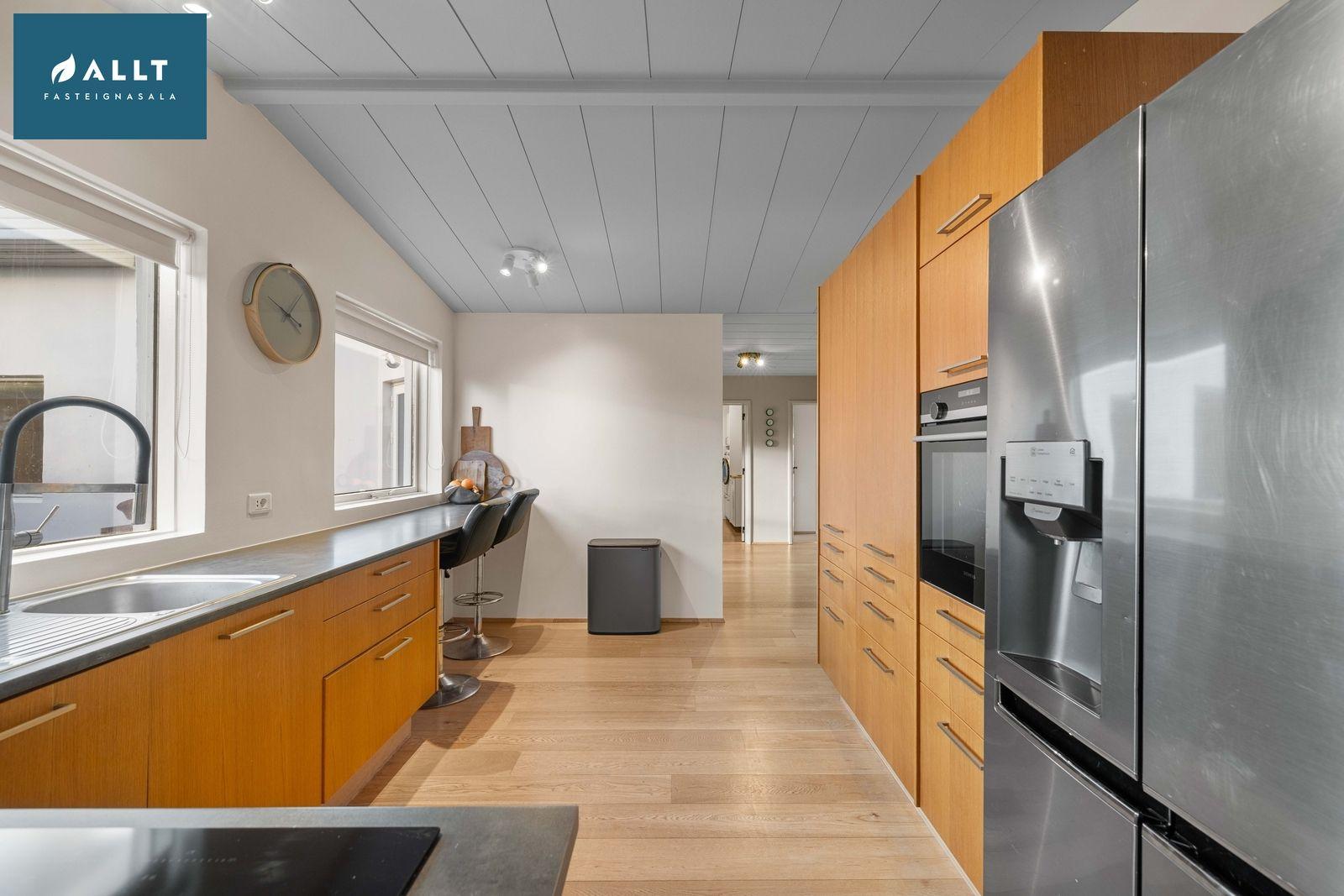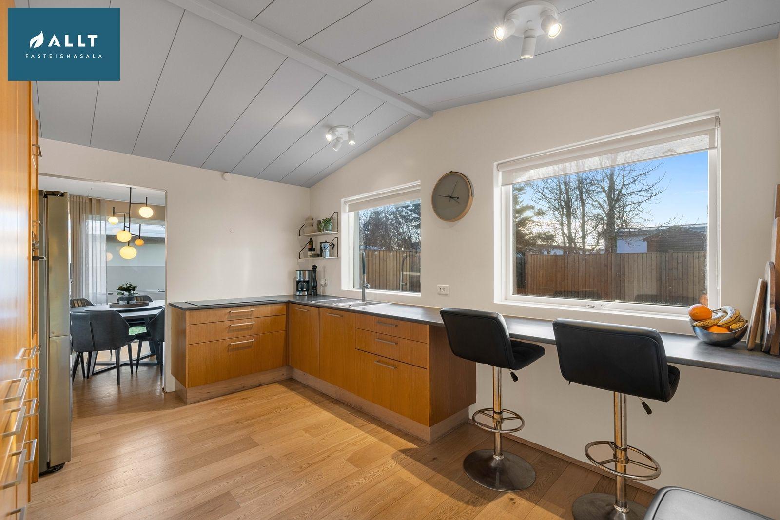 Eignin samanstendur af bjartri stofu, borðstofu, opnu eldhúsi, rúmgóðu holi með arni, þremur svefnherbergjum, tveimur baðherbergjum auk svefnherbergis og baðherbergis með sturtu í skúr alls fjögur svefnherbergi. Forstofa er rúmgóð og innaf er forstofusalerni. Aflokaður sólpallur er til suður með heitum potti. Þvottahús með geymslu innaf. Gott bílaplan.