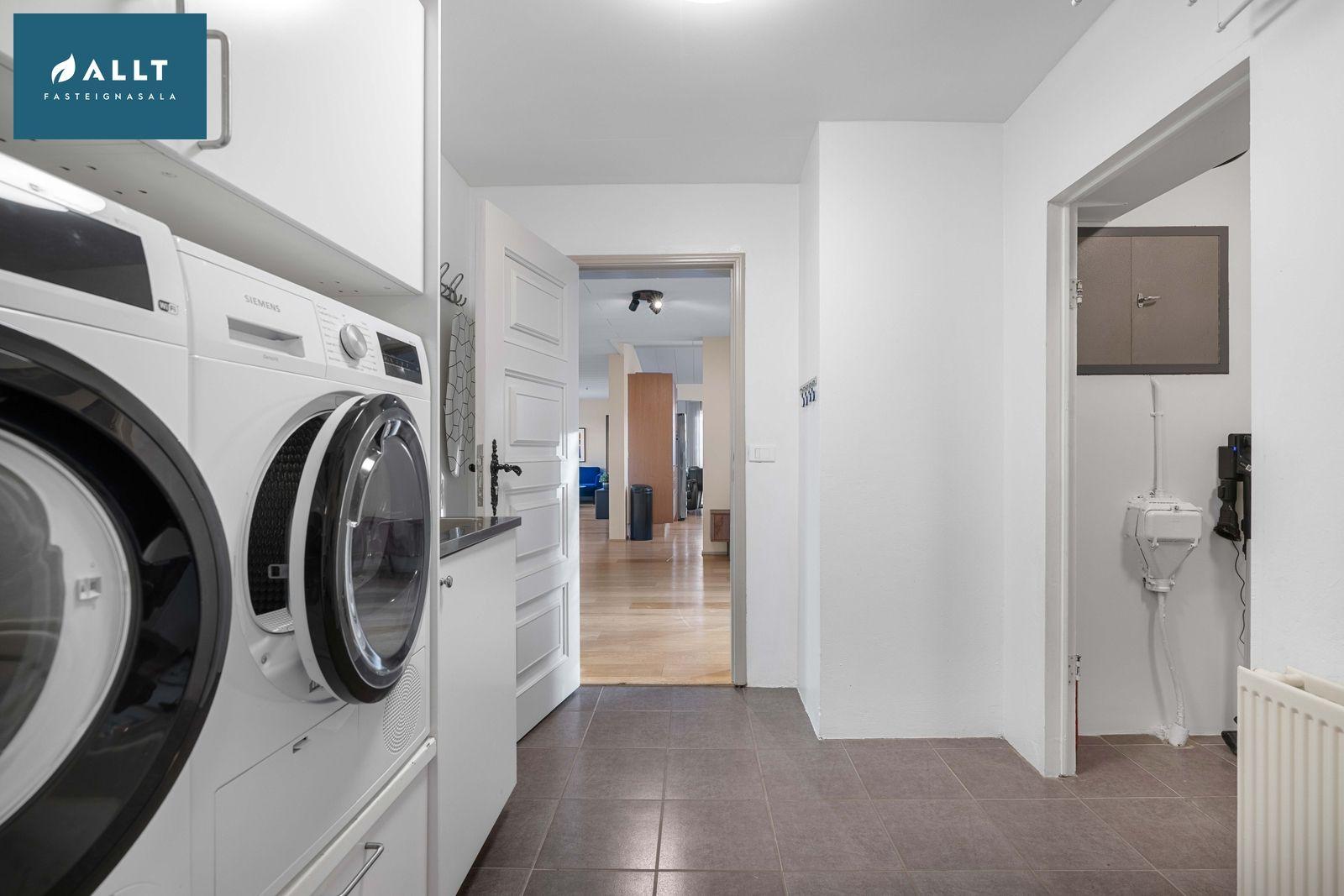 Þvottahús með góðri innréttingu og skolvask ásamt geymslu