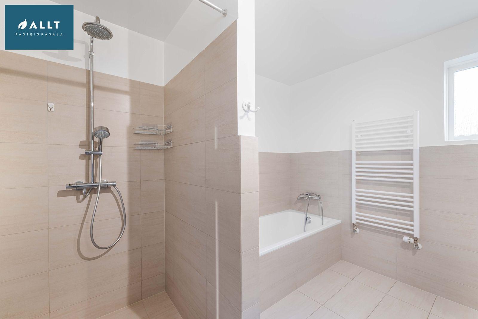 Baðherbergi flísalagt með walk in sturtu, baðkari, upphengdu salerni, skúffi innréttingu og spegla-ljósaskáp.