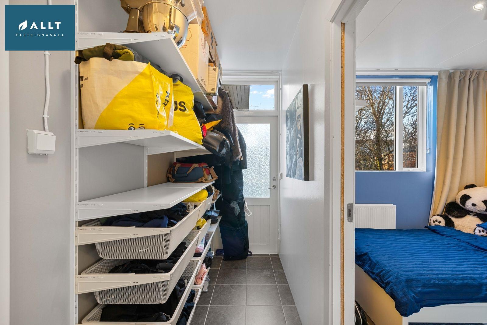 Bílskúr / íbúðarrými. Þar er búið að stúka af fjórða svefnherbergið, salerni með sturtu og geymslu í enda skúrs með bílskúrshurð. Innangengt í rýmið frá skoti bakatil.