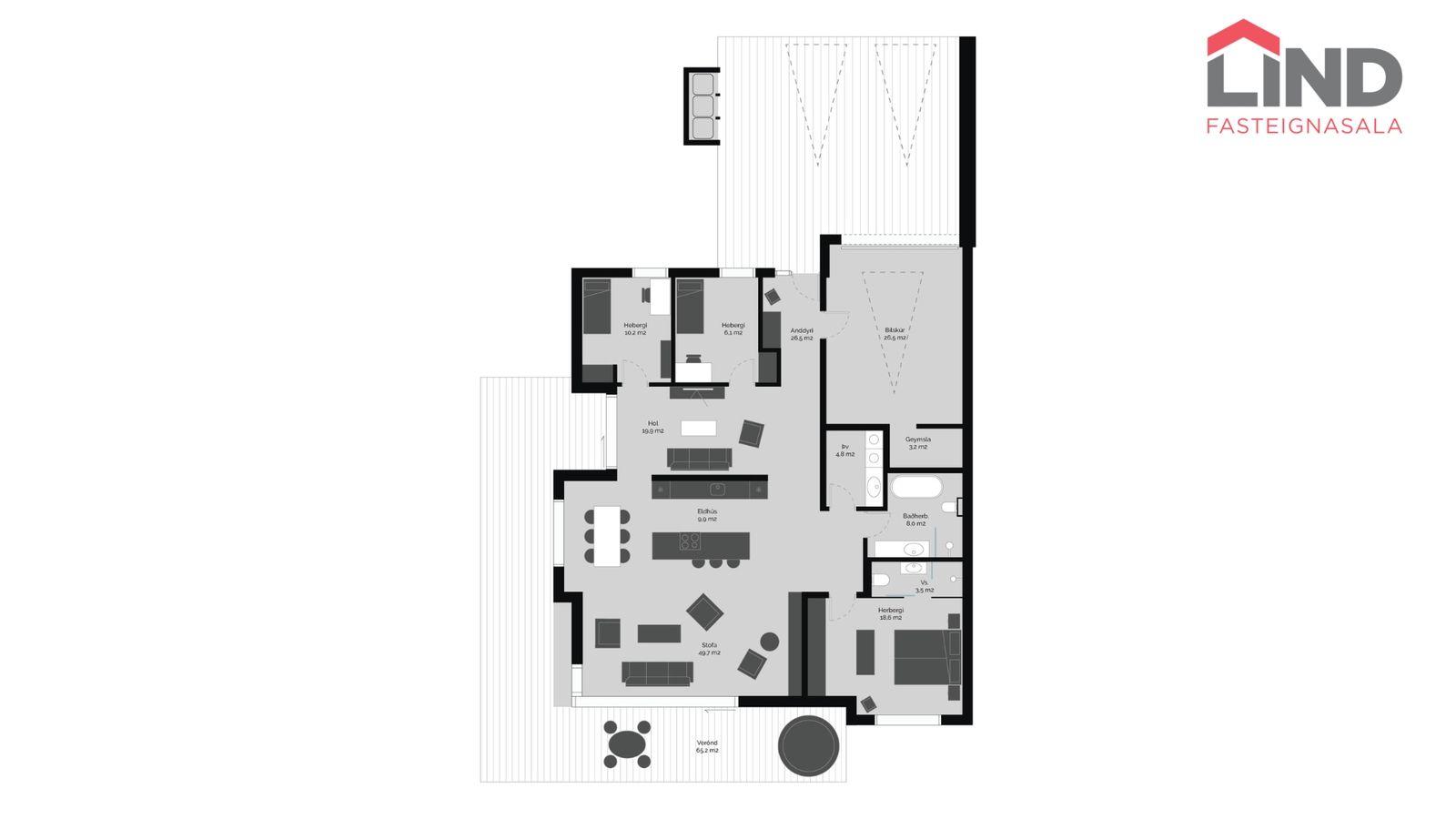 Íbúðin skiptist í forstofu, gang, sjónvarpshol, alrými sem er opið við eldhús og stofu/borðstofu þaðan er útgengt út á 65.2 fm verönd, 3 svefnherbergi, 2 baðherbergi, geymslu ásamt þvottahúsi.