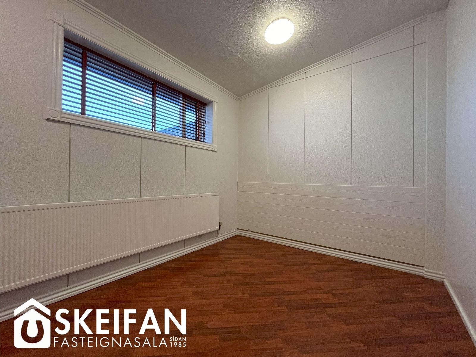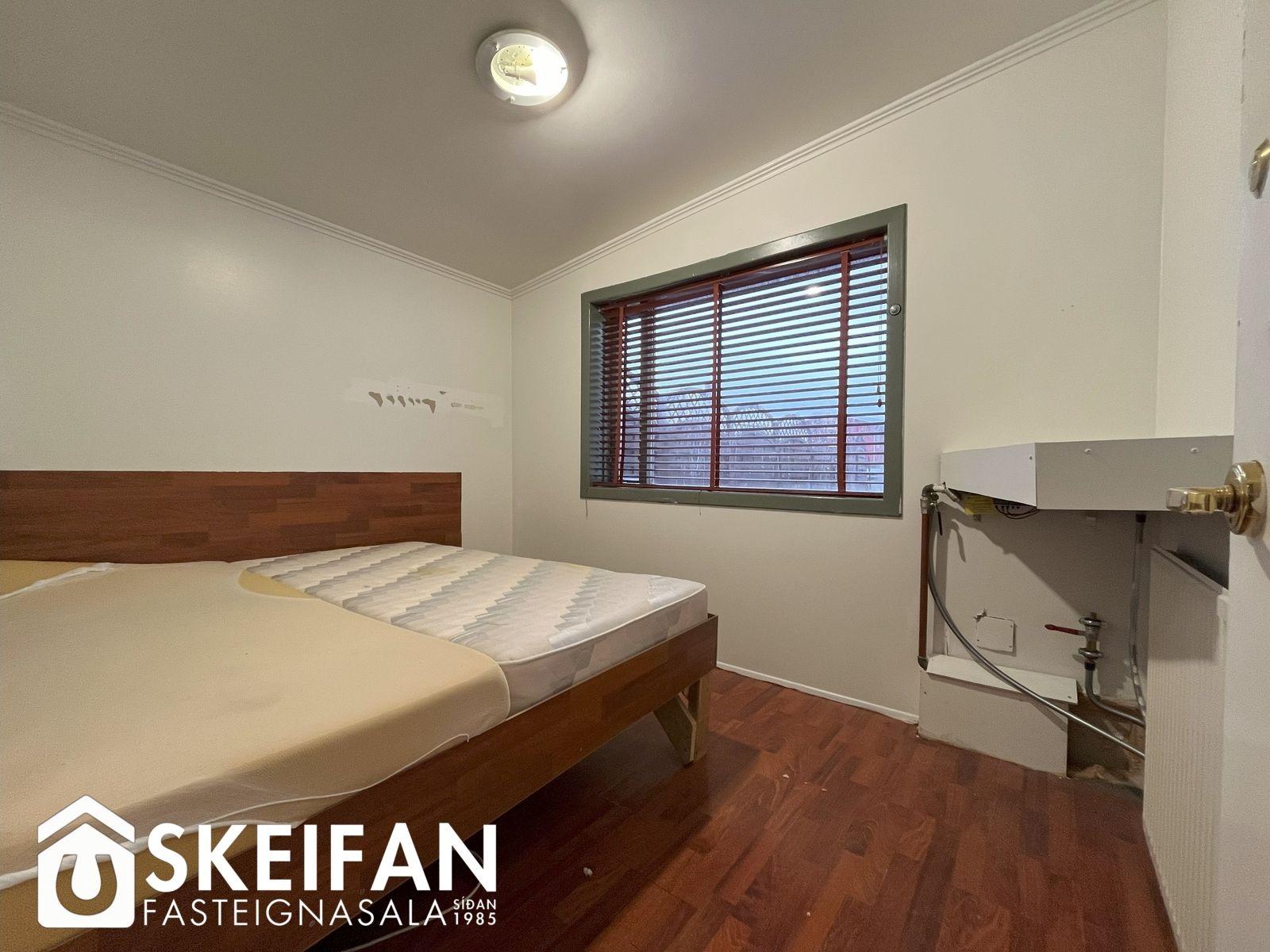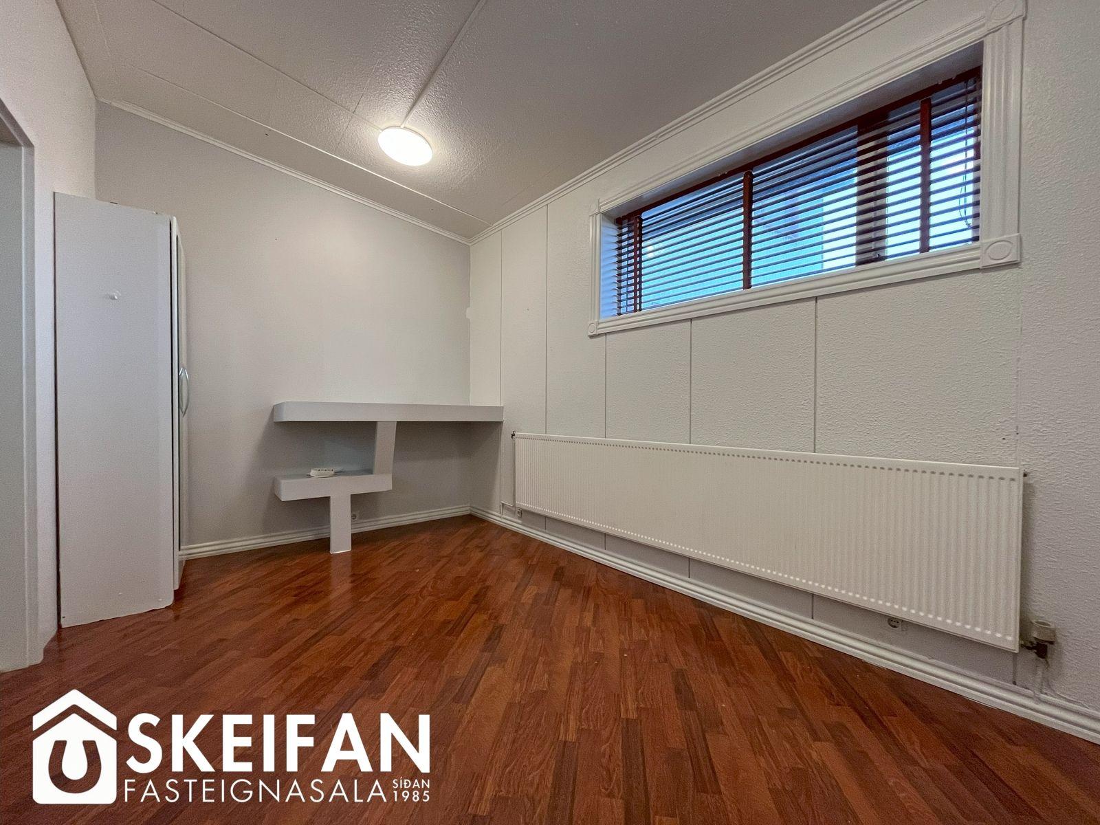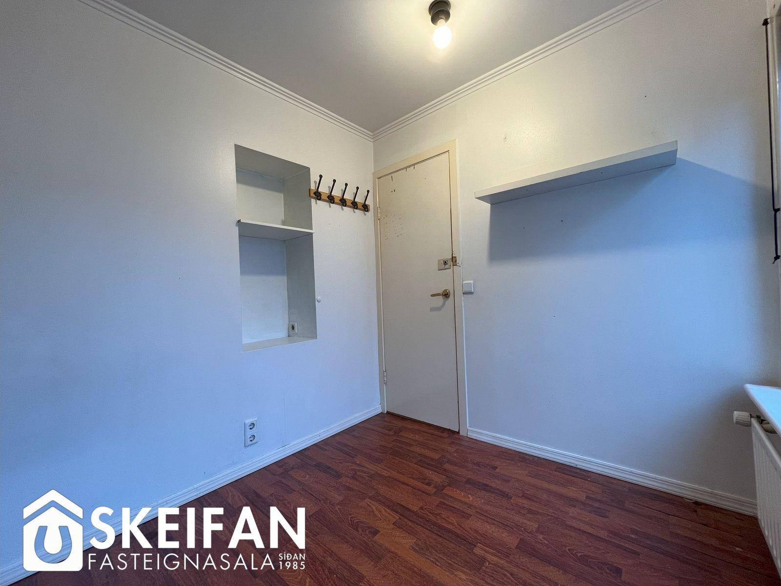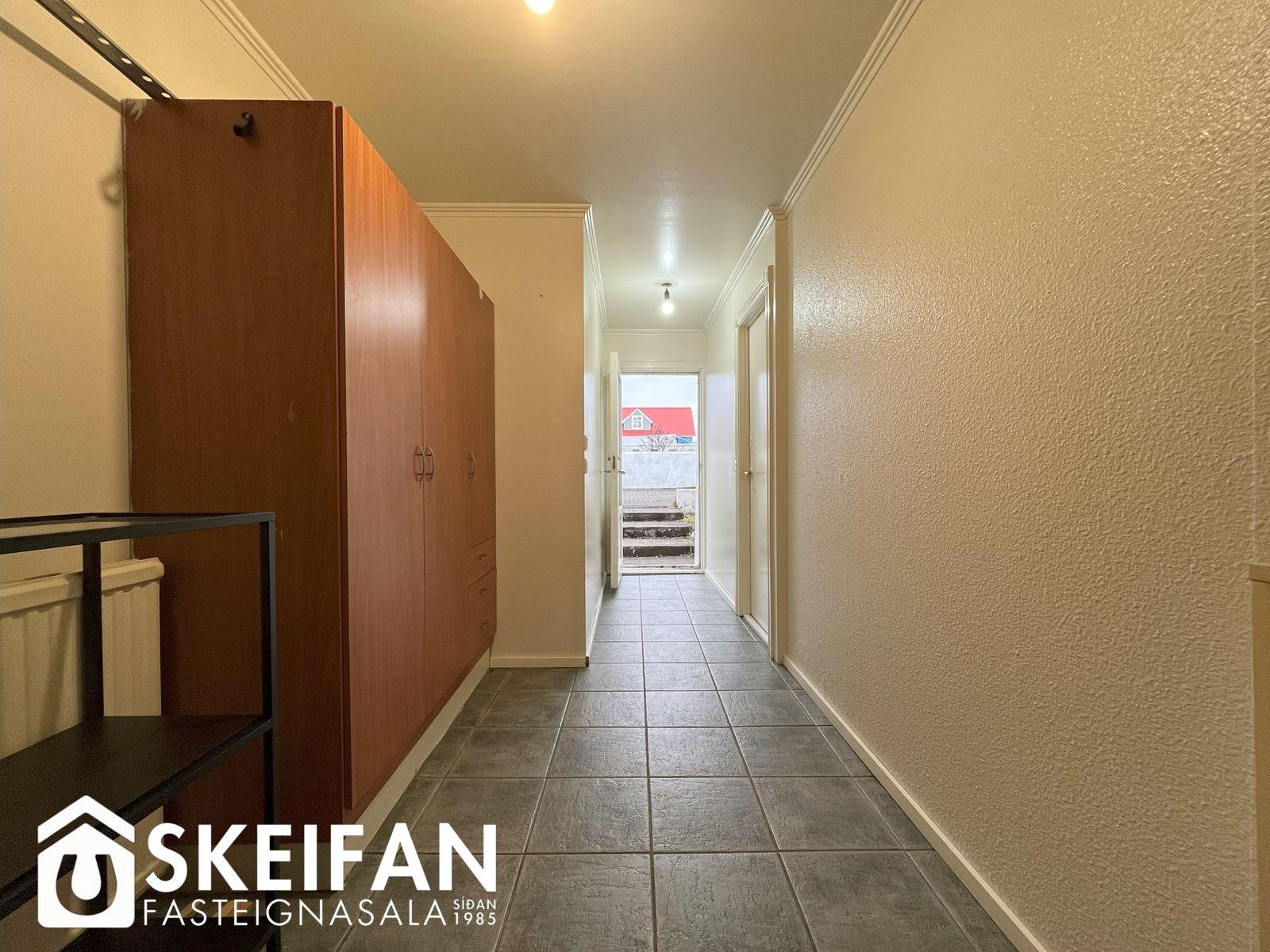 Nánari lýsing: Anddyri: Flísalagt með fataskáp. Forstofuherbergi: Parket á gólfi. 5,8 m² að stærð. Eldhús: Innrétting er máluð blá að hluta til. Ágætis skápapláss. Flísar á gólfi og á veggjum að hluta til. LED lýsing í lofti. Stofa/borðstofa: Parket á gólfi. Ágætis lofthæð. Svefnherbergi: Parket á gólfi. 8,5 m² að stærð. Svefnherbergi: Parket á gólfi og fataskápur. Baðherbergi/þvottaaðstaða: Svört innrétting, sturta, salerni og aðstaða fyrir þvottavél. Geymsla: 3,3 m² geymsla og stígi upp á geymsluloft sem er ekki inn í fermetratölunni.
