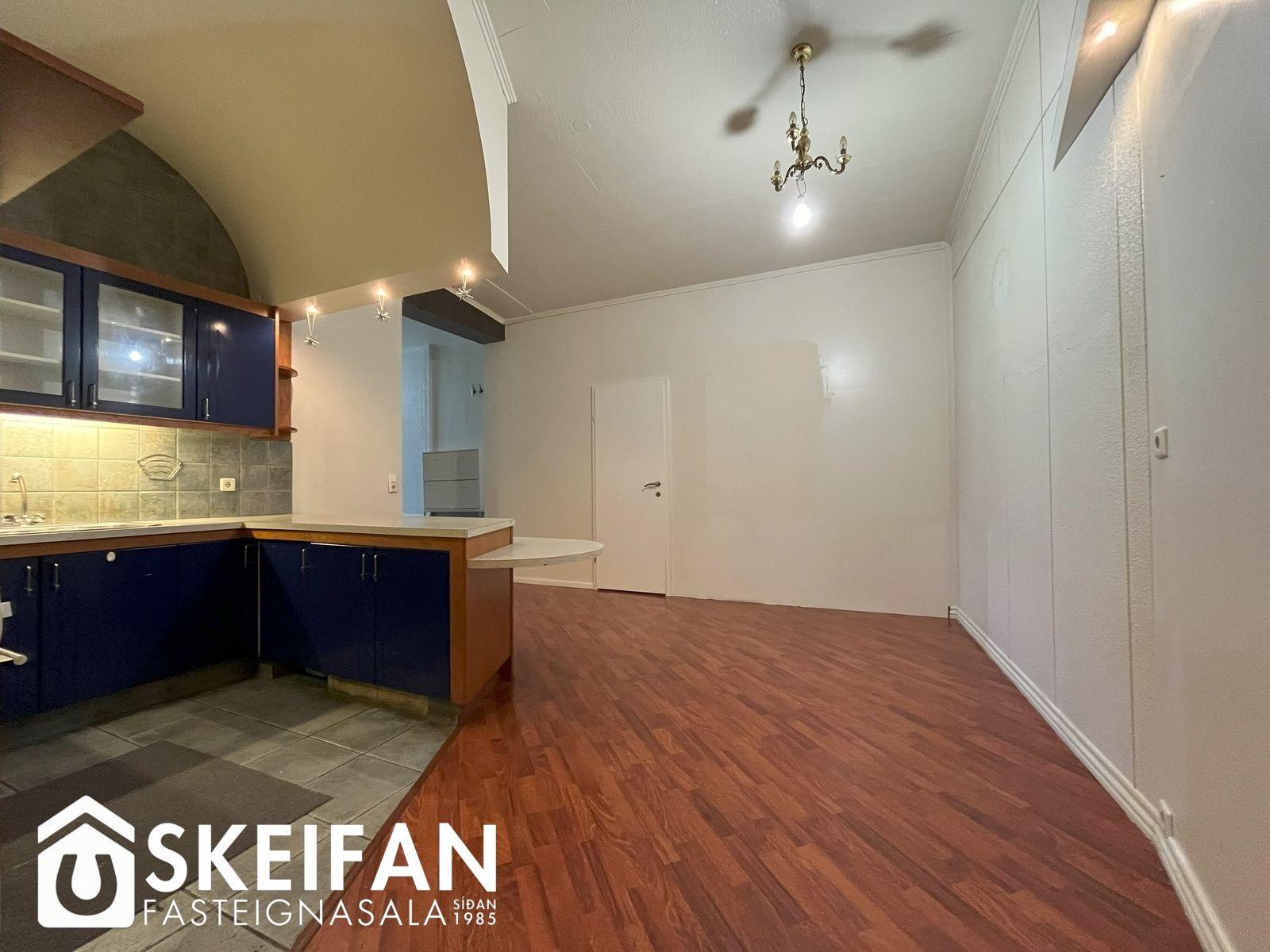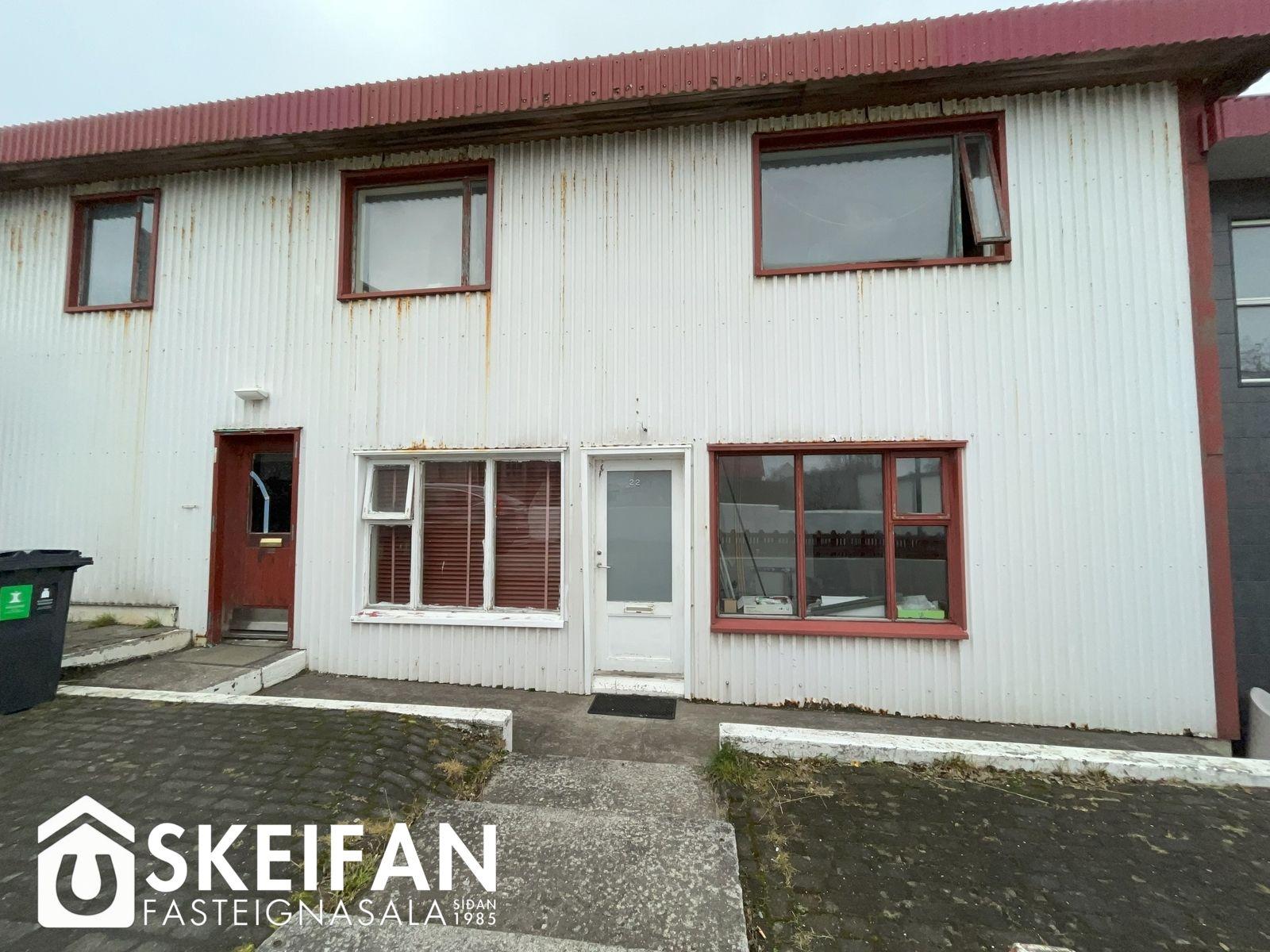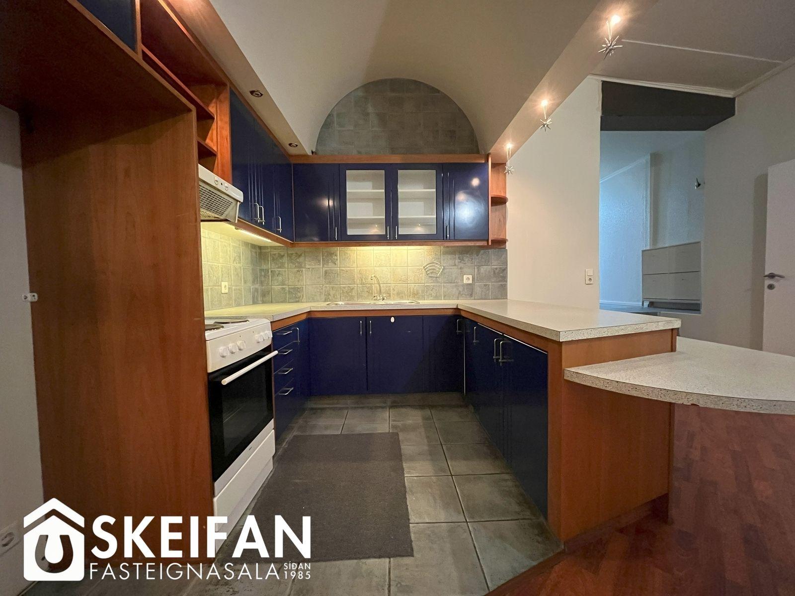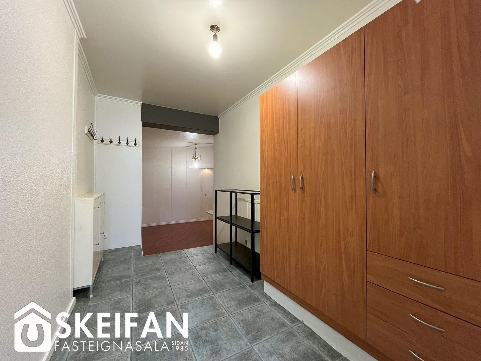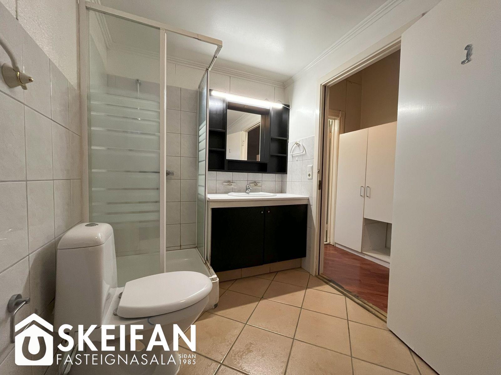 Nánari lýsing: Anddyri: Flísalagt með fataskáp. Forstofuherbergi: Parket á gólfi. 5,8 m² að stærð. Eldhús: Innrétting er máluð blá að hluta til. Ágætis skápapláss. Flísar á gólfi og á veggjum að hluta til. LED lýsing í lofti. Stofa/borðstofa: Parket á gólfi. Ágætis lofthæð. Svefnherbergi: Parket á gólfi. 8,5 m² að stærð. Svefnherbergi: Parket á gólfi og fataskápur. Baðherbergi/þvottaaðstaða: Svört innrétting, sturta, salerni og aðstaða fyrir þvottavél. Geymsla: 3,3 m² geymsla og stígi upp á geymsluloft sem er ekki inn í fermetratölunni.