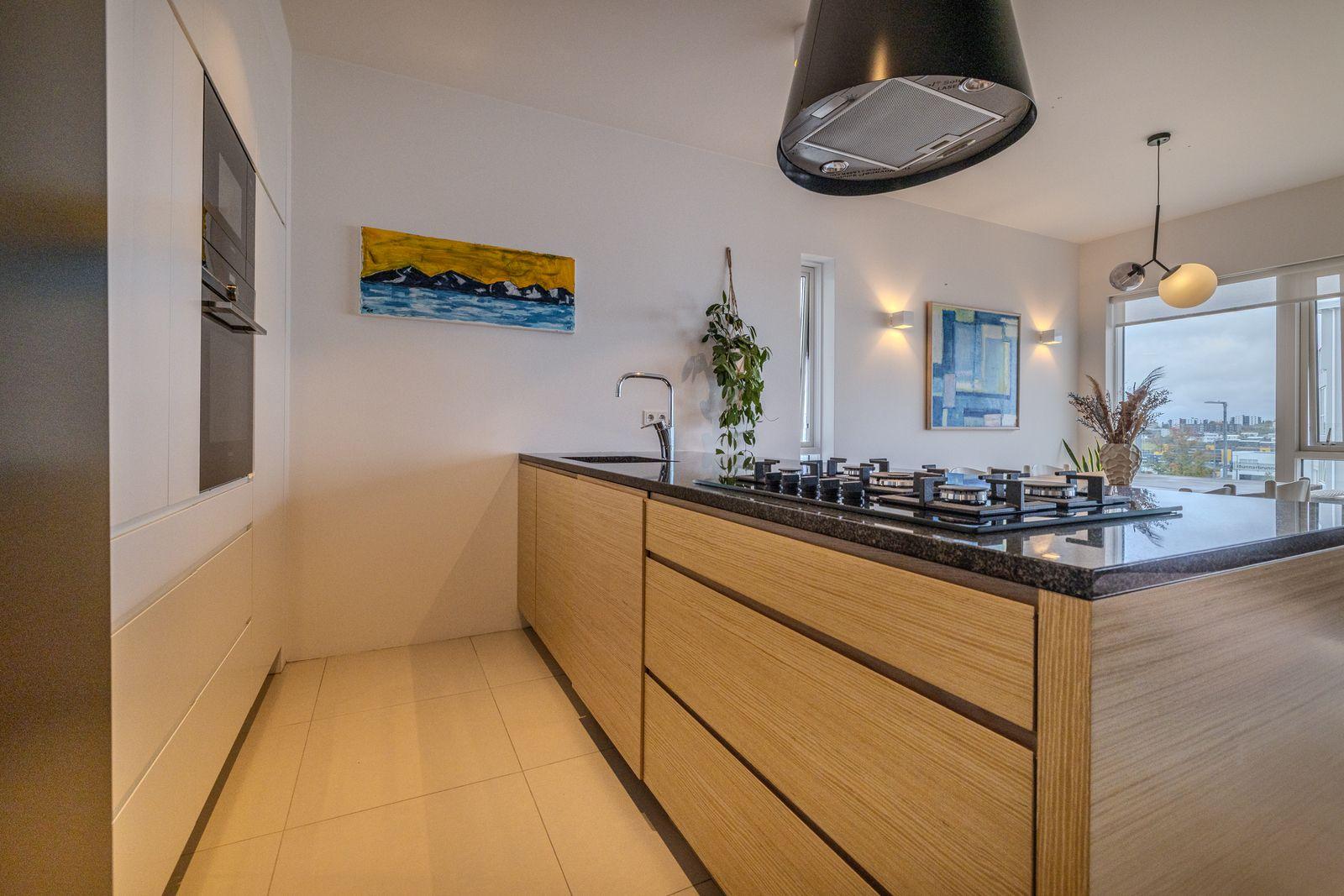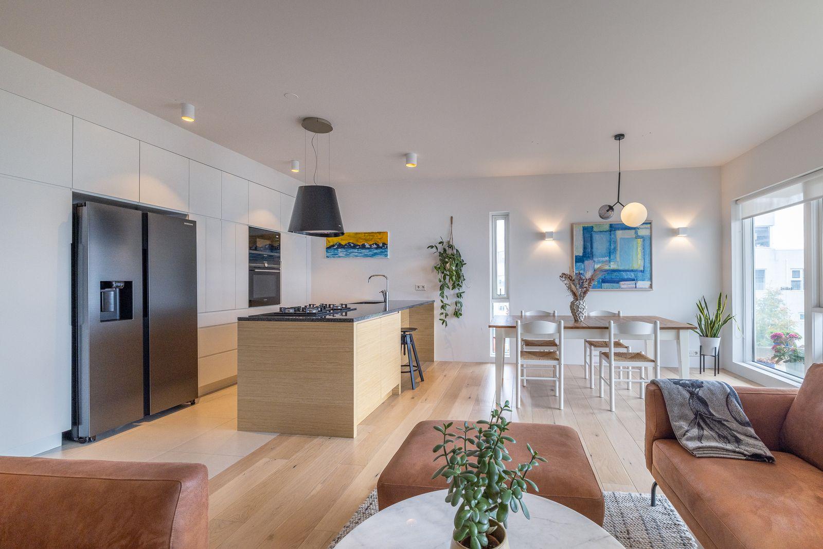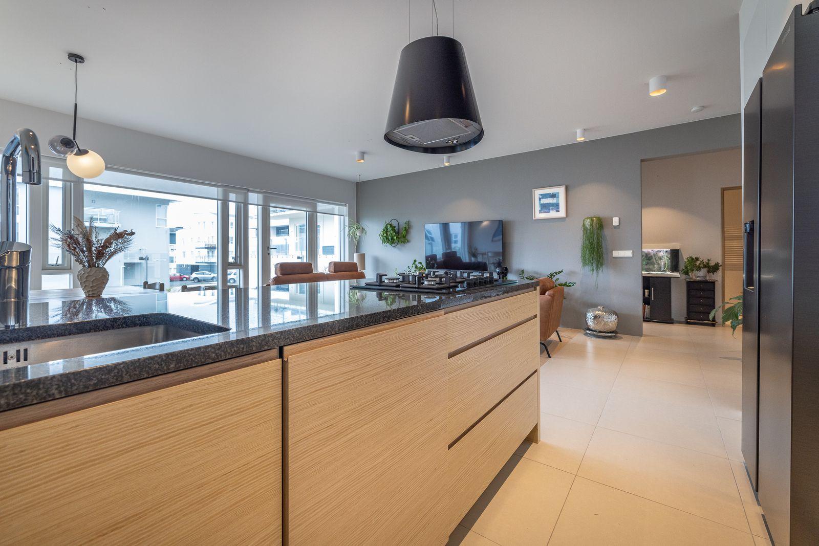Eldhús er rúmgott með stórri eyju og samanstendur af bæði hvítum háglans og eikar innréttingum með miklu skáparými og granít borðplötum, siemens ofn og örbylgjuofn fylgja og uppþvottavél. Gashelluborð er á eyju með háfi yfir, hægt að sitja við eyju.