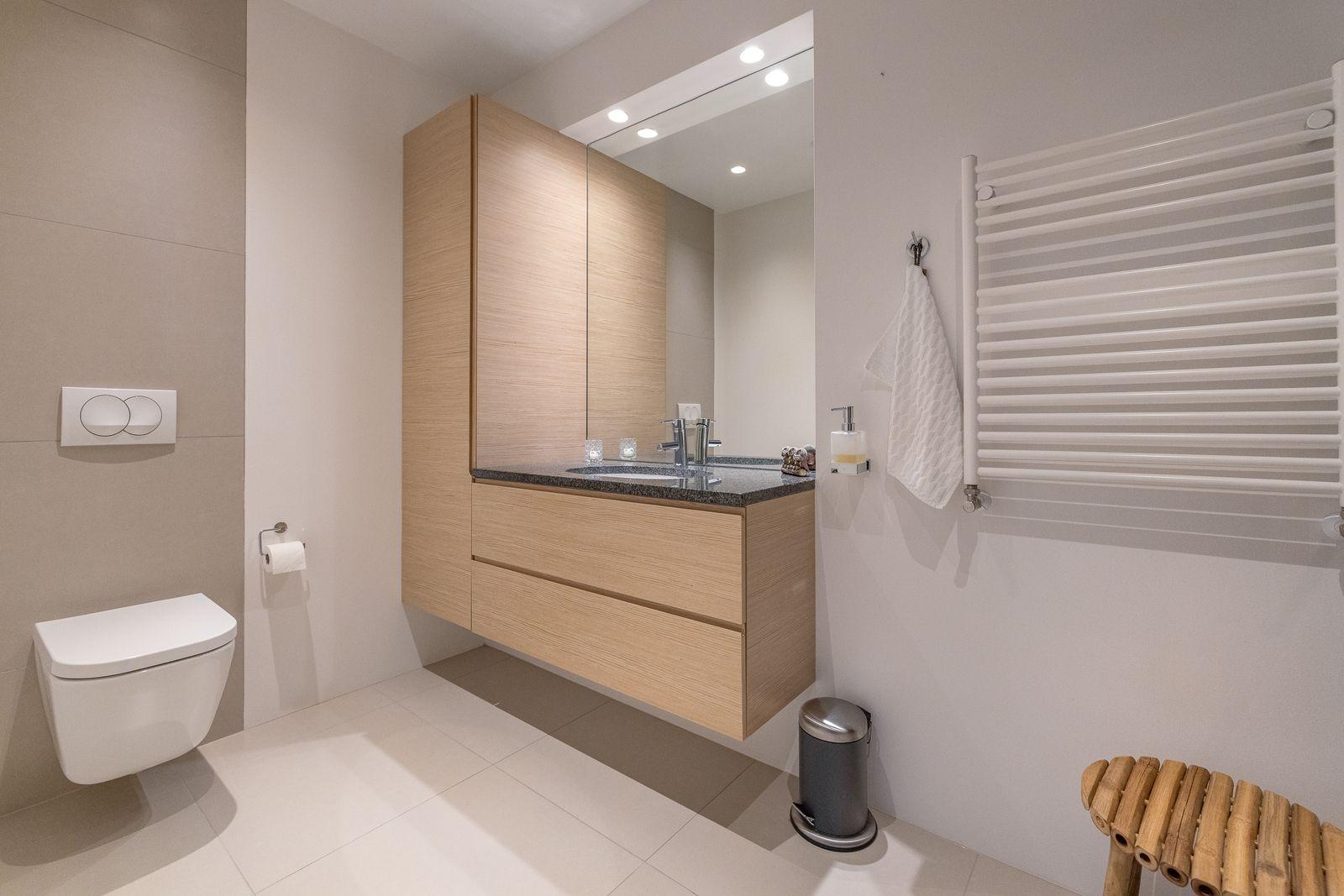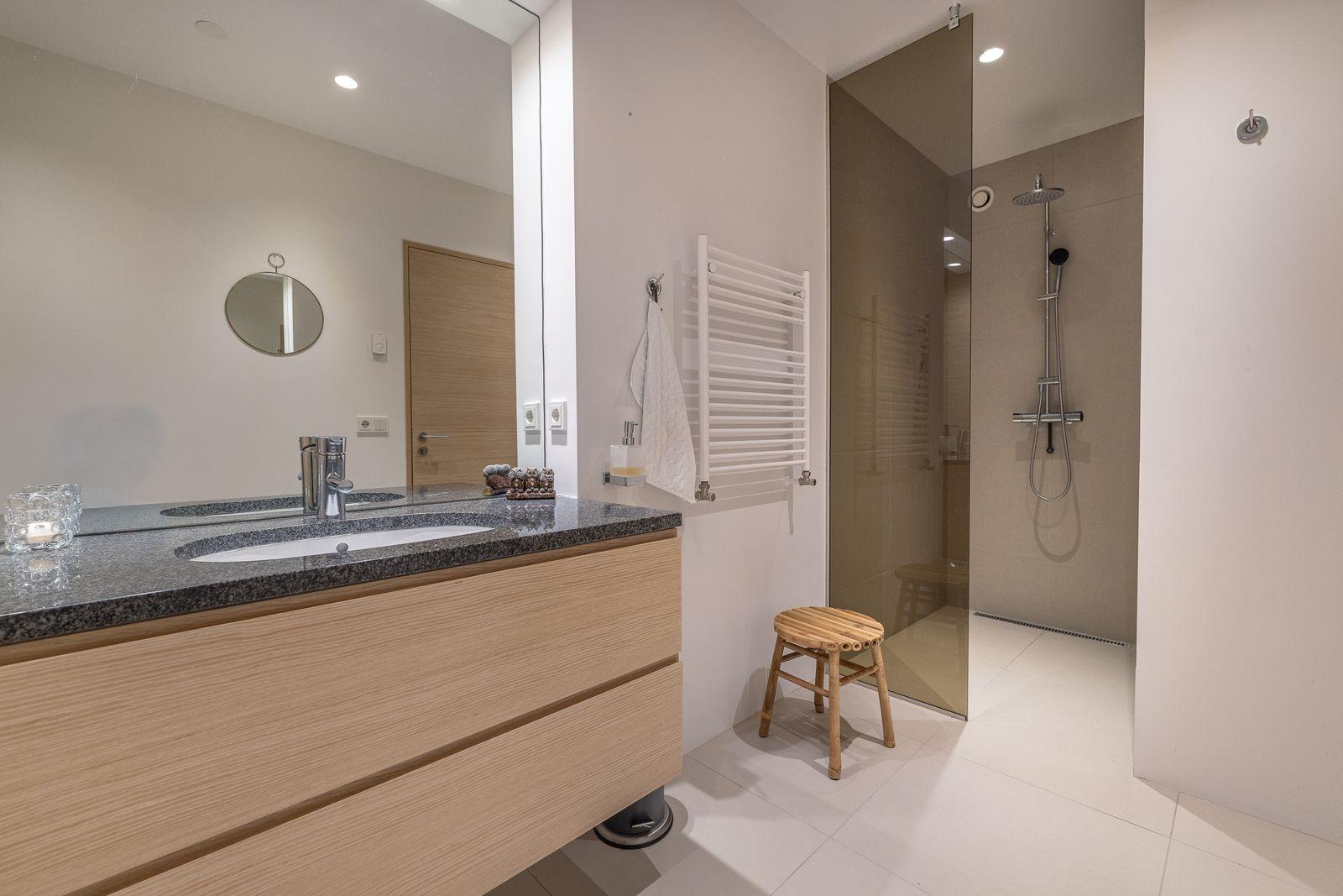 Baðherbergið er með innbyggðri lýsingu, upphengdu salerni, baðinnréttingu undir vaski með granít borðplötu, vegghengdum skáp, Walk-in sturtu og handklæðaofni.