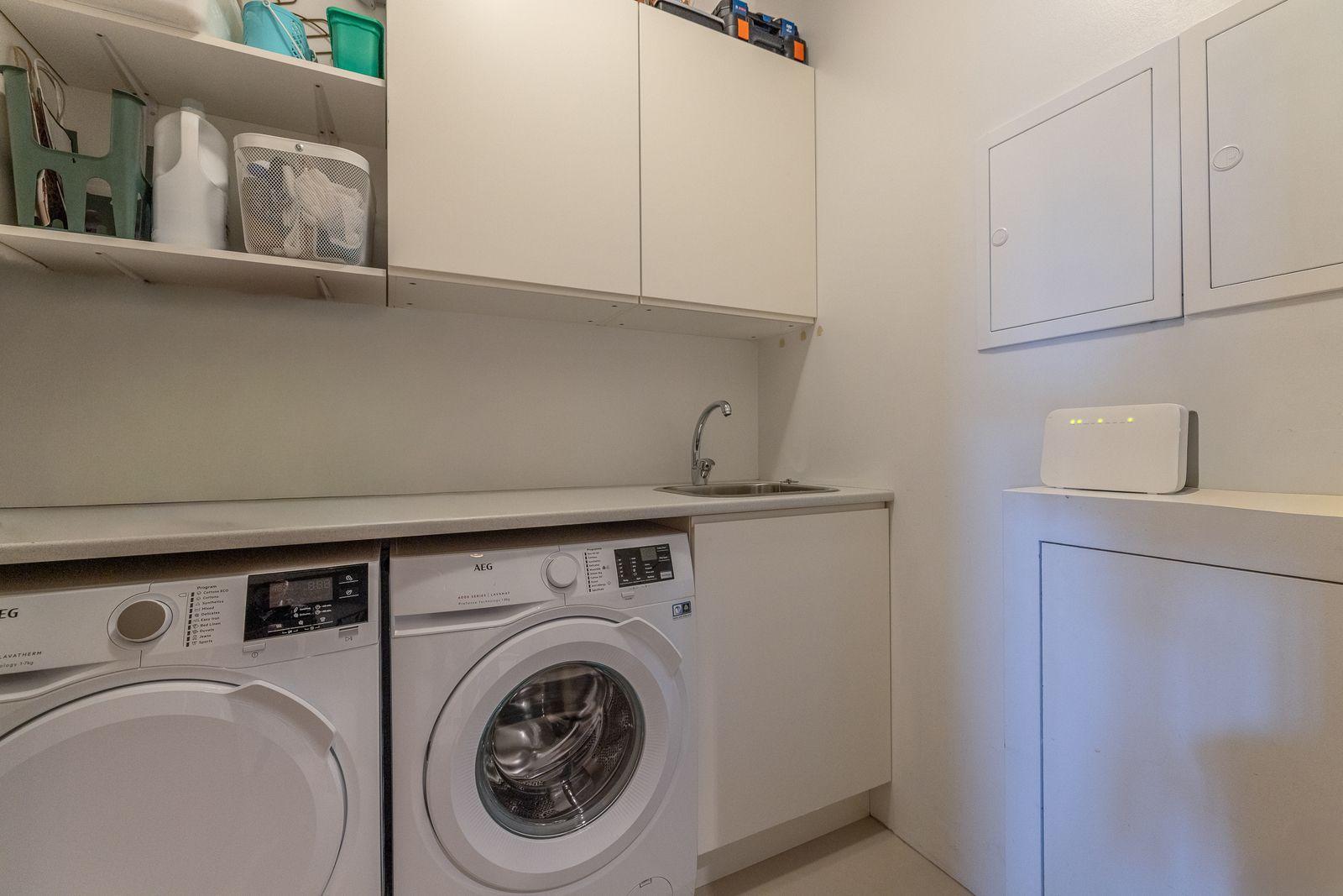 Þvottahús með hvítum innréttingum og skolvaski, tengi fyrir þvottavél og þurrkara, þar er gólfhitastýringin