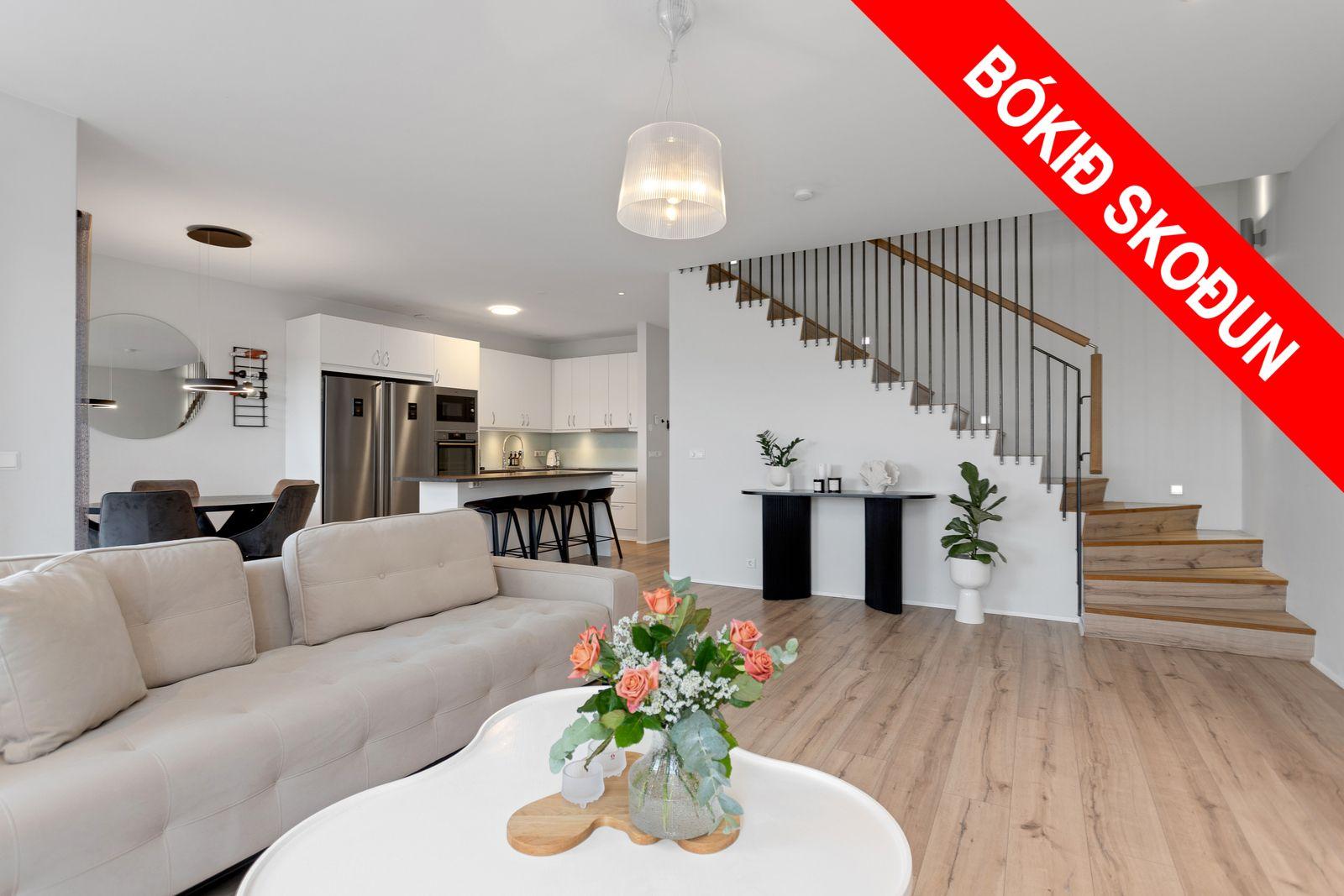 Steyptur parketlagður stigi upp á efri hæð hússins með fallegu járnhandriði og innfelldri lýsingu í vegg við stigaþrep.Efri hæð -Sjónvarpshol/ gangur: Komið er upp í sjónvarpshol sem er nýtt í dag sem hol. Góð lofthæð er í holi og gangi með innfelldri led lýsingu. Parket á gólfi.