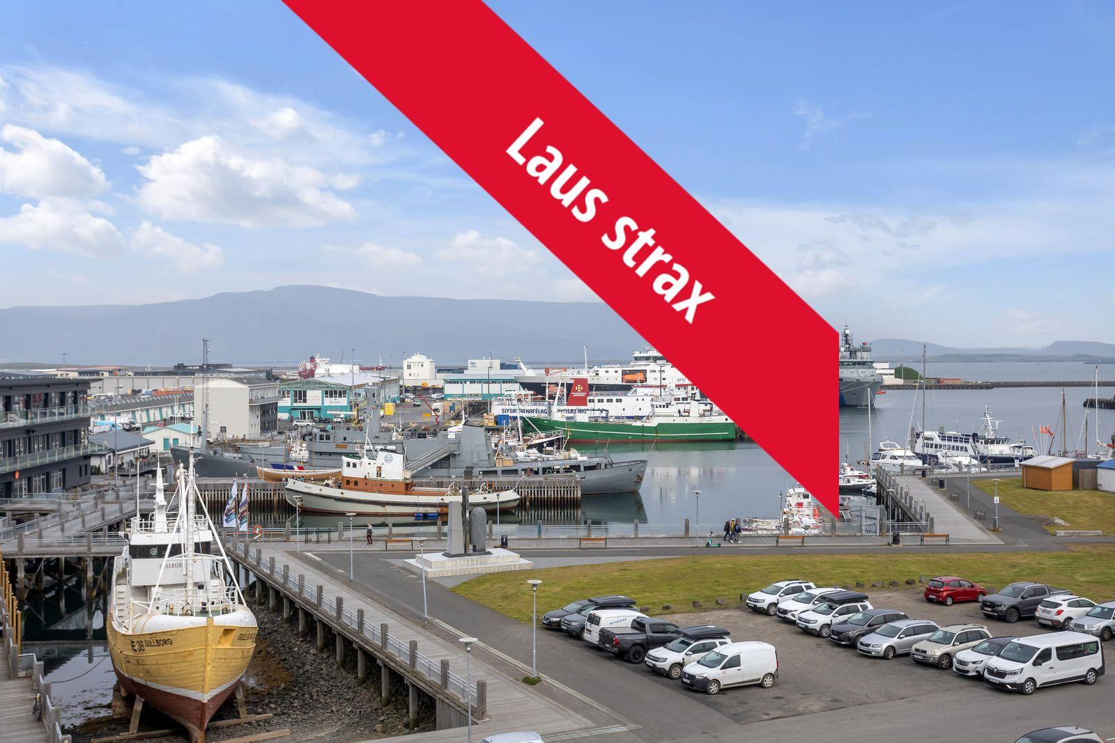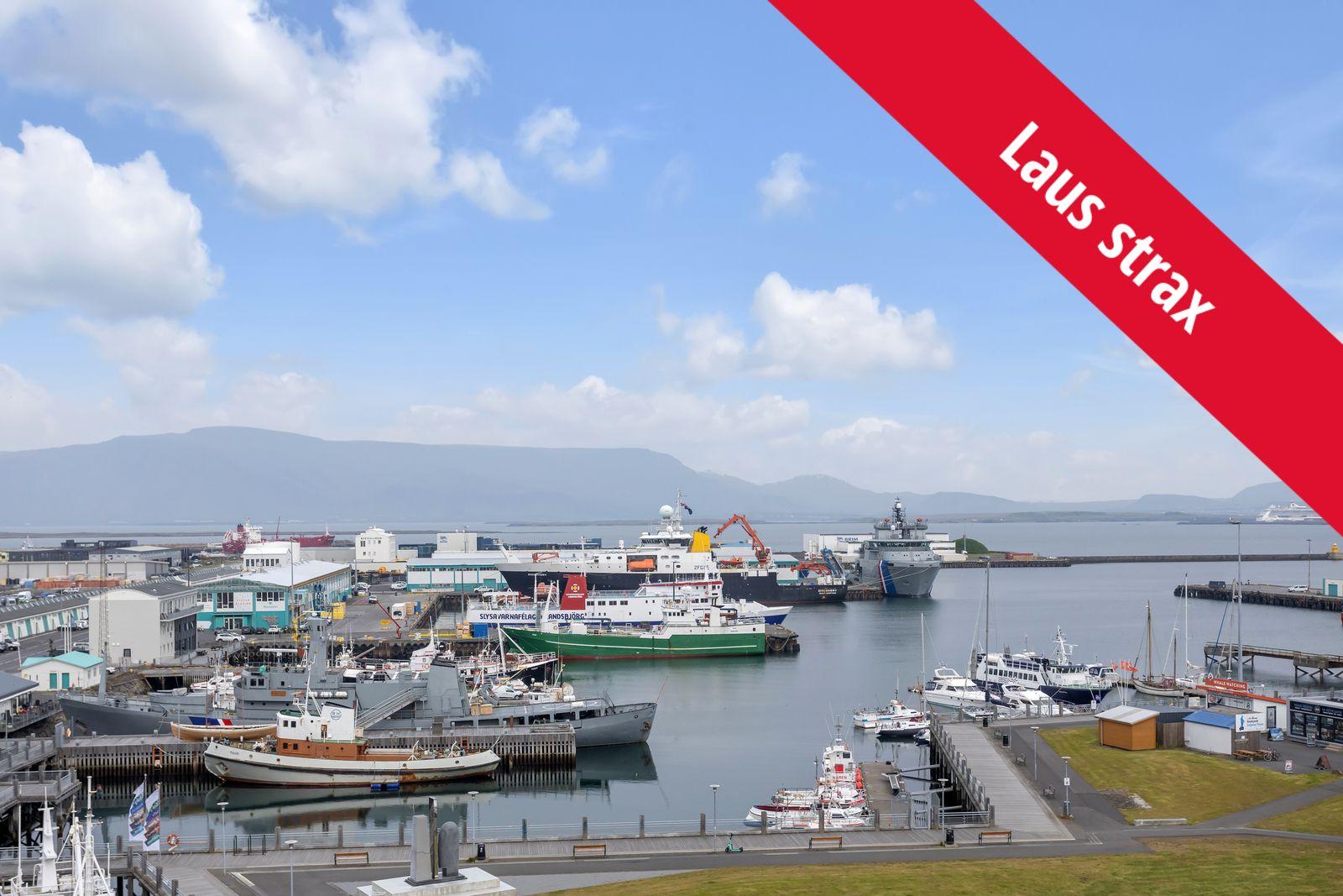 Stofa, borðstofa og eldhús : er í opnu og björtu alrými með gólfsíðum gluggum, útsýni og útgengi út á svalir. Fallegt sjávar- og fjallaútsýni að gömlu höfninni og víðar.