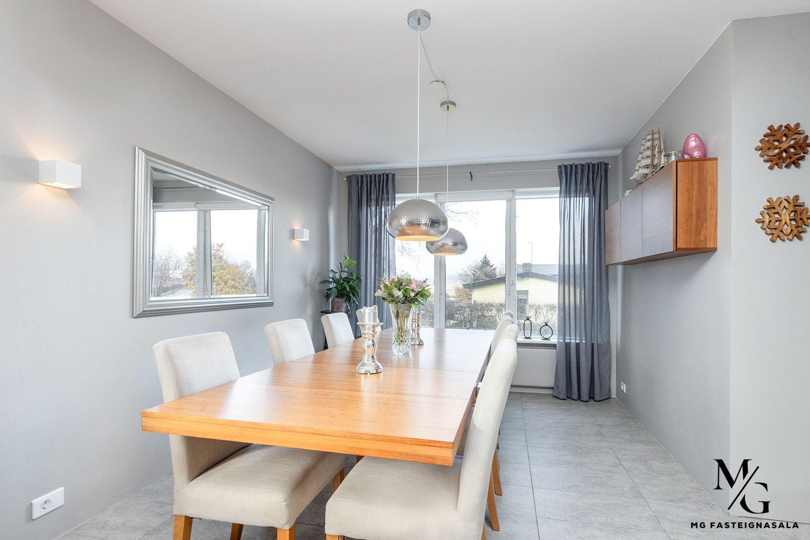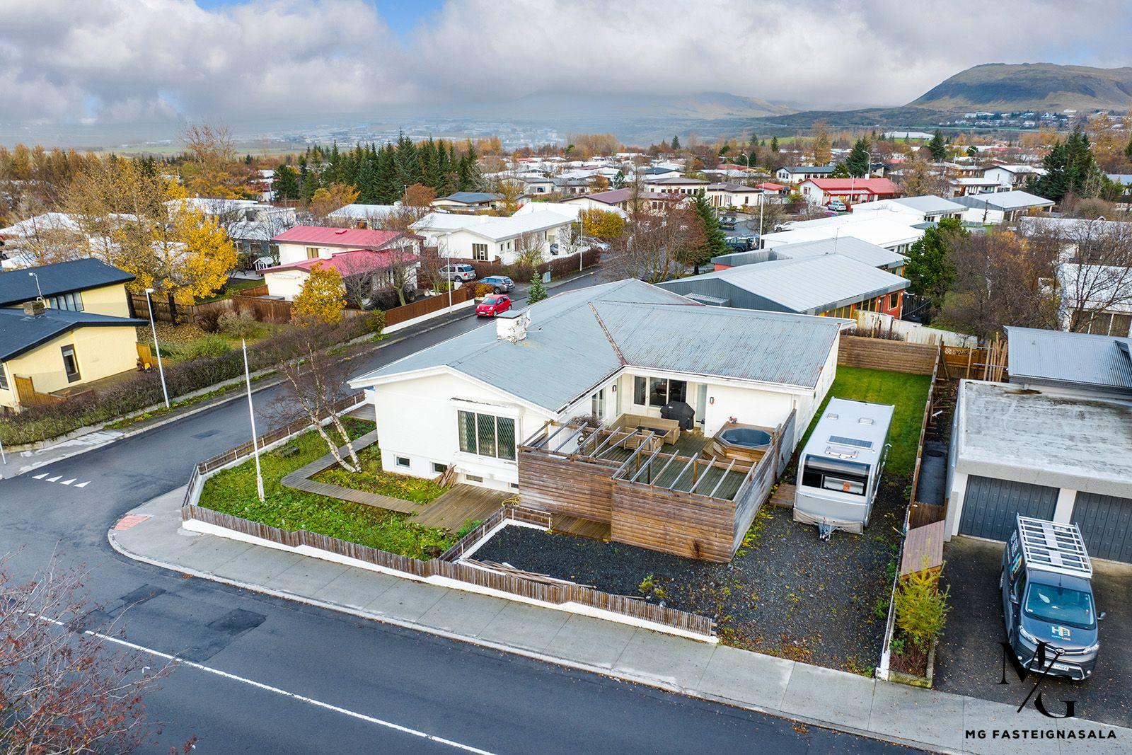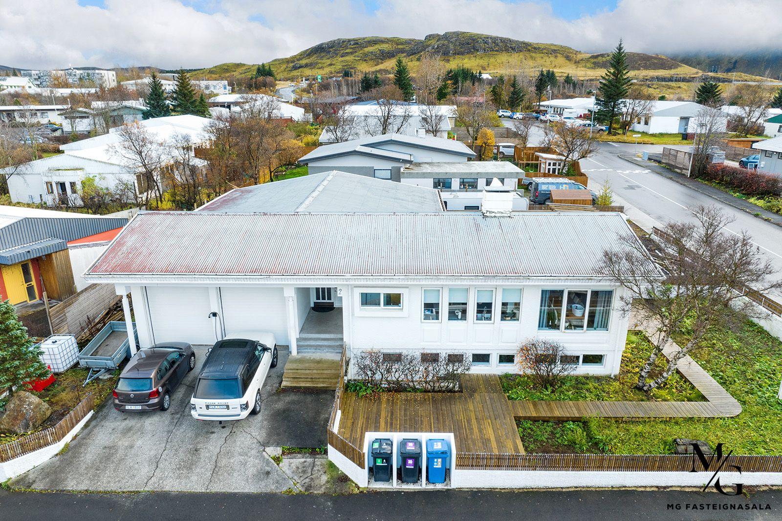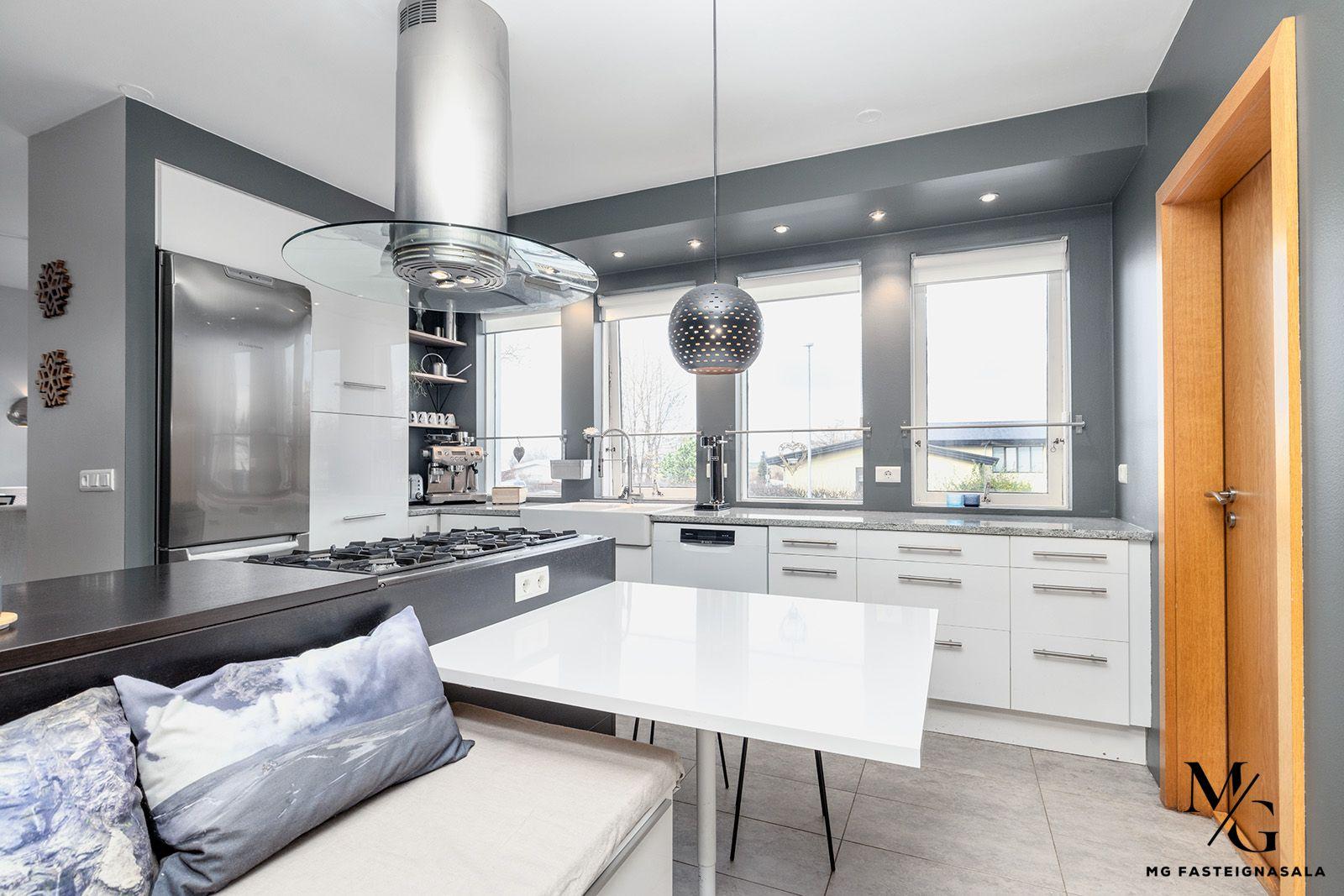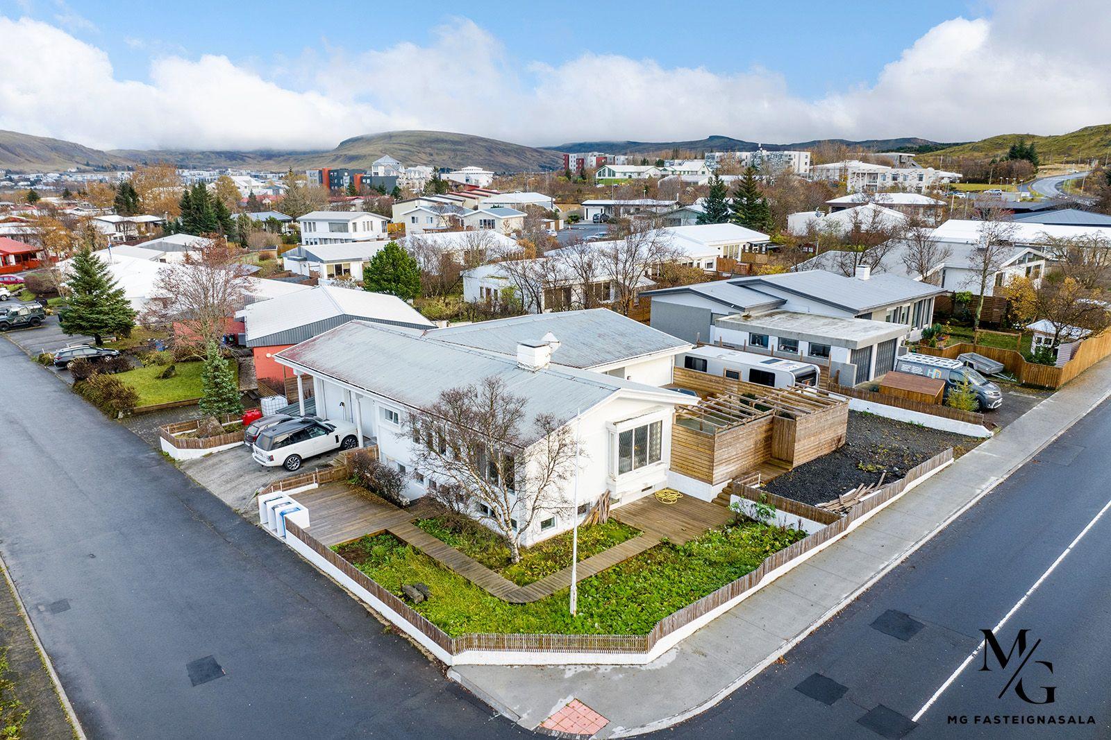 Bjart og vel skipulagt 319,6 fm einbýlishús á tveimur hæðum með tvöföldum bílskúr. Húsið er teiknað af Kjartani Sveinssyni. Tveggja herbergja íbúð með sér inngangi á neðri hæð. Steypt bílaplan með rafhleðslutengi. Húsið stendur á hornlóð fremst í götu með fallegum skjólgóðum garði á eftirsóttum stað í Mosfellsbæ. Húsið hefur verið töluvert endurnýjað.