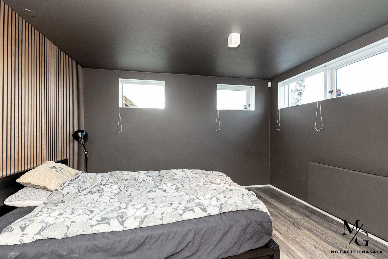 Herbergi I: Herbergi þar sem stúkað hefur verið af lítið fataherbergi. Parket á gólfi.