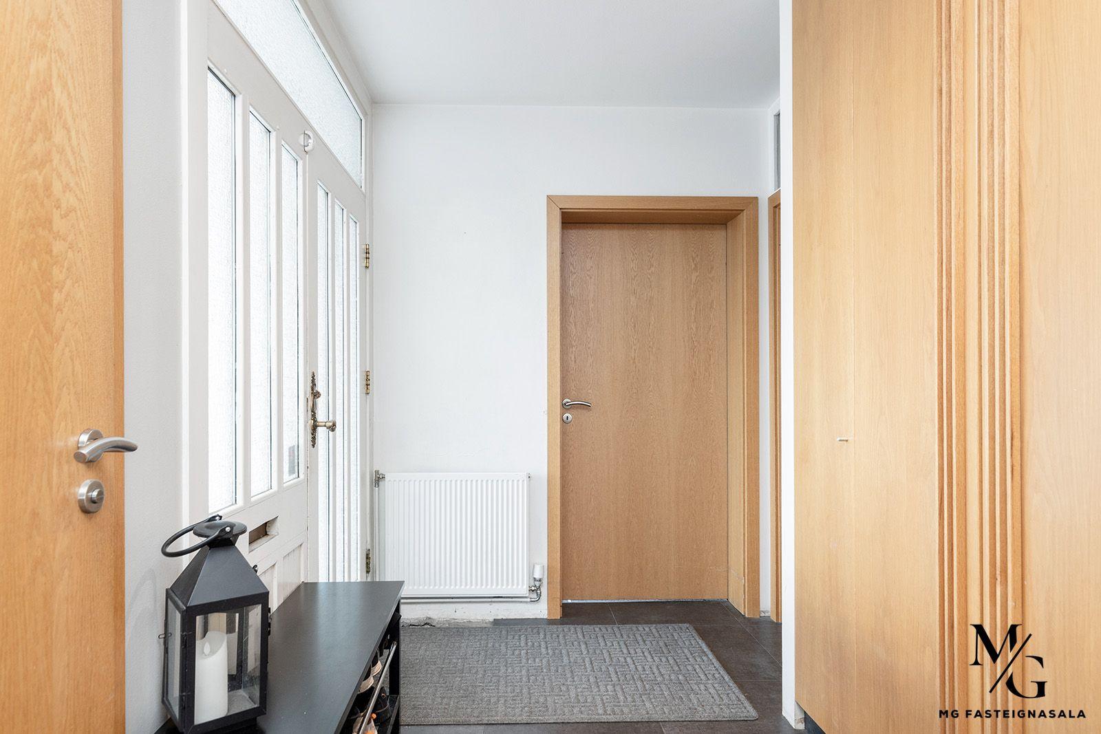 Forstofa: Flísalögð með stórum fataskáp. Úr anddyri er innangengt í bílskúr og niður á neðri hæð hússins.
