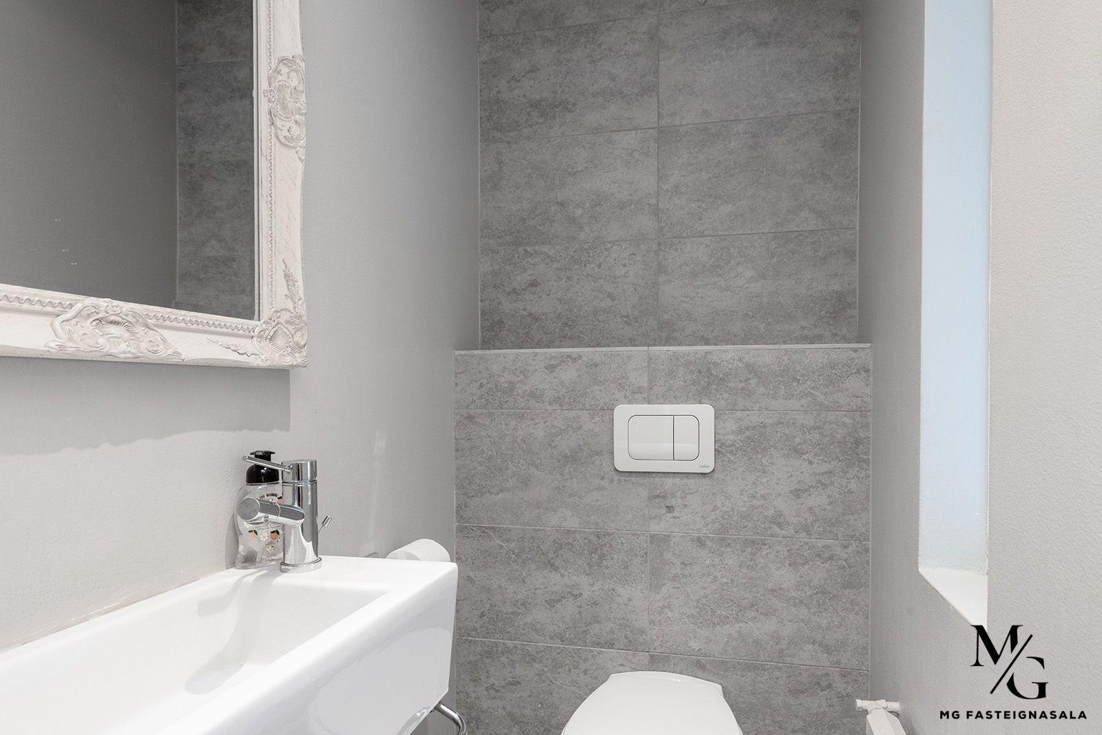 Gestasalerni: Flísar á gólfi og veggjum. Upphent salerni.