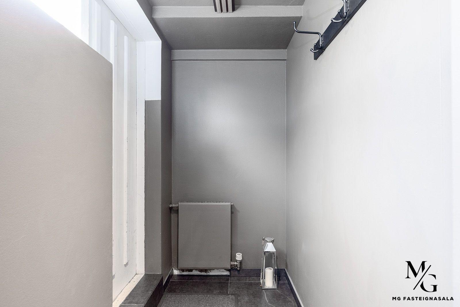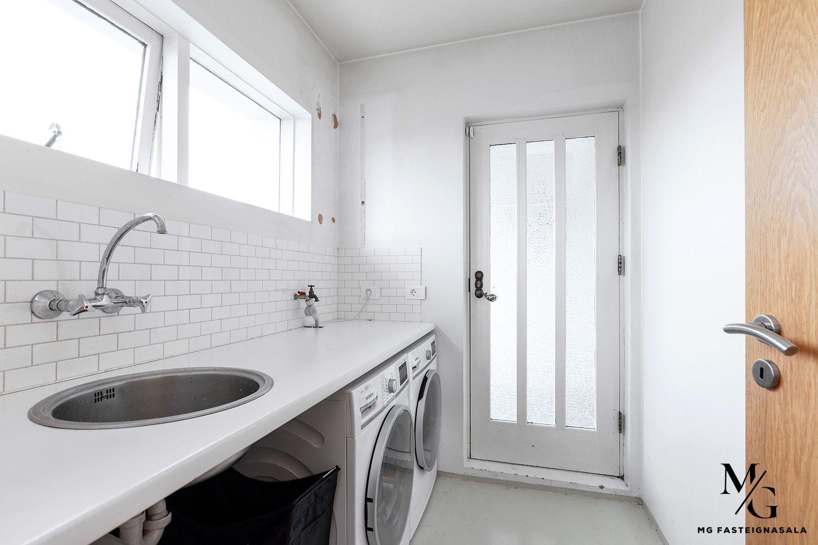 Þvottahús: Inn af eldhúsi með útgengi út á aðkomustétt. Innrétting fyrir þvottavél og þurrkara, vaskur í borði. Búr opið inn af þvottahúsi.