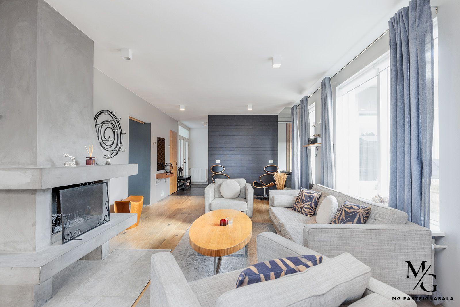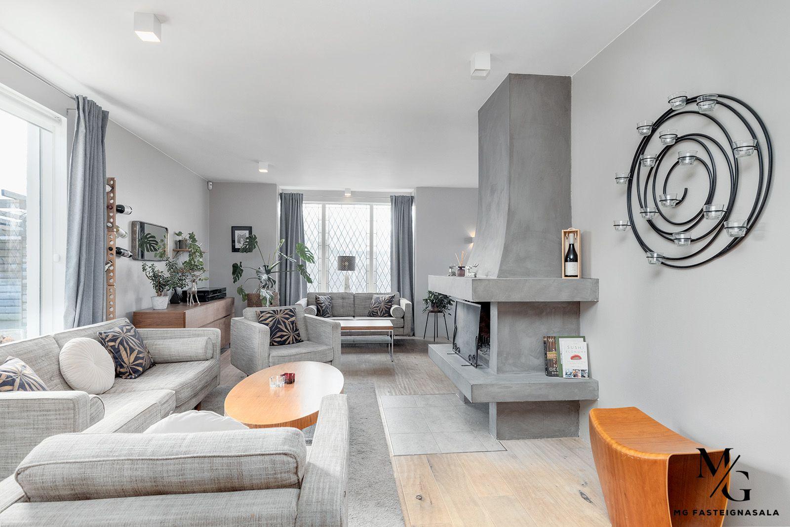 Stofa: Björt og rúmgóð stofa með glæsilegum arni. Parket á gólfi.
